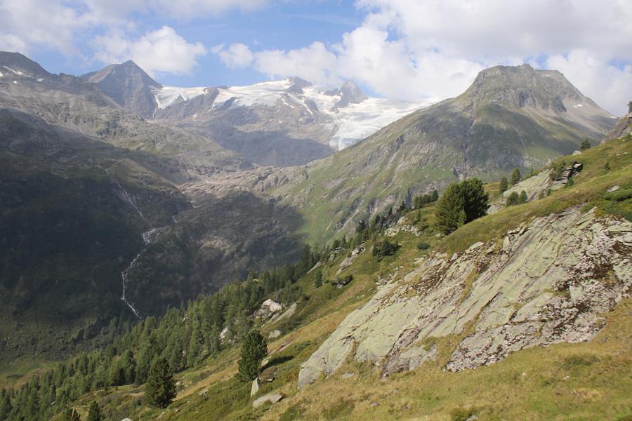 Langsam steigt es an, dafür wird Distanz bewältigt. Humprey nützt die Teleskop Stöcke. Die Massige wie Markante Dreiherrnspitze mit ihrem langgezogenen Grat besticht. Gewaltig der Gletscher an vielen Stellen fließt das Wasser über das Eis. Rechts im grünen steilen Hang wird die Birnlücke Sichtbar. Als die Materialseilbahn Stütze sichtbar wird, teilt sich der Weg, rechts sind es noch 1 ¼ Std. bis zur Warnsdorfer Hütte. Liegen trotz der Pause genau in der Vorgabe. Setze mir die Stütze als erstes Ziel. Anfangs steigt es Stein gesäumt auf einem schmalen Weg leicht an. Das letzte Teilstück daran erinnere ich mich noch kostet Substanz, seinerzeit fing es auch noch an zu Regnen. Noch immer sind wir unter der Baumgrenze. Erdig der Untergrund Rot-Weiß Markiert. Als es Anstrengender wird fallen die beiden zurück, Erneute Wegteilung auf einer Ebene, die Moräne rechts erkenne ich wieder, dahinter steigt es zur Birnlücken Hütte an. Fahrzeuge parken am kleinen Gebäude der Materialseilbahn, dort endet die Straße. Es läuft ganz gut, behalte das Gleichmäßige Tempo bis nach der ersten Stütze. Wohl verdient eine Pause an einer Holzbank. Mit einem kräftigen Schluck ist die Trinkflasche getrunken. Wanderer begegnen wohl Tages Gäste. Grasbewachsen der Hang kein Baum oder Latschen gedeihen hier. Jetzt wird Höhe bewältigt, die zweite Stütze gibt die Richtung vor. Kurze Zeit sehe ich die beiden, auch im Zick Zack geht es voran, ein zweiter Stopp damit ich nicht enteile. 2 Gruppen steigen ab. Kurz vor dem Ziel wird ein Bach überschritten. Ideal zum Auftanken, Menge Magnesium und Multivitamin Tabletten dem Wasser bei. Eine längere Zeit Döse ich im Gras, angenehm das Rauschen des Wassers, ab und zu zieht eine Wolke durch nehmen die Sonne. Als die beiden diesen Platz schnaufend erreichen verweilen wir noch eine Zeit lang. Eine Gondel mit zwei Personen fährt Talwärts. Für die verbleiben 50 Hm benötigen wir 5 Minuten. Langgezogen das im Jahr 1891 gebaute Schutzhaus auf 2340 m, Stark ausgebleicht die Schindeln. Der Eingang befindet sich rechts auf der Südseite. 2 Tische sind noch frei. Endlich können wir uns vom Rucksack befreien. Es ist 15.25 Uhr. Exakt 4 Stunden on Tour. Die Bedienung begrüßt uns, können wir schon einchecken, durch die Pause ist der große Durst gestillt worden. Ja bringt die Pickel Stöcke und Schuhe in den Trockenraum im Keller. Danach meldet euch doch an der Theke. Wir erhalten ein Zimmer im 2.Stock, da ja Christian separat Reserviert hatte. Zum Essen wählen wir das AV Essen ein Grösti. Die gelungene Sanierung mit dem Anbau des Nebenzimmers liegt schon einige Jahre zurück. Gastlich Urig Freundlich die Warnsdorfer eine Empfehlung Wert. Waschraum und Toilette sind auf der Etage. Für mich fällt das obere Bett unter der Dachschräge ab. Schlicht einfach der Raum. Nütze einen Stuhl um an der Regalwand zu schreiben, während die beiden sich ablegen. Nicht ohne, Christian schnarcht Enorm.