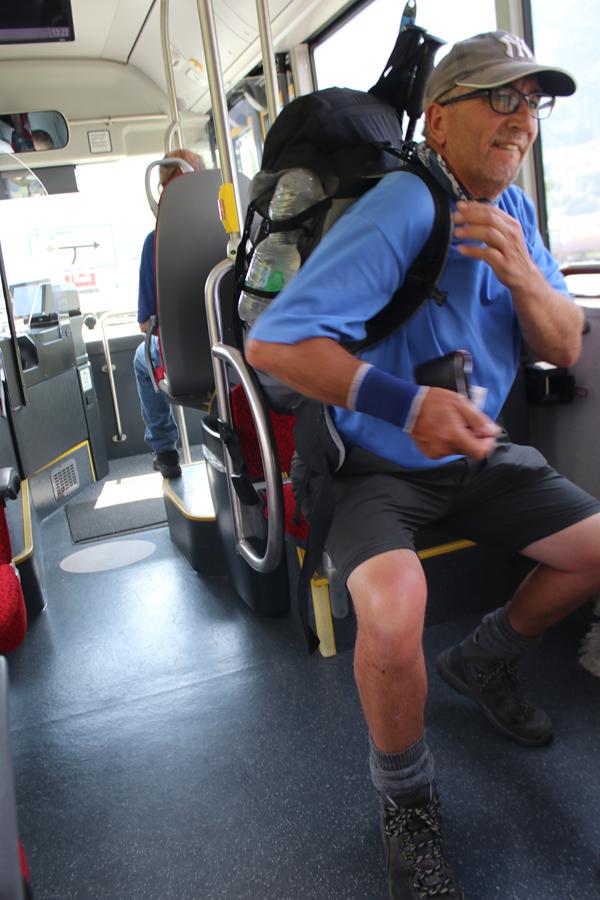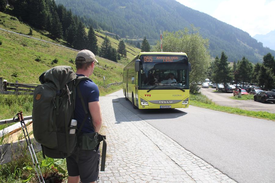 Entspannt können wir uns in den Sitz zurücklehnen. Etliche Wanderer begegnen, weichen dem Fahrzeug gerne aus. Von der Umgebung bleibt durch die Fahrt vieles auf der Strecke. Währen ich mich für ein Bild postiere, begleicht Humprey die Fahrt, es ist 11.21 Uhr, hier am schön angelegten Vorplatz des Gastlichen Tauernhaus, endet die Fahrt, der Große Parkplatz beginnt ein Stück entfernt. Ein Katzensprung entfernt die nahe Bushaltestelle. Die Beine waren gefordert das lässt sich nicht leugnen. Platzieren uns an einer Info Wand mit 2 Sitz Bänken die Schatten bietet, erstmal die Fahrt begleichen. Erwerbe im Tauernhaus übrigens ein Nobler Schuppen, für 2 € 5 kleine Scheiben Brot. Wasser gibt’s am Holz Brunnen, während die Textilien in der Sonne trocknen stärken wir uns, da ja auf das Frühstück verzichtet worden ist. Anruf bei Bodo heute Reisen sie bekanntlich an. Er lässt Wissen das auf Wunsch von Marco die Fahrt auf 14.30 Uhr, vorzuverlegen, obwohl Alina und Bodo den Abend bevorzugt hatten. Die Infos auch für die Anfahrt finden sich auf meiner Homepage. Es gab eine Unklarheit wegen Samstag, Marco wollte gleich absteigen um die Rückfahrt noch am selben Tag einzuleiten, die Info das die Salm Hütte für 5 Personen Reserviert ist, war auch bekannt. Bitte ihn um Teebeutel und für Humprey eine Sonnenmilch. Der Bericht ist ein wenig aktualisiert. Es ist an der Zeit sich anzukleiden. Zwei Bergsteiger warten schon. Mit einer kleinen Verspätung trifft der Gelbe Postbus ein. 6.10 € die Fahrt nach Matrei in Osttirol, für Rentner sind es 3.90 €. Reichlich Freie Plätze im 3 Achser Bus. Der Bus von Matrei am Koberplatz nach Kals fährt um 13.56. Der Akku geht zur Neige, da hilft nur der Flug Modus. Flott die Fahrt Talauswärts, wenig Verkehr auf der gut ausgebauten Straße. Ein Halt in Gruben, wie wir im letzten Jahr steigt heute eine Familie zu, die sicherlich nicht von der Badener Hütte abgestiegen sind. Der Bus stoppt am unscheinbaren Koberplatz in der Ortsmitte auf 965 m. Nochmals Wärmer als kurz davor. Auf dem Fahrplan findet sich nicht der Bus des lauten Info hier um 13.56 Fährt. Der Ort wirkt um die Mittagszeit wie verlassen, liegt das an der Hitze? Vergebens halten wir Ausschau nach einer Person die uns weiterhelfen kann. Erstmal Bergab die Straße der Bus Route folgend, an der Kreuzung geht es Links, geradeaus geht es nach Prägraten eine weite Fläche in Matrei vereinigen sich zwei Täler, seinerzeit sind wir von Prägraten zum Großvenediger gestartet. Kleinere Handwerksbetrieb kein Personal um die Gebäude. Die Wärme macht Humprey zu schaffen, werde gezogen von einem inneren Trieb, einen Discounter bzw. die Bushaltestelle zu finden, die Zeit läuft. In der Ferne lässt sich etwas erahnen. Eine Radfahrerin auf der gegenüberliegenden Straßenseite schiebt ihr Fahrrad, wechsle die Straßenseite auch hier ist wenig Verkehr. Begrüße die Dame, sie erwidert, wir sind auf der Suche nach einem Lebensmittel Geschäft? Ja folgt der Straße ihr findet einen Spar und MPreis dort gibt es einen sehr guten Kaffee im Bistro, der Weg dorthin lohnt sich! Das hört sich schonmal gut an. Ist an der Straße eine Bushaltestelle? Ja nahe des Spar, die Anspannung fällt wie ein Stein. Als Humprey eintrifft, kann ich ihm eine gute Nachricht übermitteln, das umher irren findet ihr Ende. Es zieht sich noch ein Stück des Weges hin, wissend das wir 2 Fliegen mit einer Klappe schlagen läuft es sich mit Feuer unter den Sohlen etwas leichter. Links ein sehr großer Spar, daneben ein KIK bewusst wurde am Ortsrand die Einkaufszentren gebaut. Richtung MPreis die Haltestelle auf weiter Flur. Es sind dennoch noch einige Minuten, um 13.21 Fährt der Bus, wohl 300 Meter vorbei am Großen Parkplatz im Grünen sind es bis zum MPreis. Am Eingang Tische und Stühle für die Außen Gastronomie. Humprey bleibt beim Gepäck sein Wunsch Käse und ein Brot. Zügig flitze ich durch die gut Sortierten Regale im Kühlen Discounter, verlockend al der leckeren Dinge zu wiederstehen. 1 Weißbrot 1 Roggenbrot 3 Wecken 100 gr. Lyoner. 1 Magnesium Röhrchen, der Käse im Angebot, 2 Kalte Gösser Radler zusammen 18.10 €. Belege die Wecken mit der Wurst allzu viel Zeit bleibt uns leider nicht, auch hier ist wenig Betrieb. Mal schauen wieviel Zeit uns in Kals bleibt. 5 Minuten vor der Abfahrt Stehen wir gemeinsam mit einer jungen Familie in der prallen Sonne, da sind selbst die Kinder Träge. Größere Wolken bilden sich heute schon sehr früh. Leicht verspätet trifft der Bus des Verkehrsverbund Tirol ein. Die Türe öffnet sich, ein Hallo zum Fahrer, einmal Huben Pensionär 2 € Humprey begleicht 1 € mehr. Erneut finden sich genügend Freie Plätze. Die Fahrt geht direkt zum Knotenpunkt in Huben das Abseits der Felberntauernstraße liegt. Die Aufnahme des Rucksacks wie immer ein lästig Übel. Mehrere Postbusse stehen für eine Weiterfahrt bereit, darunter auch der nach Kals. Perfekt da bleibt uns noch Zeit in Kals. Diese Fahrt ist etwas weiter der Fahrpreis Gemeindeamt Kals dementsprechend 2,90 bzw. 4,60 €. Ein Ehepaar mit 2 Kinder mühen sich mit dem einstellen der Räder, helfe ihm ein wenig, echt schwer das E-Bike. Spätestens bei der gut ausgebauten kurvenreichen Bergfahrt, ist die Frau richtig gefordert, die Räder vor dem umfallen zu bewahren. Die Straße wird verlassen Lesach wird kurz angefahren. Reagiere sofort als der Bus am Gemeindeamt nicht stoppt, der Fahrer hält auf freier Strecke, gut das wir vor einem Jahr schon hier waren. Die Temperatur auf 1300 m schon Moderrater. Es sind nur wenige Meter bis zum Park mit Brunnen ein Großer Baum spendet Schatten, empfehle Humprey gleich im MPreis einkaufen zu gehen, bin gleich wieder zurück, während ich die Bushaltestelle gut 100 m entfernt aufsuche, der nächste Bus fährt um 14.56 Uhr. Gemeinsam gehen wir in das wenn auch kleine Fressparadies des 1110 Seelen Dorfes. Während des Bummels durch die Regale. 1 Liter Johannisbeersaft. 1 gerauchte Braunsch