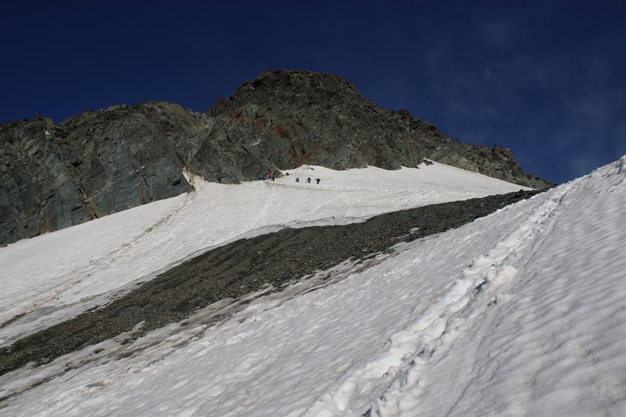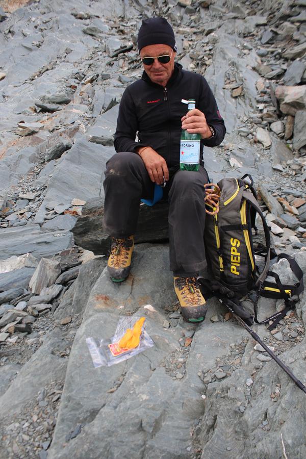 Samstag 16.August: Eine sehr unruhige Nacht die Höhe macht sich auch bei mir Bemerkbar, das liegt sicherlich an einer Person die Ununterbrochen schnarcht, Humprey erwähnt das er nur 2 Std. geschlafen hatte, Marco klagt ebenfalls über die Typischen Höhen Probleme, das ist natürlich ein Argument von der Stüdl oder Salm Hütte zu starten. Früh stehen schon einige auf. Noch vor 5. 30 Uhr gilt es auch für uns, wollen wir vor der Welle sein. Die Dunkelheit endet im Norden hängen die Wolken Tief, im Osten ist der Horizon in einen schmalen Schleier von Dunkel Gelb ja fast schwarz, bis in ein Hell Gelb das in Blau übergeht. Marco ist der erste der den Raum verlässt. Treffen uns im Gastraum das Nebenzimmer ist wieder mit einer Kette versperrt. Das Frühstücks Buffet ist gerichtet, ruhig ist im Raum wenn wunderts um diese Zeit. Getränke werden an der Theke gereicht, ein jeder kann sich am Buffet bedienen, es wird nicht Kontrolliert auf Vertrauens Basis ausgerichtet. Gäste kommen und gehen einige nehmen sich wenig Zeit zum Essen. Das Rennen hat schon begonnen. Wurst Käse Brot Marmelade Butter Müsli auch Milch und O-Saft. Die Schuhe stehen im Vorraum bin mir nicht ganz sicher hatte Sie wohl auf der Terrasse stehen gelassen. Es ist Kühl bei leichtem Wind, ca. 2 °C. Die Menschen verteilen sich auf der Terrasse auf drei Seiten befinden sich an der Fassade Bänke ein jeder findet ein Plätzchen. Täuscht der Eindruck unsere Gruppe scheint Hellwach zu sein. Schlage vor den Gurt gleich anzulegen, die Steigeisen erst wenn benötigt. Etwas Gewusel wirkt alles Unorganisiert. Übergebe Humprey seine Ausrüstung die in meinem Rucksack deponiert war. Auch der Rucksack von Bodo bleibt zurück, Warte im Schuhraum dort ist es deutlich Wärmer. Die App für die Navigation einschalte. Die Arbeitshandschuhe und die Mütze kommen zum Einsatz, während ich nur eine Mütze Trage setzen die anderen auf den Helm. Die Sonne beginnt ihr Werk. 6.40 Uhr, Marco geht voran. Personen sind weit Oben am Einstieg zu sehen. Wie Erfolgreich werden wir sein? Bodo berichtet das einige sehr früh mit Stirnlampen Aufgestiegen sind,