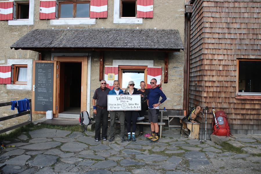 Recht etwas tiefer Grasen 6 Pferde, das Kriegerdenkmal wird passiert, innerhalb von wenigen Meter wird der Hang richtig Grün. Die Salm Hütte 2644 m, wird nach 1154 m Abstieg, wenig später um 15 Uhr erreicht, seltsam die Anordnung der 3 Gebäude. Stelle die Frage in die Runde, ob sie diesen Abstieg dem der gestrigen Tour vorziehen, die Antwort ja. Von hier über den Adlerhorst ist mehr als eine Alternative. Einige Murmeltiere sind nahe der Hütte, das ist doch was Besonderes. Die Außen Gastronomie ist ob der Bedingungen passe, der Thermometer zeigt 12 C° an. Der Bergführer der ersten Gruppe dampft an einer Zigarette. Stelle die Frage warum er von hier die Tour zum Glockner vorzieht, nicht überlaufen, die 1100 Hm sind gut an einem Tag zu bewältigten. Sein Kollege startet Morgen in der Früh mit einer Gruppe, er wird später folgen, das Wetter wird Unberechenbar sein. Mittelbar hinter der Eingangstüre wird der Pickel aufgehängt. Eine Treppe führt zu den Sanitär und dem Schuhraum. Auch hier finden sich Hüttenschuhe. Harmonisch fügt sich das Alte an das Neuere Gebäude. Marco stärkt sich in der Gaststube mit einem Apfelkuchen, Nett die Räumliche Aufteilung, einfachstes Mobiliar, an der Wand eine Eckbank 5 Tische verteilen sich, Dunkel die Holzwand 40 Personen können sich hier aufhalten, dazu kommt noch ein Stüberl. Wir erhalten von der Bedienung das Lager 6 im 1 Stock, Sie weißt mich gleich ein. Sowohl das AV Essen wird angeboten oder ala Carte, die HP darf natürlich nicht fehlen. Marco und ich nehmen das Seil im UG gleich auf, Sie starten gleich in der Früh um 6.30 Uhr, Marco hat am Abend ein Zimmer in Rüdesheim gebucht. Alina und Bodo teilen sich die 3 Schlafplätze Oben im Doppelstock Bett, eng geht es im Raum zu. Wir bereiten uns auf Morgen vor, Bodo übergibt mir Teebeutel. Alina nimmt die zerschmetterte Vesperbox mit. Unterhalten uns ein wenig. Etwas Essen kann nicht schaden Rauschfleisch und Brot. Alina pflastert den Arm von Bodo, der Sturz war nicht glimpflich. Relativ ruhig kann ich im Gastraum bei einem Holunderwasser 4.80 €, an den Notizen arbeiten. Unglaublich und eine Attraktion, ein Murmeltier scharrt an der Gläsernen Balkontüre, möchte in das innere. Nach und nach gesellen sich die vier dazu, Humprey löscht den Durst mit einem Radler Bodo mit Zitronenwasser, sie unterhalten sich Rege, über ein wohl sehr spannenden und gelungenen Tag. Marco legt sich zum Schlafen. Eine Gruppe von ca. 30 Personen hat sich im Laufe unserer Anwesenheit gebildet, sie schaukeln die Stimmung Hoch. Die Temperatur fällt die Wolken hängen Tief, der Thermometer zeigt nur noch 7°C an. Marco bestellt die Halbpension, das Frühstück startet um 7 Uhr, damit ist ein früher Start Act acta gelegt. Die Bedienung fragt wegen des Essens an, Humprey und ich das AV Essen. Bodo bestellt für die HP Spagetti Alina Käsespätzle, sie werden sich die Speise teilen. Kurz nach 18 Uhr, ein Kartoffel Gulasch wird an den Tisch gestellt, das ist doch mal etwas anderes. Sogar Wurst wurde untergehoben, dazu Brot. Alina schneidet den Knobi und Chili im Tablett klein die Bedienung äußert ihren Unmut. Eine Suppe als Vorspeise, Marco erhält ein sehr schmackhaftes Geselchtes. Ruhig ist es geworden.