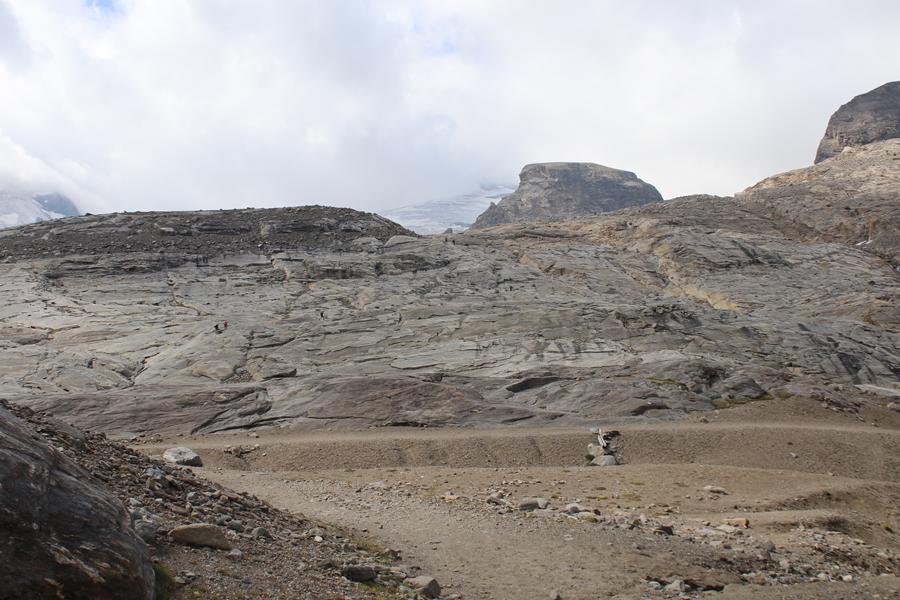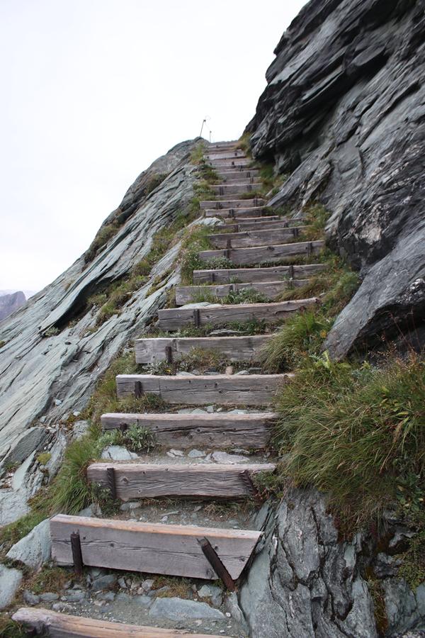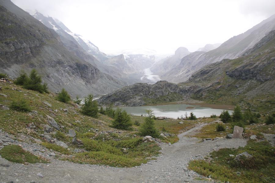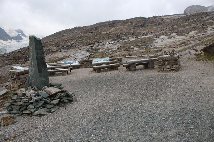 Tolle Sicht nach diesem Aufstieg auf die Pasterze. Die in einem Riesen Kessel liegt, im Westen ist es nun auch Grau tief hängen die Wolken die Gipfel sind eingehüllt, hoffentlich kommt da nichts vom Himmel. Die Oberwalder Hütte lässt sich in etwa erahnen. Gut angelegt der Weg in einem Auf und Ab durch das Becken. Eine Wacklige Hängebrücke leitet über den Wilden Gletscherauslauf, dieser Stürzt Tosend in eine Wilde Klamm. Heute stört mich das Gewicht das auf den Schultern lastet. Zugig in diesem Windkanal es beginnt zu Tröpfeln. Vereinzelt begehen Wanderer diesen Rundweg. Ein richtiges Biotop die auf den Landzungen der Sandnersee wird Nördlich passiert. Braun der Erdige Untergrund. Geschliffen von den einstigen Eismassen die Hänge. Endlich vereint sich der Weg unter der Franz-Josefs-Höhe. Noch 1 Std. Aufstieg. Es ist kurz nach 12 Uhr. Legen eine Pause ein, an einer Holzbank mit Blick auf den Gletschersee. Humprey schätzt das es nur 30 Minuten sind, zumindest lässt sich das vermuten. Hier war 2005 noch der Gletscher. Auf dieser Höhe überquerten Stuif und ich bei der erst Besteigung die Pasterze. Über das Hofmannskees steigt nur selten jemand auf. Teils Künstliche Stufen wechseln sich mit einem Weg ab, Anstrengend geht es nach Oben der Puls schlägt aus, Humprey ist nicht ein Freund von solchen Anstiegen, dauert halt ein bisschen länger. Der Glockner erhebt sich nun in einer anderen Form, wohl eine Pyramide mit Markanten Graten, man muss es Wissen das er es ist. Wolken verhüllen ihn, hoffentlich bleibt es trocken, etliche werden wohl noch im Auf oder Abstieg sein. Die eigentliche Show ist der Pasterzen Gletscher und die Gletscher in der Wand der Großen Gipfel Südlich die von Ost nach Westen sich reihen. 40 Schweißtreibende Minuten um dann auf 2369 m, eine Pause einzulegen.