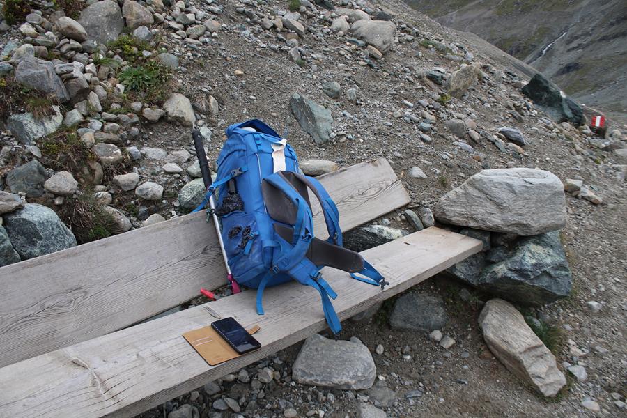 Das waren sicherlich die ersten Gipfel Stürmer. Auch Stufen die aber nie hoch sind. Fast erreiche ich Marco noch. Es ist 13.31 Uhr, ziemlich genau in der Zeit Vorgabe bei Sonnenschein erreicht. Marco wählt eine neue Massive Holzbank. Nach dem Abstellen des Rucksacks reichen wir uns die Hand, de Auftakt ist gelungen. Noch immer steigen Menschen zum Gipfel auf, wir bezweifeln das es Trocken bleibt. Nu r wenige Menschen halten sich gerade auf 3.451 m auf. Marco lädt zu einem Bier ein. Sichere die Route auf der App. Kleine Runde um die Hütte, tief unten die Pasterze mit dem Grünen Gletschersee, darüber die Franz-Josefs-Höhe.Übermorgen passieren wir diese, folgen dem Gamsgrubenweg der durch die von hier Sichtbare Flanke führt zur Oberwalder Hütte. Stoßen mit dem 0,5l Bier a 6.50 € an. Alina trifft ein kurz danach Humprey Bodo folgt um 13.53 Uhr.