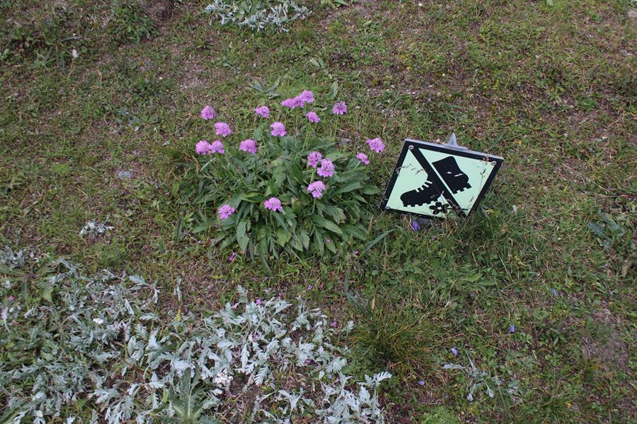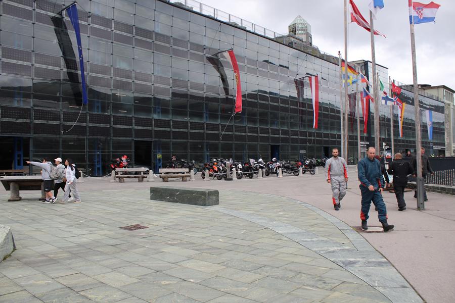 Futurisch die Anlage mit dem verglasten Parkhaus sogar eine Photovoltaik ist Integriert. Es Wuselt auf der großen Asphaltierten Fläche Motorradfahrer geben sich ein Stelldichein. Das passt nicht so recht in das Bild der letzten Tage, ein Kulturschock. Fahnen etlicher Nationen flattern im Wind. Die Frage stellt sich wo finden wir den Zustieg zum Gams Weg? Gefühlt sollte er Richtung unserem Ziel sein. Ein Unscheinbarer Zugang am Ende des Parkhauses. Kalte Luft schlägt entgegen. Mit diesem Wissen suchen wir nach einem Windgeschützen Platz für ein Vesper. Hinter der Glasfassade finden sich Sitzbänke. Eine Wohltat das Gepäck etwas länger vom Rücken zu nehmen auch die Schuhe wollen gelüftet werden. Es finden sich alles sehr schnell im Rucksack. Unbekümmert stärken wir uns werden wohl von vorbeifahrenden bestaunt. Von hier lässt sich das Treiben der Menschen gut beobachten. Ein Zwischenstand unseres Standortes geht an Christian. 2 Scheiben Brot müssen reichen, Käse, Wurst, Zwiebel. Die Sonne scheint sich durchzusetzen, das spüren wir am Körper. Streife mir die lange Tourenhose über Niederschlag ist prognostiziert.