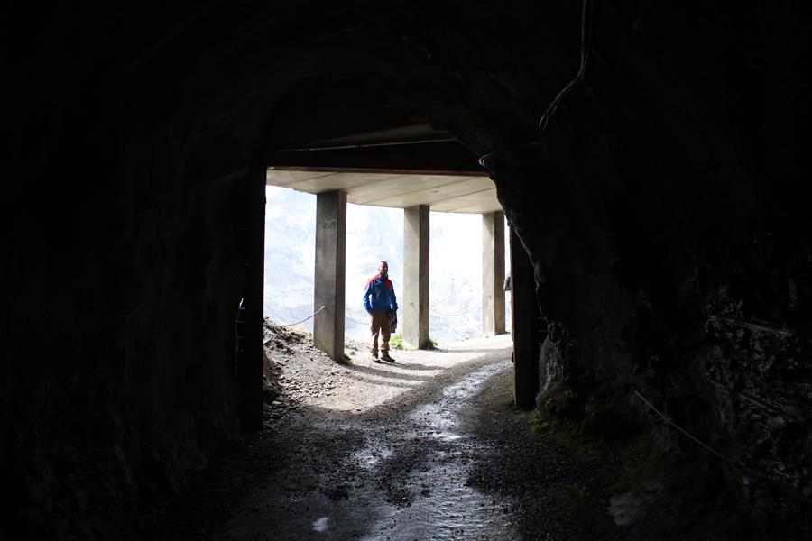 13.35 Uhr, die 2 Etappe steht an. Dunkel der erste Gamstollen der aus dem Felsen gesprengt wurde. Sämtliche Stollen sind mit Längenangabe, Info Tafel teils auch Musik Unterhalten die Besucher, Tropfen fallen von der Decke, warme Luft zwischen den einzelnen Stollen mit Blick nach Süden. Hier wurde einst mit einfachen Mitteln Pionierarbeit geleistet. Es steigt fast unbemerkt an, mehr Menschen als gedacht sind Unterwegs angezogen von einem Art Freilicht Museum. Nach dem 4 Stollen wird auf Steinschlaggefahr hingewiesen eine Kette kann überstiegen werden. Plattig und Steil ein Teilstück hier könnte es Gefährlich sein. An wenigen Stellen liegt Schnee am Weg, der ist sicherlich erst abgerutscht. Ausgebaut wie eine Straße der Weg. Aus Mehreren Eismassen fließt Schmelzwasser, Wolken ziehen über die Berge verhüllen den Glockner immer wieder. Dieser Weg konnte gestern gut eingesehen werden, ja ein Tag später gehen wir einem neuen Ziel entgegen. Immer wieder begegnen Absteigende meist aus dem Ostblock ist da ein zwischen Stopp einer Busreise? Humprey kann mein Tempo nicht gehen, warte ab und an. Heute agiert er nur mit einem Teleskop Stock, der zweite lässt sich nicht mehr fixieren, schaut schon Merkwürdig aus. Prächtig die Kulisse, Rätsle ein wenig über den Zustieg zum Adlerhorst, bekanntlich führt dieser Richtung der Hohenwartscharte, diese ist auch erkennbar. Der Fahrweg endet an einer schönen Anlage mit Bänken und Tischen Toller Blick in die Eismassen der Pasterze.