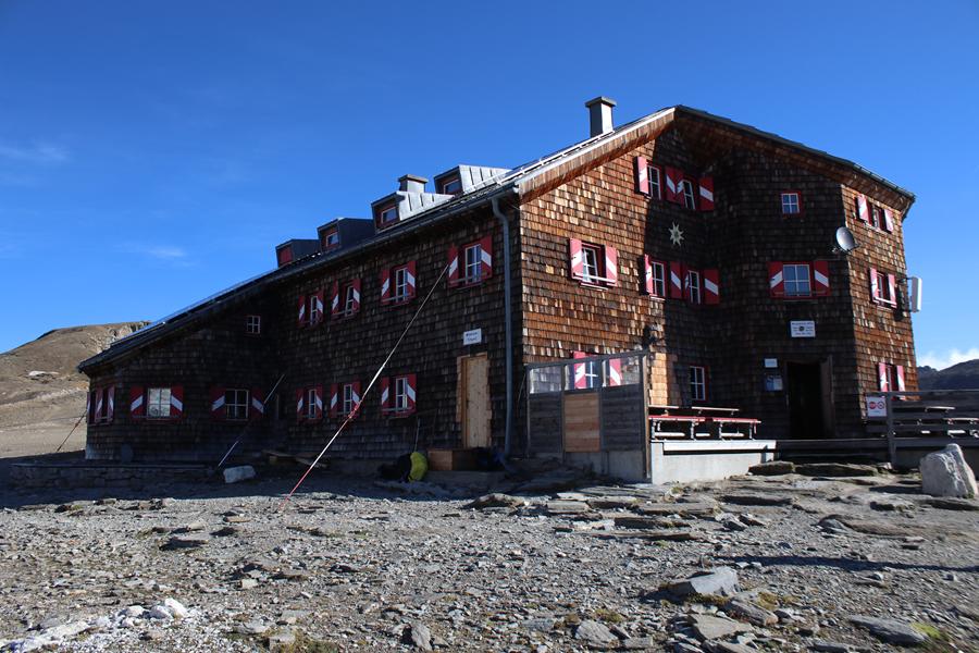 Sonntag 17 August: Sehr früh steht jemand auf, wohl die Aspiranten für den Glockner. Wohl Marco der in diesem Zimmer denn Tag eröffnet kein Wunder bei so viel Schlaf, jedenfalls ist sein schnarchen das Thema beim Aufstehen. Wir haben es nicht Eilig, das Frühstück beginnt erst um 7 Uhr. Es ist leicht Bewölkt kaum ein Wind bei 7°C. Das Buffet wahrlich Reichlich, sogar ein Hefezopf. Marco sitzt am selben Tisch nur wenige Gäste weilen. Frage die Bedienung nach Teewasser, dürfen wir im Stüberl Frühstücken, die Antwort verblüfft, Nein im Freien, da trifft Sie mich am Wunden Punkt, Laut Statuten müsst ihr uns einen Raum zuweisen. Begleiche 4 €. Ihre Chefin hatte Sie angewiesen das so zu handhaben, Sie schaut in eine Karte findet aber nicht was Sie in dieser Situation benötigt. Setzen uns in den kleinen Raum, am Eingangsbereich. Bodo isst in der Frühe noch nichts. Verdruss aller Seiten, das war nun nicht nötig, ist doch bisher alles Harmonisch verlaufen. Alina setzt sich mit der HP zu uns. Die Bedienung reinigt ohne auch nur eine Geste, die obere Tischhälfte mit einem Feuchten Lumpen. Während wir uns Zeit lassen können, treffen wir uns vor der Hütte für ein Gruppenfoto. Das Hüttenschild lehnt an der Hauswand Bodo startet gleich nach der Verabschiedung der Sturz von gestern spürt er heute noch, Alina und Humprey haben schwere Beine und Hände. Stelle das Handy wie empfohlen an den Steinmann der einige Meter Südlich steht, dort sollte sich ein Netz finden. Mit der Verabschiedung um 7.40 Uhr, trennen sich die Wege. Für uns ist das erste Ziel die Franz-Josefs-Höhe 4 Std. Die Sonne steigt auf hier befinden wir uns noch im Schatten. Wähle die kurze Hose aber Lang arm. Das Handy findet kein Netz, nicht so bedeutsam noch schaut das Wetter gut aus. Notmalerweise verabschieden wir uns heute nicht, obwohl wir in Summe zufrieden waren.