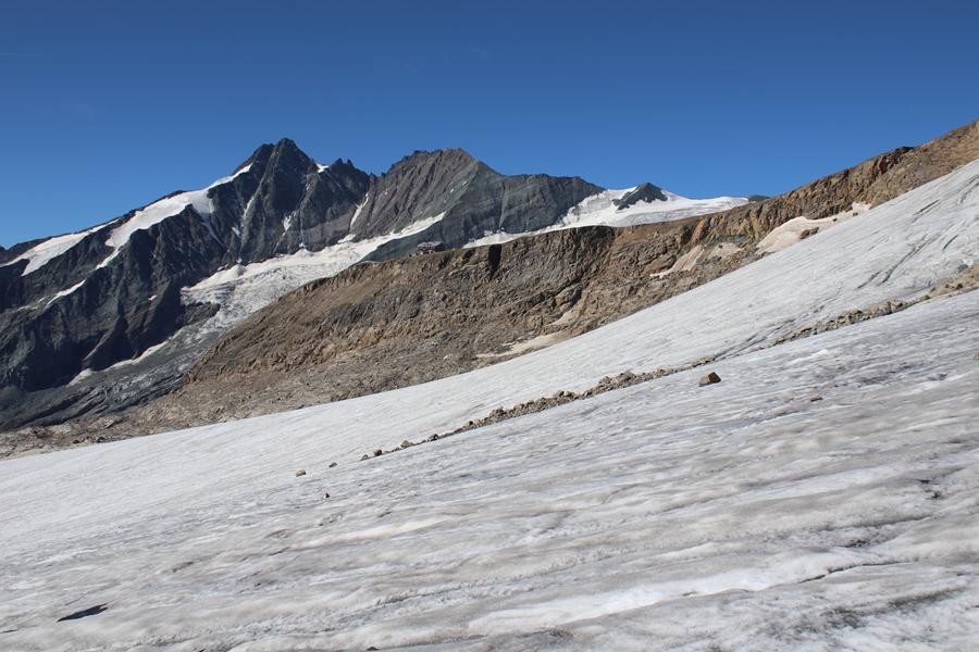 Nur wenige Meter von der Hütte entfernt setzt das Rote Fluggerät auf erzeugt Heftig Wind. 3 Männer und Co Pilot entsteigen mit geducktem Körper. Entladen diverse Gegenstände, schnell wird klar, das sind Monteure für die Photovoltaik Anlage. Jetzt am Morgen wirkt der Glockner wie eine Pyramide wobei aus dieser Perspektive eine ähnliche Festgestalt die Sicht nimmt. Von hier schaut der Aufstieg fast Dramatisch aus. Kurz später landet er ein zweites Mal. wiederum sind es 3 Personen die abgesetzt werden. Als Humprey erscheint starten wir um 8.53 Uhr. Die Sonne steht schon recht hoch, auch der Kalte Wind ist nun abgeschwächt. Zielstrebig entfernen wir uns wohl von dieser Tollen Hütte, diese wird mit der Neuen Fürther Hütte um die Gunst der Besten Hütte dieser Berg Woche buhlen. Nur 2 Minuten sind es bis in den Hütten Klettersteig. Gestern zum Ende der Tour waren die Kräfte etwas geschwunden, heute bei Top Bedingungen ein reines Schaulaufen. Die Handschuhe am noch kalten Stahlseil in doppelter Hinsicht Wertvoll. Der Heli Transportiert einen großen weißen Materialsack, beim nächsten Transport nur wenig später, sind es wohl die Paneele. Sicherlich startet der Transport um die Franz-Josefs-Höhe. Folgen ein Stück des Weges um dann relativ geradlinig über Schotter und Blöcke den Gletscher zu erreichen.