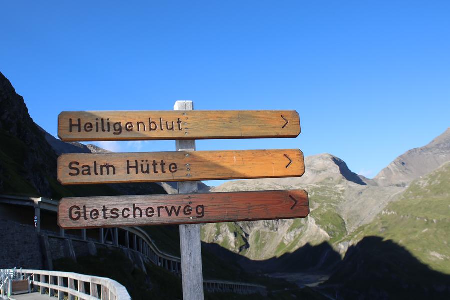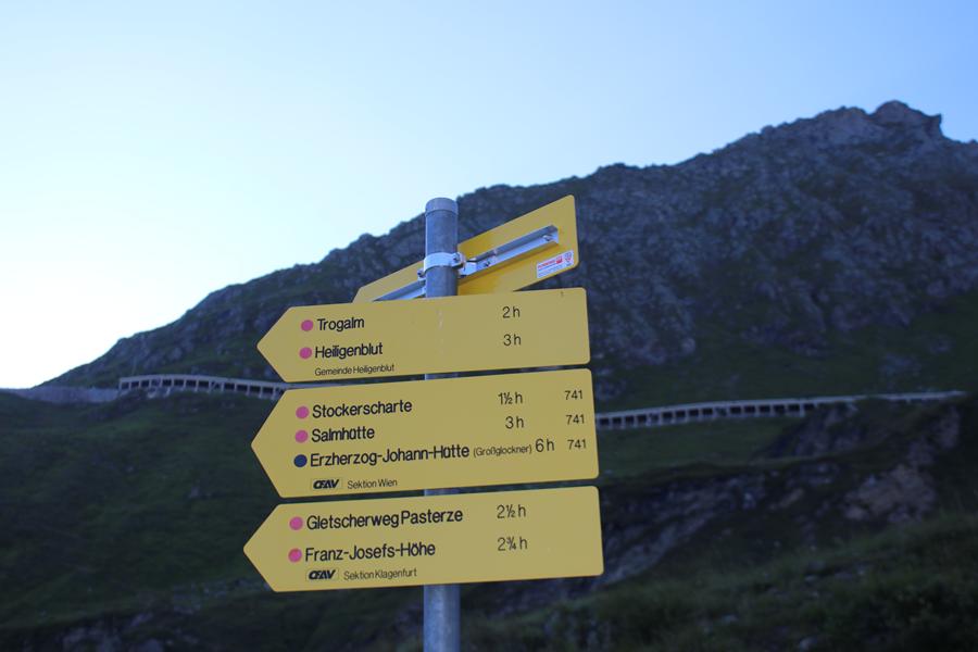 lut“. Ein schmaler Weg den wir nun im Schatten der Berge absteigen. Östlich an der Straße liegt das Bekannte Glockner Haus des OAEV. Auch der Aufstieg in die Stockerscharte ist längere Zeit im Blick. Es ist 18.10 Uhr, eine Hinweis Tafel am Stau See der zur Stromgewinnung entstanden ist, noch 3 Std. bis Heiligenblut, das ist ein Keulenschlag. Es bleibt keine Wahl, Humprey glaubt an sich. Der Weg kreuzt den vom Samstag, oh weh ein Aufstieg zum Glück nur wenige Minuten, etwas später wird klar, tief unten ist eine Schlucht, hier Floss einst das Wasser aus dem Gletscher. Mittlerer weile wird das Wasser über einen 11,6 Km langen Stollen, zum Stausee Mooserboden geleitet. Ein langer Abstieg meist unter Bäumen, durch das Mölltal auf der Westlich Seite. Schmal der Pfad gut ausgetreten. Links gegenüber ist die Straße nun deutlich höher. Vielleicht wäre es per Tramper ein Versuch Wert gewesen. Überraschenden Weise Weiden Kühe auf weiter Flur. Ein Warnschild weist auf einen Wolf hin, der die Tiere in Panik versetzen könnte. Humprey geht Konstant seinen Schritt, während ich ab und zu eine Pause einlege auch um die Blaubeeren am Wegesrand zu verspeisen, jede Gelegenheit wird genützt um die Schultern zu entlasten, auch der Gurt der Kamera drückt auf einen Muskel. Der Zustieg zu dem Salm und Glorer Hütte wird passiert, beide beginnen in einem schmalen Tal, etwas später auch zur Elberfelder Hütte. Diese Informationen erinnern an die Tour von 2024. Der Weg geht in einer Schotterpiste über, die Dämmerung bricht ein. Die Kirche von Heiligenblut wird sichtbar, ein Motivations Schub ist nicht Spürbar. Am Gegenhang sind die letzten Strahlen der Sonne zu sehen. Es wird steiler, zu den eh schon gequälten Beinen werden die Zehen in den Schuhen auch noch gestaucht. Die geschädigten Knie von Humprey erhöhen das Leiden. Erste Bewirtschafteten Wiesen. Die Lichtverhältnisse und die Brille mit Dunkler Tönung erschweren Humprey das sehen. Der Weiler Winkl 1300m, nicht mehr fern. Ein Parkplatz wohl für drei Hütten, gleich danach beginnt eine Befestigte Straße. Das Handy klingelt, fast hektisch wird der Rucksack abgelegt, zum Glück lässt es Christian lange klingeln, er benötigt für die Fahrt laut Navy noch 50 Minuten. Mal sehen wer zuerst Heiligenblut erreicht. Winkl ein Idyllischer Ort auch mit netten Ferienwohnungen darauf deuten die KFZ Kennzeichen hin, längst Brennen die Lampen in dem Gebäude. Vorbei an der Bekannten Wolfgangkapelle. Parallel verläuft nun die Möll, Nach dem Bauhof wird die Möll überquert, es geht nun Bergauf in den Ort. Ein Finaler Run beginnt, da sind noch etliche Reserven vorhanden. Nette Gebäude an der Beleuchteten Straße, zwei Lokale die neben dem Gemeindeamt auf dem Gehweg aufgestuhlt hatten, sind gut Besucht, ja es ist hier um 21.15 Uhr, und das auf knapp 1300 m im Bergsteiger Ort, noch sehr mild. Gleich daneben steht der Murmelbrunnen hier lasse ich mich nieder, fast gegenüber der schönen Kirche. Kaum ist Humprey der auf den Felgen ankommt, fahren zwei PKW vorbei, kurz danach klingelt das Handy, es ist Christian, wo seid ihr? Direkt am Gemeindeamt, dort wo etliche Gäste zweie Lokale an der Straße sitzt, gut ich drehe um, gerade als ich zwei schritte vorwärts trete, fährt ein Auto vorbei, wahrscheinlich nimmt er das Winken nicht wahr, folge dem Auto, nach 100 Meter stellt er das Auto an der Kirche auf einen Parkplatz. Als er aussteigt nimmt er mich sofort wahr. Welch Punktlandung.