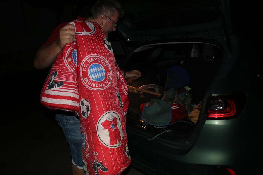Samstag 9.August: 19.05 Uhr. Humprey trifft nach einem Sommertag 32°C, mit dem Treuen silbernen „Oldtimer“ ein. Der Schlafsack und die Isomatte beanspruchen reichlich Platz. Es wird die 4 Tour 2025 von ihm. Das Kühle Weißbier wird gegen Erwärmung geschützt Humprey ist mit zwei Radler eingedeckt. Setze mich nach hinten der Sitz daneben ist praktischerweise umgeklappt. Christian steht schon an der Straße, auf meine bitte Organisiert er eine Schild Mütze.