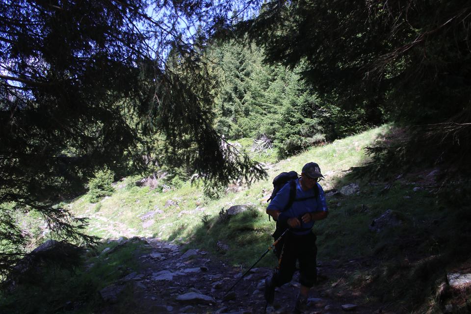 Mit einem kleinen Rucksack in Bergschuhe begleitet er uns. Er erwähnt die Wölfe und seine wichtigen Hüte Hunden. Der Wolf wechselt in der Saison das Revier. Feucht der Untergrund viele Schafe haben wir bisher nicht gesehen, als wir uns verabschieden. Kehren wieder auf den Weg zurück dem es zu folgen gilt. Zur rechten Seite verläuft die Markante Alpine Kette mit dem Piz Valdraus, Piz Vial und Piz Miezdi, meist Wolken verhangen, die wir in den letzten Tagen umrundend hatten. Wegstrecke wird gemacht. Das Wetter bessert sich nicht, die Temperatur hingegen steigt. Ein Gegenanstieg bringt uns nochmals über 2300 m. Der Blick in das Tal Satt Dunkel des Grünen Val Sumvigt mit dem Hüttenanstieg von Freitag öffnet sich der Rein da Sumvitg. Endlich geht es leicht Rechts Bergab. Eine Wegteilung 11.05 Uhr, Cuolmet auf 2100 m. Ein etwas anderes Bild, keine Steine oder Fels säumen den schmalen Weg der sich zu Tal schlängelt. Die Baumgrenze ist unterschritten, niedrige Sträucher wie Blaubeeren die hier Mannigfach gedeihen, laden ständig für einen Halt zum verspeisen ein, es fehlt gar nicht auf das es steiler geworden ist. Große Ameisenhaufen fleißig arbeiten die Braunen 6 Beiner. Im Schatten der Bäume stehen vereinzelt Pilze. Ein kleiner Wasserlauf gar nicht so kalt das Wasser lässt sich gut schlucken, eine kurze Pause bis die nahfolgenden aufschließen.