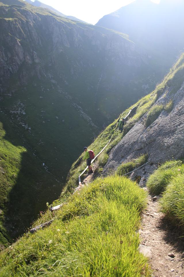 Heute provozieren wir das Wetter, gehe in Kurz. Versammeln uns am Tisch vor der Hütte. Tief unten im Tal fließt der Rein da Vigliuts das Wasser glänzt, Wolken ziehen auch auf der Ostseite Hoch, die Vermutung das der Weg im Tal verläuft der täuscht sich. Runcahez ist nicht angeschrieben aber Tenigerbad. 8.40 Uhr, der Abstieg steht bevor. Gesichert unter dem Hausberg quert es nach Nord Ost, Sehr viel Grün auf dieser Höhe, leichtes Gelände Rot Weiß Markiert, guter Weg dennoch ist immer wieder mal Orientierung gefragt das Ganze im Abstieg.