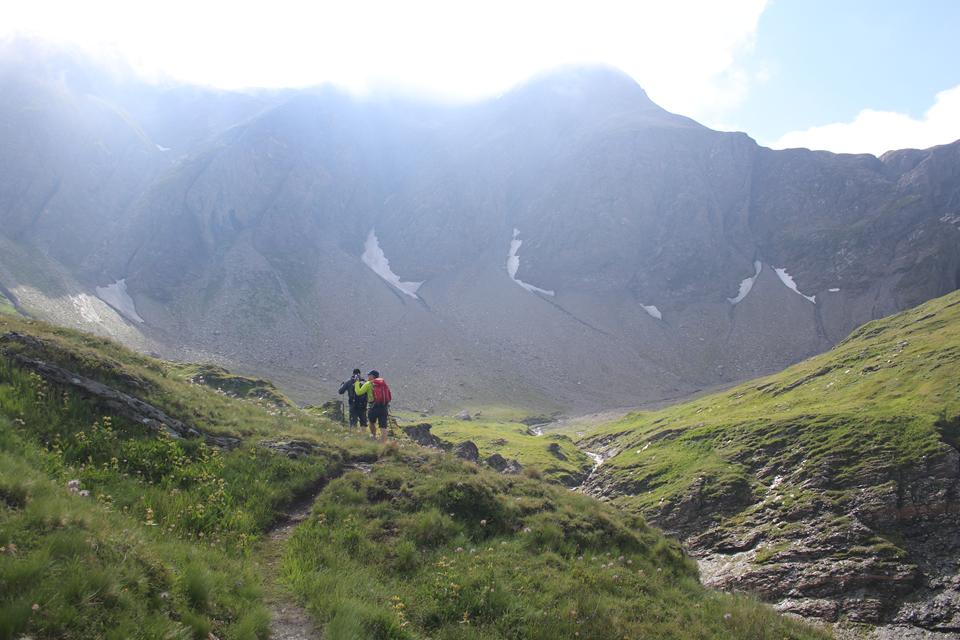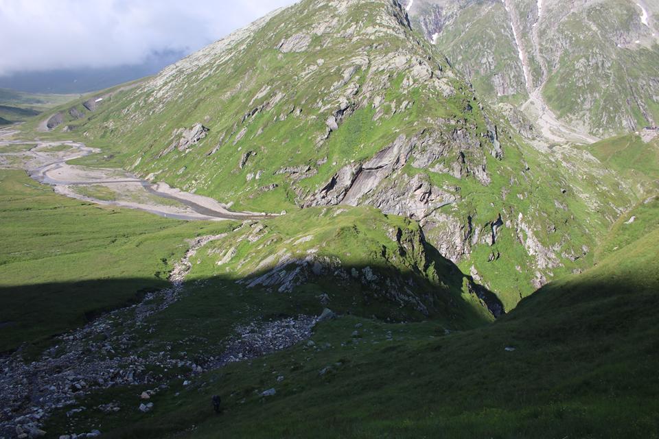 Ein Bild mit der Kamera gelingt noch, dann gebe ich auf. Nach 30 Minuten wird der Abstieg von gestern komplett eingesehen, die Wolken ein einziges Schauspiel, wo auch immer der Weg verläuft lässt sich nur erahnen. Wohl wenig begangen, da der Weg nicht immer ausgeprägt ist. Trotz der Niederschläge ist der Untergrund fest. Der weitere Steingesäumte Wegverlauf ist Anstrengend und kosten ihre Zeit. Ein Weidezaun wird erreicht Stuif öffnet und hält den Torgriff bis der letzte passiert. Wir nähern uns einem Naturstein Gebäude auf ca. 2300 m. Personen halten sich dort auf, ein Bach sichert die Wasserversorgung, das ist Voraussetzung für aller Leben. Plastik Stühle und ein Tisch, 2 Hunde begrüßen uns wohl freudig gestimmt in friedlicher Mission. Mittels einer Zeltplane ist direkt unter dem Dach eine große Zeltplane von 4x6 m gespannt, die von mehreren Stützen gehalten wird. Sicherlich 30 Große Kunststoff Transport Boxen sind darunter verteilt. Wohl die wichtigsten Gegenstände sind darin gelagert. Ein Blonder Langhaariger wie einst zu Hippi Zeiten grüßt Freundlich, überhaupt nicht Wortkarg schildert er seins Anwesenheit in der Alpinen Abgeschiedenheit. Er ist Senner und für 620 Schafe zuständig, die beiden Kinder 1+3 Jahre spielen im Wasser das nach dem Regen über die Wiese läuft. Wir sollen doch warten er geleitet uns ein Stück, schauen uns ein wenig um. Wohl sehr einfach auch das Gebäude ist schon in die Jahre gekommen, eine schlanke Schwarzhaarige Frau tritt aus dem Gebäude. 3 Monate betreuen sie die Tiere bei einem Monatlichen Saläre von 6500 Sfr. Sie ist Lehrerin derzeit im Mutterschutz, beide Leben in Karlsruhe , er ist Selbstständig und Baumpfleger.