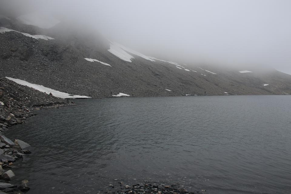 Humprey fällt trotzdem zurück. Aufstieg durch das Val Canal in Richtung der Wand des Piz Canal 2846 m. Es verengt sich, folgen dem Weg am Rinnsal der sich schlängelt. Später überschreiten wir einen Gletscherbach. Die Richtung wechselt leicht, spät lässt sich ein Kessel erkennen, Südlich wohl die Schwachstelle erstmal relativ geradlinig der Aufstieg der richtig fordert. Ein Paar begegnet, sie kommen vom See, aufgrund der Wetterlage verzichteten sie auf den Piz Terri. Ihr seid alsbald am See. Demnächst geht es links durch den Schotterhang schaut aus der Perspektive spannend aus. Endlich kommt der Körper auf Touren. Kurzer Halt am Beginn der Querung unter dem Piz Ner 2766 m, die Perspektive war wie immer eine Täuschung. Unterhalte mich mit Olaf, Stuif und WPO sind etwas zurück, Humprey benötigt eine Pause. Der Wind nimmt zu, sind an der Wolken Untergrenze, das Wetter zieht von Süden auf. Ein kurzer Anstieg um 11.08 Uhr, der Laghet la Greina 2582 m. liegt ein paar Meter tiefer. Der Wind wiegt das Wasser auf Die Wolken schweben über dem See. Öffne die DAV App, der Weg verläuft rechts des See relativ geradlinig Richtung Piz Terri. Es ist Unangenehm hier, der Wind pfeift ungebremst und Kühl. Als Stuif kommt gehen wir langsam weiter. Bei Gutem Wetter ein Platz zum Verweilen. Kleinere Schneefelder reichen vom Hang bis zum Wasser. Am Ende des See steht ein großer Steinmann, die Hände kalt die Nase tröpfelt, Zeit zum Wechseln der Hose.