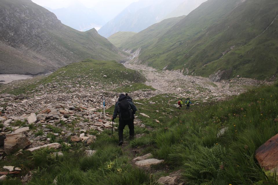 Relativ Nördlich die Route im Abstieg insgesamt sind es doch 700 Hm. Altschneefelder die auf dem wohl einstiegen Gletscher La lavaz liegen beginnen an der steilen Wand eines Grates der vor der Medelser auslaufen. Im Norden ziehen Grüne Hänge vom Tal auf eine ähnliche Höhe, Fotogen wie die Wolken nach Oben abziehen. Dort sollte es links Westlich zu unserem Tagesziel gehen. Holprig der Untergrund, von einem Weg kann da nicht gesprochen werden. Die Wegfindung erschwert sich zusehends, der Berg ist in Bewegung. Links die steilen Fels Wände teils liegt noch Schnee und Eis. Doch soweit wollen wir uns nicht nähern. Mal ein Pfosten oder Stange, keine klare Linie in diesem Kessel. Zwei Schneefelder laden Förmlich zu einer Coolen Abfahrt ein, für den der das zu nutzen weiß und kann, Humprey fällt genau in diesem Moment löse ich den Auslöser 😊Etliche Gänsegeier kreisen über der Scharte Mindesten 14 nach der Zählung. Halten uns Westlich in der Flanke das GPS sehr Hilfreich. Ein Rücken versperrt wähle links, nach der darauf folgenden Abfahrt treffen wir auf den Weg. Irgendwo im Norden wird Morgen der Abstieg verlaufen. Ein größerer Stein wird mir zum Verhängnis, er kippelt bringt mich aus dem Gleichgewicht, trotz einer guten Reaktion war ein Sturz zwischen den Steinen unvermeidbar, zum Glück nur wenn auch schmerzhafte Verletzung am Handballen. WPO zaubert ein erste Hilfe Set aus dem Rucksack. Ein Pflaster verschließt die Baustelle. Hilfreich durch das Zeitraubende Gelände sind die Markierungen an den Steinen. Wasserläufe mehren sich, Zeit zur Aufnahme für das Kostbare Nass. Eine Tablette veredelt. Während des Gehens bei Wärmerer Temperatur erwärmt sich das Kalte Wasser. Die Blöcke werden größer, Nähern uns dem Bach der in der Senke des Tal verläuft, was gestern noch ein Bächlein war ist heute ein Wildes Wasser. Es ist sehr Hilfreich wenn eine Person voraus geht. Verläuft der Hüttenaufstieg im Grünen Hang? Der Abstieg absolut anstrengend, als der tiefste Punkt erreicht wird, deutet sich der Aufstieg in einer Rinne aus Steinen mit Wasserlauf an. Gut gewählt ein passender Stein der von den Strahlen der Sonne erwärmt wird. Relativ Zeitnah sind wir vereint. Ärgerlich mein Handy schaltet wegen der Leere des Akkus ab, somit gibt es keine weitere Bilder. Stuif lässt Wissen es sind noch 1,2 Km bei 300 Hm. Fester guter Untergrund, gut begangen, mit kleinen Kehren, über mehrere Absätze. Es wird Grün, Nahrhafter Boden für das Pflanzen Wachstum, an geeigneter Stelle, überquert der Weg den Bach. Olaf wird es Warm er zieht die Jacke aus. Der Tag ging doch etwas an die Substanz das beweist Humprey der sich schmerzhaft das Knie anschlägt, außer Olaf beging ein jeder einen Fehler. Stetig am Hang auch in einer Rinne mit und ohne Wasser in Westlicher Richtung. Die Giebel Seite der Medelser Hütte am Grat erscheint im Blickfeld, ein freudiger Moment. Dennoch sind noch 2 Stopps zum Durchatmen angesagt. Ärgerlich wenn der Griff zum Auslöser der Kamera verwehrt ist. Eine Scharte wird erreicht, hier verläuft, ein Weidezaun der hier verläuft liegt am Boden. Rechts davor verläuft der Aufstieg. Kurz vor erreichen werden Personen aus Nord-West aufsteigend Sichtbar. Es ist 16.42 Uhr, ein doch Abwechslungsreicher Schwarz Markiert Übergang T4 der wohl weniger wegen den Schwierigkeiten, sondern die Weglosigkeit und Orientierung. Auch hier wurde mit einem vier eckigen wenn auch kleinen Anbau Erweitert.