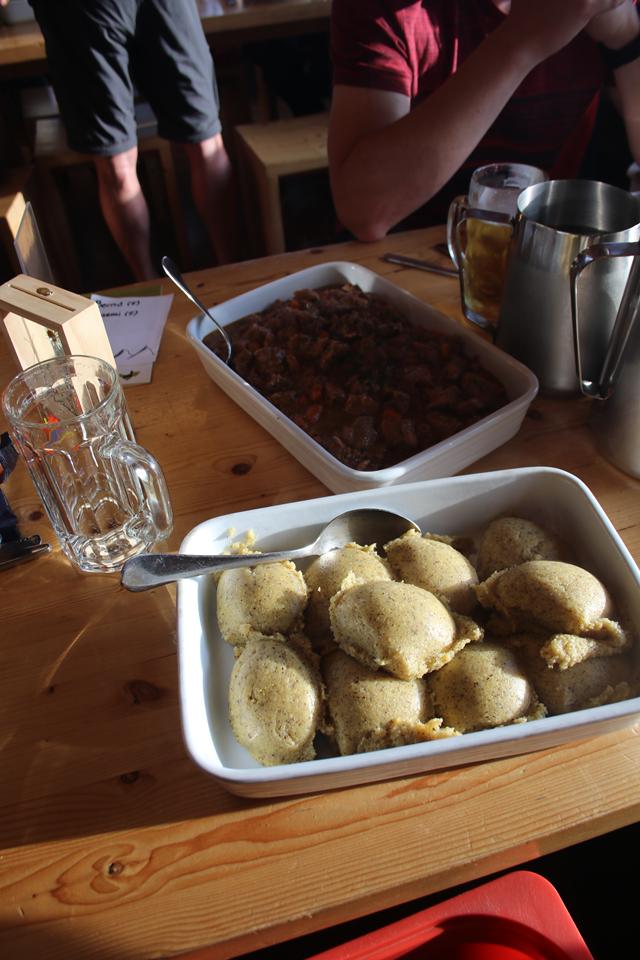 Humprey und Olaf gönnen sich ein Bier, die Bestellungen werden auf Bernd notiert. Während Lebhafter Unterhaltung gilt die Konzentration dem Bericht. Um 18.45 Uhr, geht die Sonne hinter dem Berg unter. Verharre bis Stuif mich zum Essen auffordert. Zuvor wird die Baustelle besichtigt. Teils mit schwerem Gerät wird ein Fels abgetragen, reichlich aufwendig bis das Fundament für den Sanitär Bereich steht. Nächste Woche wird Betoniert. Der Tisch 5 im Nebenzimmer ist für Urs und dessen Frau sowie für Bernd Reserviert. Im Eck findet sich eine Steckdose, zum Laden für das Handy. Als Vorspeise wird eine Linsen Erbsen Suppe in einem Topf serviert. Der Salat wird auf den _Tisch gestellt, warte geduldig bis die Älbler Maccarone (Kartoffeln Nudeln Speck und Creme fraiche) auf den Tisch gestellt werden. Die Portion und Geschmack gut, dennoch erhalten Humprey und ich noch einen Nachschlag.