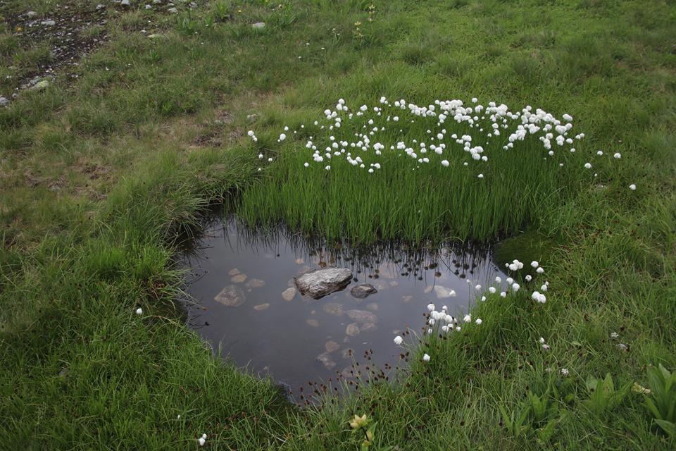 Interessant wie sich wohl diese Landschaft so bilden konnte. Der Weg verläuft Nördlich am Fuße der Bergkette etwas über der Ebene. Personen begegnen. Wenig Höhenversatz. Von Oben zeigt sich die Wildheit, ein Wasserlauf schlängelt sich durch die Landschaft, zu beiden Seiten ist das Gras deutlich Dunkler. Eine Jungtiere sind gar nicht scheu, versperren uns den Weg, Olaf streichelt ein Tier am Haupt. Eine mit Kette versicherte Passage, locker weiter bis auf 2265 m, hier geht es in die Carpet la Greina. Die Terri Hütte ist noch nicht sichtbar. Der Bach verläuft rechts des Weges. Als Stuif die Hütte sieht, legt er einen Stopp ein, hier könnten wir doch Vespern. Es ist kurz vor 11 Uhr, eine kurze Vesperpause im Grünen. Der Untergrund gar nicht so kalt. Währen WPO aus dem vollen schöpft, Essen wir Spartaner. Der Abstieg zieht sich noch einige Minuten hin. Ein Bild hinter dem in der Senke liegenden See, im Hintergrund steht oben auf dem Absatz die Hütte.