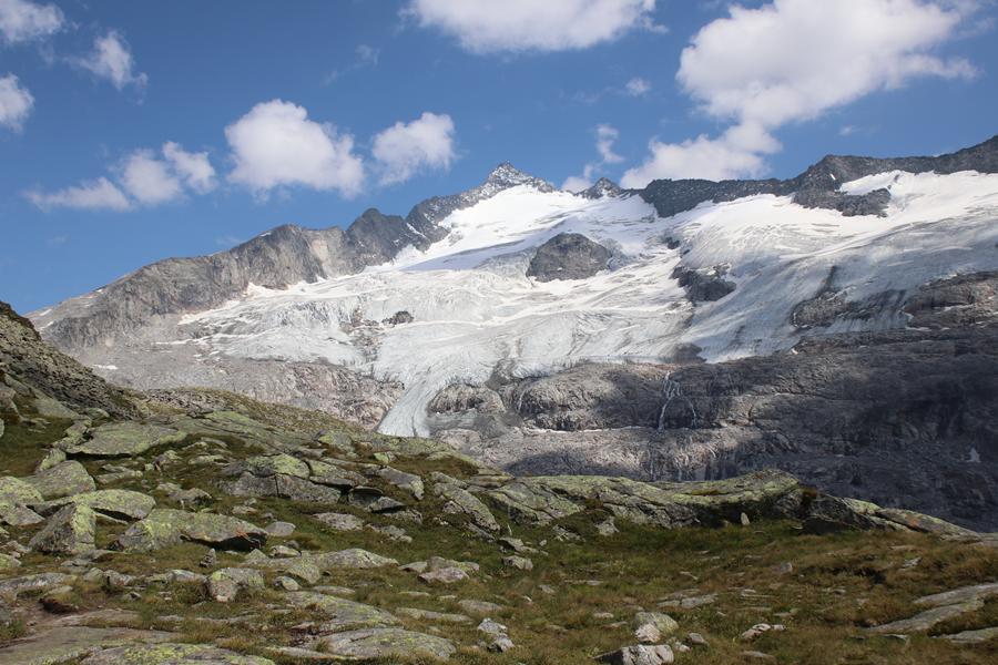 Das Paar kommt entgegen, es war ihnen nicht ganz geheuer, wobei das noch als einfach bezeichnet werden muss. Kurz unter dem Gipfel führt der Weg zum Gletscher, doch die „Gamsspitzl nehmen ich gerne mit“. Massiv das Stählerne Gipfel Kreuz, es ist 10.21 Uhr. Toller Blick nach Osten, wie mag das noch vor 50 Jahren ausgesehen haben, wohl ein Meer aus Eis. In der Ferne ist die Hütte am Hang unter dem Kesskogel 3291 m und der Bachmayrspitze 3120 m Sichtbar, davor liegt der Krimmlertörlkees den wir demnächst begehen. Auf der Südseite ist auch ein Zugang zum Gletscher, Kurzärmelige ist ein Aufenthalt unangenehm. Vor dem gegen Aufstieg zur Hütte, gilt es weit abzusteigen. Rechts in den Wolken liegt der Großvenediger. Warte bis Humprey erscheint. Eine Spur führt nach Nord zu einem Felssporn, eine weitere rechts, wohl zur Essener Rostocker Hütte. Wir müssen uns etwas nach links halten, zum Ende des Gletschers an die Felsen. Humprey folgt, mögen es 50 Meter sein bis zum Schnee, einer der beiden die vorher aus Respekt nicht zum Gipfel ging, ist in einem Bogen aufgestiegen bis der Gletscher Sichtbar wurde. Christian winkt uns vom Gipfel zu. Suche einen guten Platz im Steinbruch, zum Sitzen in den Steinen. Eine Randkluft bringt mich in die Bredouille, versinke gehörig mit einem Bein ein Stein klemmt den Schuh ein. Kurze Querung der Schnee selber ist Fest, Humprey der das beobachtete ist gewarnt. Humprey legt sich die Steigeisen an, du solltest zuerst den Gurt anlegen. Krame die schwere Ausrüstung die unten liegt aus dem Rucksack. Erstmal das Seil vorbereiten. Teile einen Apfel auf. Die Steigeisen sitzen gut an diesem leichten Schuh. Christian wählt einen ungünstigen Platz, sein Rucksack kommt ins Rutschen, welch Glück er bleibt hängen. Als er ihn holt stürzt er. Falter Hilf mir doch bitte ich benötige eine Binde, wir checken das erst gar nicht was da geschehen ist. Während Humprey einen Erste Hilfe Beutel aus dem Rucksack kramt schnappe ich mir die Kamera. Erstmal das geschehen in Bild festhalten, das schaut ja gar nicht gut aus, regelrecht aufgeschlitzt der Oberschenkel etwas über dem Knie. Es blutet noch nicht so stark, er hält sein Taschentuch auf die Schnittverletzung. Eine Rote Binde wickeln wir vereint auch über das Taschentuch. Er ist in den Eis Pickel gefallen. Durch den Schock verspürt er noch keinen Schmerz, er entscheidet wir gehen weiter. Nehmen ihn in die Seilmitte, der Rucksack ist nun leichter. Das Wetter schaut noch ganz gut aus, besser als noch gestern. Christian ist der Meinung Richtung des Felssporn zu gehen, das verneine ich, die Route ist mir klar. 11.20 Uhr starten wir. Nach 30 Meter ist das Eis erreicht, Das schaut doch ganz gut aus. Gemütlich gilt es sich an die Eisen zu gewöhnen. Humprey hat die Stöcke mit dem Pickel getauscht. Teilweise liegt noch in den Querrinnen Schnee, wobei ich nur eine Kritische Stelle Sondiere. Die Richtung ist mit dem Gletscherverlauf vage vorgegeben. Zwei Spaltenreiche Passagen erfordern etwas Zeit für um einen guten Durchstieg zu finden. Rätsle über die Route für Morgen zur Neuen Thüringer Hütte. Das Typische geeire aber es geht ja Bergab. Passieren eine größere Gletschermühle Reichlich Schmelzwasser fließt in den Rinnen. Ein Schluck Trinken tut ganz gut, das Wasser ist natürlich richtig kalt.