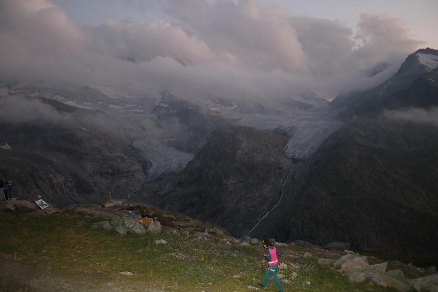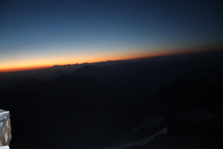 Samstag 16.August: Eine sehr unruhige Nacht die Höhe macht sich auch bei mir Bemerkbar, das liegt sicherlich an einer Person die Ununterbrochen schnarcht, Humprey erwähnt das er nur 2 Std. geschlafen hatte, Marco klagt ebenfalls über die Typischen Höhen Probleme, das ist natürlich ein Argument von der Stüdl oder Salm Hütte zu starten. Früh stehen schon einige auf. Noch vor 5. 30 Uhr gilt es auch für uns, wollen wir vor der Welle sein. Die Dunkelheit endet im Norden hängen die Wolken Tief, im Osten ist der Horizon in einen schmalen Schleier von Dunkel Gelb ja fast schwarz, bis in ein Hell Gelb das in Blau übergeht. Marco ist der erste der den Raum verlässt. Treffen uns im Gastraum das Nebenzimmer ist wieder mit einer Kette versperrt. Das Frühstücks Buffet ist gerichtet, ruhig ist im Raum wenn wunderts um diese Zeit. Getränke werden an der Theke gereicht, ein jeder kann sich am Buffet bedienen, es wird nicht Kontrolliert auf Vertrauens Basis ausgerichtet. Gäste kommen und gehen einige nehmen sich wenig Zeit zum Essen. Das Rennen hat schon begonnen. Wurst Käse Brot Marmelade Butter Müsli auch Milch und O-Saft. Die Schuhe stehen im Vorraum bin mir nicht ganz sicher hatte Sie wohl auf der Terrasse stehen gelassen. Es ist Kühl bei leichtem Wind, ca. 2 °C. Die Menschen verteilen sich auf der Terrasse auf drei Seiten befinden sich an der Fassade Bänke ein jeder findet ein Plätzchen. Täuscht der Eindruck unsere Gruppe scheint Hellwach zu sein. Schlage vor den Gurt gleich anzulegen, die Steigeisen erst wenn benötigt. Etwas Gewusel wirkt alles Unorganisiert. Übergebe Humprey seine Ausrüstung die in meinem Rucksack deponiert war. Auch der Rucksack von Bodo bleibt zurück, Warte im Schuhraum dort ist es deutlich Wärmer. Die App für die Navigation einschalte. Die Arbeitshandschuhe und die Mütze kommen zum Einsatz, während ich nur eine Mütze Trage setzen die anderen auf den Helm. Die Sonne beginnt ihr Werk. 6.40 Uhr, Marco geht voran. Personen sind weit Oben am Einstieg zu sehen. Wie Erfolgreich werden wir sein? Bodo berichtet das einige sehr früh mit Stirnlampen Aufgestiegen sind,