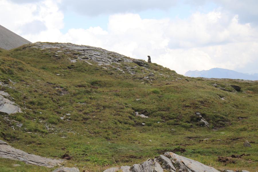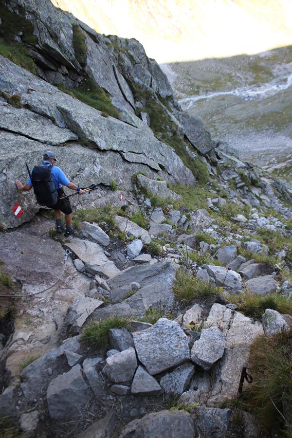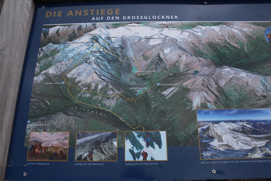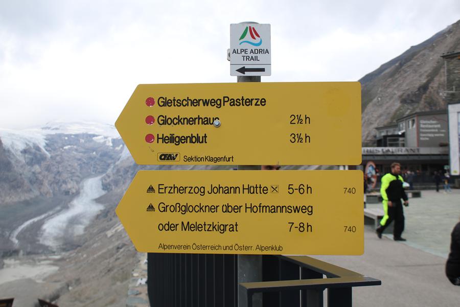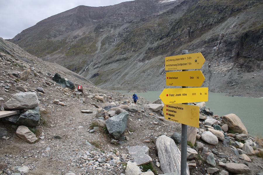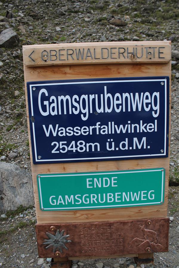 8.37 Uhr, Humprey öffnet das Gatter, ein Holzzaun um das Areal soll die Tiere fernhalten. Jetzt 4 Monate nach der Tour, ist klar geworden was Marco mit der Aussage, gleich zu Beginn des Gletschers zum Ausdruck bringen wollte, wenn einer Stürzt gefährdet er auch andere. Wenn ich das Umlege, sollte ein jeder in einem Gelände I-II befähigt sein, dies allein zu Meistern. Technisch sicherlich kein Problem. 8.37 Uhr, Humprey öffnet das Gatter, ein Holzzaun um das Areal soll die Tiere fernhalten. Ein Teilstück des Wiener Höhenweg liegt vor uns. Leider ist die Route zur Glorer Hütte nicht einsehbar, wäre Wissenswert gewesen wo sie sich gerade befinden. Der gute Weg im Hang noch unter der Vegetation Grenze verläuft unter dem Schwerteck und Schwertkopf dem Drittem und Zweiter Leiterkopf. Wissend das Nördlich die Franz-Josefs-Höhe liegt, ja die Etappe verläuft in einem sehr großen Bogen um diese Gipfel. Der Hang wird steiler, ein Wanderer mit dem Trikot des FC Heidenheim begegnet. Kurze Unterhaltung er und die Freundin sind Wanderer. Grau im Osten während es hier Aufgelockert ist. Tief unten der Leiterbach. Bewegen uns deutlich über der Baumgrenze. Vereinzelt Weiden Schafe Oberhalb des Weges. In einem linksbogen steigt es längere Zeit an, wohl wegen der Steilheit auch leicht ausgesetzt ist dieser Weg in den Angaben Rot Markiert. Anstrengend der Weg 741 in die Stockerscharte 2501 m. Da wurde nicht zu viel versprochen Herrlich die Aussicht nach Norden, Großglockner, Franz-Josephs-Höhe und Großglockner-Hochalpenstraße tief unten der Margaritzenstausee 2000 m. Gegenüber das Glocknerhaus und Hochalpenstraße bis zur Franz-Josefs-Höhe. Zeitgleich treffen Aufsteigende ein. Der Weg im Hang ist nicht Einsehbar könnte Spannend werden. Als Humprey eintrifft ist auch er ganz angetan, jedenfalls Wissen wir nun was uns heute bevorsteht. Wir haben hier ein Netz es seien etliche Nachrichten eingegangen. Sprechen uns kurz über die Route ab. Alternativ über das Glockner Haus, allein schon wegen der Pracht der Natur ist die Alternative keine. Der Abstieg kann nicht Langweilig, interessant die Wegführung, im Abstieg ist das ganz Ok, weniger störend der Wind da, die Temperatur zulegt. Kurz vor dem Stausee legen wir eine Pause zum Trinken ein. Eine Weg Tafel vor dem Stausee, der Gletscherweg verläuft links. Füllen und Trinken Wasser aus einem kleinen Bach. Erste Bäume nach 3 Tage in der Höhe. Wäre da nicht die Hochalpenstraße ein Idyllischer wie ruhiger Ort. Der Adria Wanderweg ist Top Rot-Weis Markiert, ein Anstieg setzt zu, wie gerufen über kommt eine Künstlich Holzrinne das Wasser fließt in einen Holzbrunnen, auch diese Gelegenheit wird zum Trinken genützt. Der Elisabethfelsen bleibt rechts liegen.