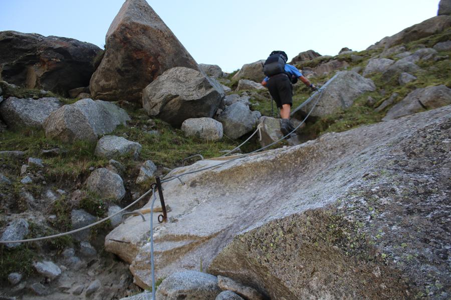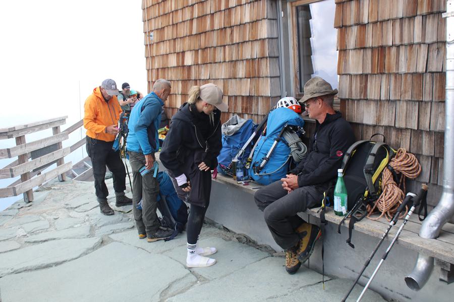 Montag 18.August: Ein Handy nach dem anderen weckt die Menschen, ein jeder versucht so lautlos wie möglich zu sein. Während Humprey in der Nacht die Toilette aufsuchte, überstand ich das verlangen danach. Noch vor dem Signal des Weckers stehen wir auf. Es ist 6.40 Uhr, ein Blick aus dem Fenster begeistert, ein Stahlblauer Himmel, ja wäre nicht dieser Heftige Wind aus Nord-Ost. Schneiden uns gleich hier Brot und Wurst. Auf dem Weg nach unten wird die Toilette aufgesucht. Gäste verlassen jetzt schon die Gaststube. Bestellen beim Chef Teewasser, wir dürfen uns selber am Buffet Wasser nehmen, zeigt auf die Tee Beutel. Wenn ihr wollt nehmt euch Marsch Tee. Setzen uns in das Stüberl, die Bonner bereiten sich wohl auf die Ausbildung vor. Hole eine 2 Tasse während Humprey einen Kaffee trinkt. Er klebt sich die Ferse am linken Fuß ab, zum Ende hin noch eine Blessur, auch außergewöhnlich. Schaue mir die Tour nochmal an, auf der Karte sieht es anders aus als nachher in der Realität. Die Rechnung beträgt 41.80 € Humprey begleicht 49.50 €. Auch die Chefin ist unglaublich Sympathisch, sie wünscht uns zum Abschluss eine Erfolgreiche Tour. Am Haus läuft eine Ausbildung mit dem Seil, wohl für Einsteiger. In wenigen Minuten ist das Hab und Gut gepackt, heute ist langes Textil angesagt. Humprey vermisst einen Handschuh. Kühl ist es im Hausgang, kein Wunder die Türe ist Sperrangelweit geöffnet. Die Schuhe werden im Warmen Schuhraum angezogen. Wohl auch sehr viele Privaten Hausschuhe sind hier deponiert. Während Humprey sich die Schuhe anzieht, sehe ich auf der Bank im Eingang einen einzelnen Handschuh, zeige ihn ihm, ja genau den vermisse ich. Ein Heli wird wahrnehmbar, kurz später fliegt dieser ein.