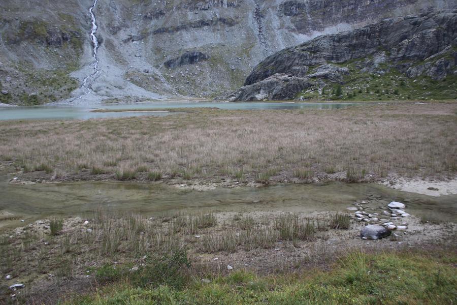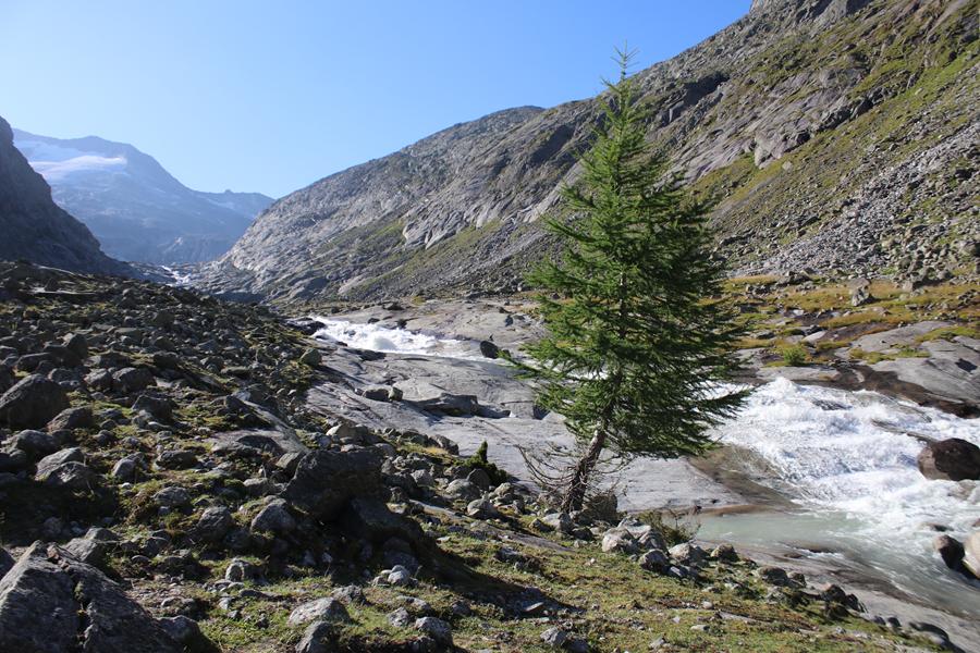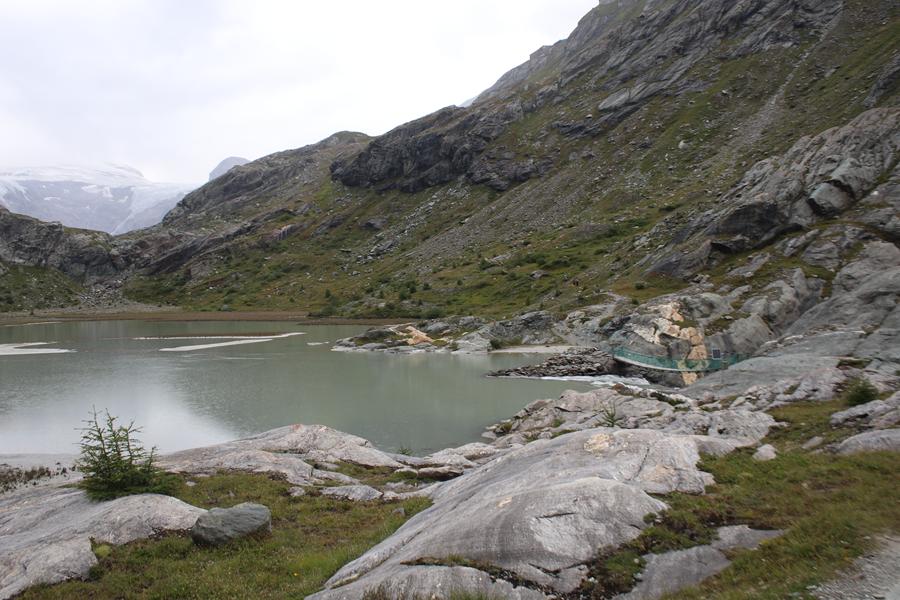 Eigentlich ist es ein Typischer Schuttberg. Relativ Gradlinig, der Aufstieg ist aber kein Grat eher ein Rücken. Das letzte Stück verläuft in der Wand. Ein Dickes Stahlseil zum Ende hin Ketten als Sicherung, scheint erst Neu Installiert worden zu sein. Ein Herr meines Alters heftet sich an die Fersen, mehrere Personen steigen ab, sicherlich starteten diese von der Fürther Hütte. Ein zahmer Aufstieg ohne Technische Finessen. Ein Metallrahmen gefüllt mit Steinen, das Gipfelbuch darf nicht fehlen. Larmkogel 3022 m, gestiftet von der Sektion Fürth. Es ist 10.52 Uhr. Links eine Fläche mit mehreren großen Steinmänner. Humprey und ein End zwanziger erreichen den Gipfel, er knipst uns unter dem Gipfelkreuz. Er besucht jedes Jahr diese Ecke, er beschreibt uns die Gipfel, er innert sich ganz gut wo einst der Gletscher endete. Die Alte Hütte wurde damals von einer Lawine regelrecht in das Tal gerissen. Genießen ein paar Minuten die Ruhe das Bisherige Traumwetter und natürlich das Panorama im Nationalpark Hohe Tauern. Flott verläuft der Abstieg mehrere Personen steigen auch mit Kindern auf. Sehr Gutes Internet. Ende ein Bild vom Glockner und Venediger in die Gruppe. Der Abstieg von der Scharte ist einfach, auch hier geht es anfangs durch Blockwerk, Teils ist der Weg mit Steinplatten ausgelegt. Die Sonne ist in Hochform. Humprey nützt diesen Tag der als sogenannter Ruhe Tag deklariert worden ist. Der Ausläufer des Hollerbachtal ist das erste dieser Tour, mit einem nur kleinen Gletscher im Talschluß, dieser speist den See. Stelle mir die Frage ob der Hütte mit einem Kleinen Wasserkraftwerk mit Elektrizität versorgt wird. Frage einen entgegenkommenden ob es auf dem Weg Wasser gibt? eher Rinnsale, recht hatte er mit Geduld füllt sich die Flasche. Hier auf 2670 m ist kein Netz mehr Verfügbar. Perfekt der Großklockner liegt genau in einer Scharte die jetzt den Blick frei gibt. Weiter geht es in Südlicher Richtung, Der See nimmt an Größe zu, wenn wundertes, wir nähern uns. So langsam gewöhnt sich der Körper an die Sonne insbesondere der Rucksack wirkt nicht mehr so schwer. Irgendwo im Hang gegenüber verläuft Morgen der Aufstieg zum Sandebentörl. Ein doch längerer Stopp an einem größeren Rinnsal, Relativ schnell ist die Flasche gefüllt. Als Humprey erscheint gibt er mir eine Tablette. Fülle den Inhalt in seine Flasche die große sperrige 1,5 l Flasche ist da nicht geeignet. Steuern genau auf den Abfluss der See zu. Der Hang ändert das aussehen Erste Pflanzen behaupten sich in diesem Gelände. Größere Bogen sind auszulaufen, wobei das Gelände nicht so steil ist. Erste Sträucher leider keine Blaubeeren. Ist das am Wasser ein Turbinenhaus? Personen halten sich am See auf, die Tische an der Hütte lassen sich auch schon erkennen. Die Pflicht geht zu Ende die Kür steht an. Zielstrebig Richtung des Wassers. Eine Alu Brücke als letztes Hindernis. Wolken ziehen auf. Zwischen den Steinen findet sich im Gras ein geeigneter Platz für eine Pause. Es ist doch 13.25 Uhr, geworden. Bis auf die Hose fallen die Kleider, etwas feucht der Untergrund. Die Sonne spiegelt sich auf dem Wasser. (Der Kratzenbergsee ist mit 24 ha Größe der größte natürliche Gebirgssee im Nationalpark Hohe Tauern und im Raum der Tauern insgesamt). Die Unterhose und das Funktionshemd werden im ca. 14°C kühlen Wasser gewaschen. Die ganze Palette des Vespers wird einverleibt. Radieschen Zwiebelröhrchen, Knobi, Chili, Berg Wurst, Salami, zum Schluss schneide ich das Rauchfleisch auf dazu das Brot von Humprey. Top Morgen besteht die Gelegenheit zum Einkauf. Das Textil trocknet so nebenbei. Eine Familie lässt sich ein paar Meter weiter nieder, stapfen ein wenig im Wasser. Zwei Wanderer kommen vom Gipfel danach wird es ruhig. Nach gut 1 Std. relaxen folgt ein kurzer Aufstieg zur Hütte, weiche vom Weg ab um das Wasserkraftwerk zu inspizieren, das abfließende Wasser wird geteilt ein Teil davon fließt in die Fassung. Über ein Dickes Stahlrohr ca. 40 cm Durchmesser fließt das Wasser in das Betonierte Gebäude, davor verjüngt sich die Leitung.