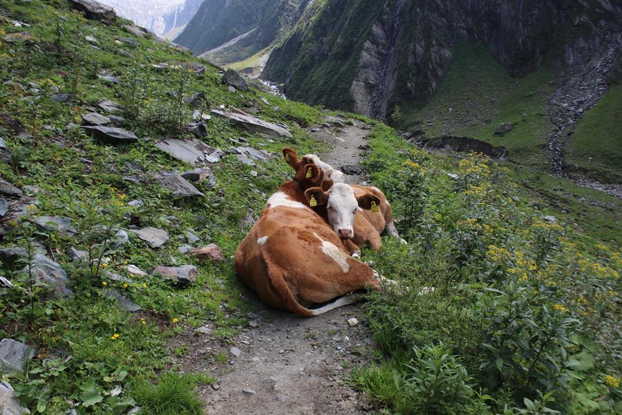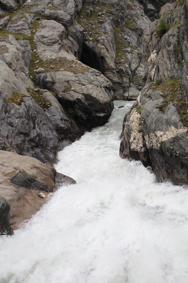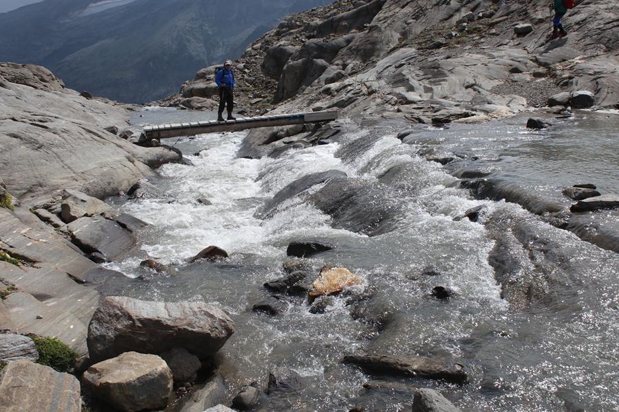 Montag 11.August: Humprey empört sich in der Nacht über das schnarchen von Christian, es wird etwas lauter Emotionen entstehen, gut dann steige ich ab, vermutlich schläft er um das zu vermeiden, die nächsten Stunden nicht mehr. Es ist mir wohl bekannt, gestört hat es mich nicht mittelbar. Die Geräusche des abfließenden Schmelzwassers des Gletschers wirken beruhigend auf die Sinne. Frage nach der Uhrzeit, es ist 7.15 Uhr, die Decke zusammenlegen über die Leiter absteigen, die erste Stufe ist gemeistert. Öffne das Fenster für einen Blick nach Süden, wie angekündigt haben sich die Wolken weitgehendst verzogen, Reste hängen noch tief. Die Sonne erhellt die Grauen Felsen. Stahlblau der Himmel. So kann ein Tag beginnen. Eng geht es zu, etwas Unstimmigkeit ist spürbar, mit der Vesper für das Frühstück geht es zwei Stock tiefer. Die Toilette wie üblich um diese Zeit belegt. Dieselben Gäste sitzen schon am Tisch, Redlich die Stimmung Typisch am Morgen. Die Gäste stehen am Buffet an. Christian bestellt beim Chef 1 Liter Teewasser, habt ihr kein Frühstück? In einer Edelstahl Kanne bringt er es sogar an den Tisch. 2 Tee Beutel sind ausreichend. Humprey kann nicht ohne Kaffee. Unterhalten uns mit der Frau und ihrem Sohn der etwas schüchtern wirkt. Die Spitzwecken sind schon etwas ausgetrocknet, mit Leberkäse und Camembert rutscht er besser durch den Rachen. Kurz vor 8 Uhr wird es ruhig. 2 Tassen Tee wohl nicht genügend Flüssigkeit. Studiere kurz die Karte.