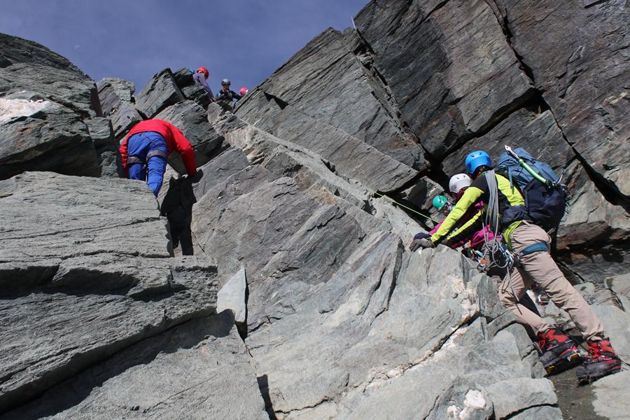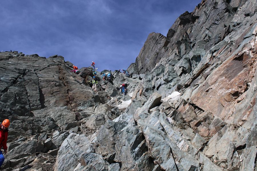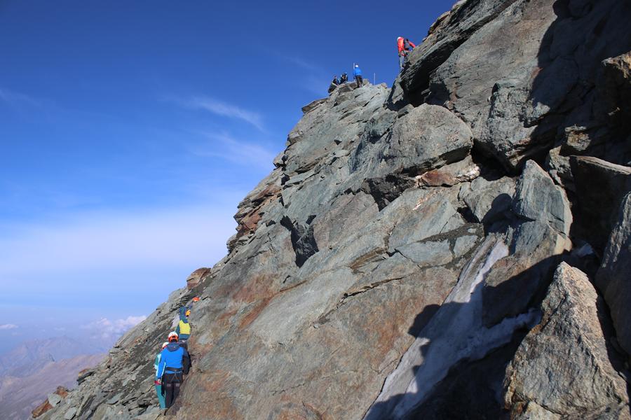 Bodo fühlt sich ganz gut. Schneefrei geht es erstmal über die Steinplatten, die Spur in Stein und Fels hebt sich deutlich ab. Mit leichtem Gepäck ist fast schon ungewohnt. Ein Rot Weißer Windsack weht Waagrecht der Wind kommt aus Norden, wählen eine Route von vielen aber relativ direkt zum Beginn des wenig steilen Schneefeld. 20 Minuten nach Start werden die Steigeisen mittlerer Weile geübt angelegt. Insgesamt klappt das recht gut, wobei es bei Bodo etwas komplizierter von statten geht. Schnell wird es im Bahnhof steiler. Die Spuren im Schnee sind deutlich ausgeprägt, wieviel Menschen sind es Täglich die ihr können unter Beweis stellen. Marco geht gleichmäßig wir haben keine Eile, die dünne Luft zeigt dem Körper eh die Grenzen. Der Schnee ist durch die Kalte Nacht Hart die Eisen greifen ein jeder Schritt ist hörbar. Wie vereinbart verzichten wir auf ein Seil. Marco Bodo benützt die Stöcke von Humprey Marco die eigenen, während wir mit dem Pickel Handtieren. Der Schnee endet am Dunklen Fels, der Gipfel liegt verdeckt, mehrere Spuren vereinen sich, keine Serpentinen das Gelände ist kein Sturzgelände ein Seil ist wahrlich nicht nötig, versetzt bewegen sich die Gruppen zum Einstieg geschätzt 1 Km von der Hütte, die Sonne könnte der Winner werden. Wir nehmen uns die Zeit, laut Wetterbericht könnte es am zum Spät Nachmittag zu Gewitter kommen. Relativ Zeitig unter einer Stunde legen wir im Stehen die Steigeisen ab. 2 Routen mit Dicken Hanfseilen sind gesichert. Die Stöcke Pickel und Steigeisen bleiben zurück an geeigneter Stelle hänge ich die Eisen an den Pickel der im Schnee steckt. Marco wählt die Route links, Humprey startet, ein Vater mit dem ca. 15-jährigen Sohn folgt am langen Seil, nur zögerlich was die beiden da abliefern, schaut weniger gut aus. Marco rät ab, da ein Stück bis zum Seil vereist ist. Warten Geduldig. Schleier Wolken zieren nun den Himmel. An guten Tritten fehlt es nicht das Tau ist natürlich absolut Hilfreich. Alina und Bodo erhalten den Vortritt, Bodo sichert sich mit einem Prusik von mir während Alina das Klettersteig Set einsetzt, die beiden kommen gut voran. Übergang in einen breiten Kamin hier wird es etwas kniffelig, ein Bergführer der links eingestiegen ist sichert seine 4 Kunden an einem Kurz Seil, steigen völlig unbedarft auf. Während Alina noch überlegt rate ich ihr, wenn es kritisch ist nicht weiterzugehen, der Aufstieg ist Technisch nicht schwierig, es Bedarf einer Überwindung. Folge den Voraus Steigenden, um den beiden dann ein Zeichen zu geben. Ja es waren zwei Schritte, locker geht es nun weiter, die Stelle wo es am Grat mündet ist ein Gelbes Schild, es gibt also eine zweite Route. Es scheint die Gruppe macht den Weg frei, nütze die Gunst schließe auf, die ersten im Abstieg begegnen, es kommt ins Stocken, an denn meisten Stellen gibt es eine Alternative. Schwierigkeit bis II. Brüchig die Südflanke mit Tiefenblick. Der Grat gut vom Schutt befreit wirkt sehr Stabil, eine Garantie gibt es nicht. Selten Kurze Gehstellen, vor dem Grat des Glocknerleitl die Schlüsselstelle hier staut es sich, wechselt die Gruppe in die Flanke der Südseite unter dem 29 m tieferen Kleinglockner, nur an wenigen Stellen ist Vorsicht geboten, auch die Hände werden zu Hilfe genommen. Welch Überraschung es steigt rechts auf eine Plattige Fläche, kurz danach stehen wir vor der Glocknerscharte, hier treffen Ab auf Aufsteigende resultierend ein Stau. Marco und Humprey sind quasi hinter mir, welch genialer Schachzug.