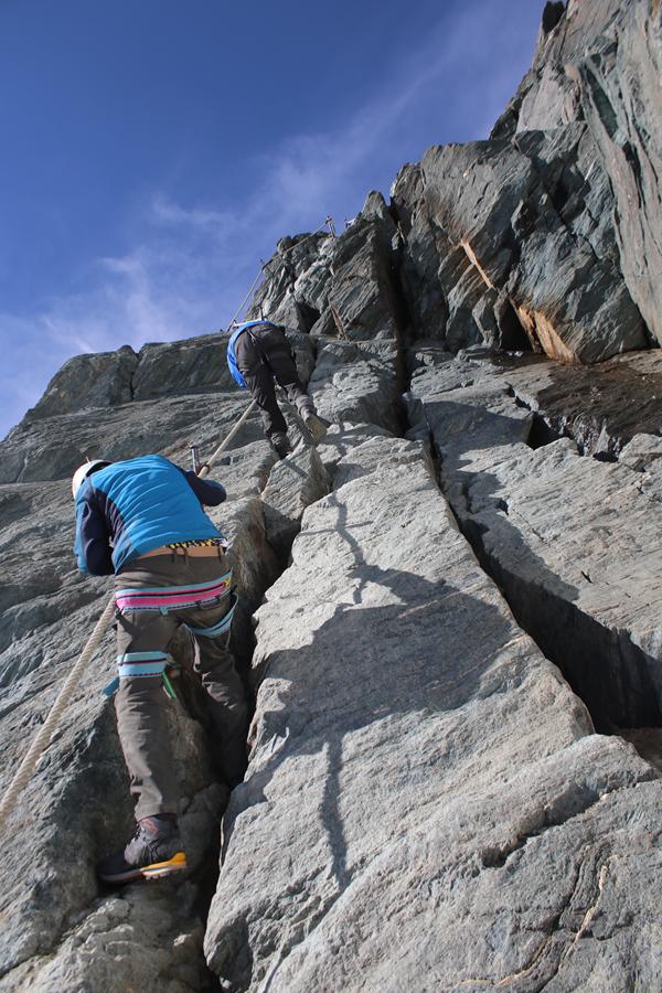 Dienstag 12 August: Warm ist es im Lager, schon sehr Früh wird es umtriebig, laut Humprey war es 4 Uhr. Ein kommen und gehen die eine oder andere Unterhaltung besonders störend. Um 6 Uhr, sind wir die letzten, an Schlaf ist nun nicht mehr zu denken. Ein Blick um 6.30 Uhr aus dem Fenster sorgt für Heiterkeit keine Wolke ist am Himmel. Wanderer erreichen vom Tal kommend die Hütte. Unterbreite meine Gedanken zur Tagesetappe, die Tatsache das diese Tour nicht begangen wird, dürfte es an Markierungen mangeln, zum anderen ist es die wohl fehlende Wegführung. Ein Risiko das sich jetzt noch vermeiden lässt. Lade das Handy vorsorglich auf. Mit dem Schreibzeug und Essen geht’s an die Rezeption, relativ wenig Betriebsamkeit, Frage wegen eines Transfers in das Tal, 18 € die nächste Fahrt ist um 9.15 Uhr an der Talstation des Material Lift. Gut wir melden uns hiermit für die Fahrt an. Frage wegen des Teewassers, ihr könnt es am Buffet nehmen, habt ihr eine Kanne, Humprey füllt diese mit Warm Wasser, Tassen finden sich setzen uns an die frische Luft auf die Terrasse. Der Mond steht über dem Fels Grat im Westen, der jetzt von der Sonne erreicht wird. Eine Gruppe mit 8 Personen in Kompletter Montur, Pickel Seil Helm startet gerade. Der Hund gibt sich mit der Wurst Haut zufrieden, schon Gewaltig wie beeindruckend die Umgebung, die Tour heute wäre ne echte Hausnummer gewesen. Nach einer ausreichenden Stärkung geht es an das packen. Das Seil ist so gut wie Trocken, alles Schwere liegt unten im Rucksack. In der Gaststube beginnt das Täglich Reinig machen. Es ist 8 Uhr, ein langer Tag steht bevor, mal sehen wie wir die Etappe Meistern.