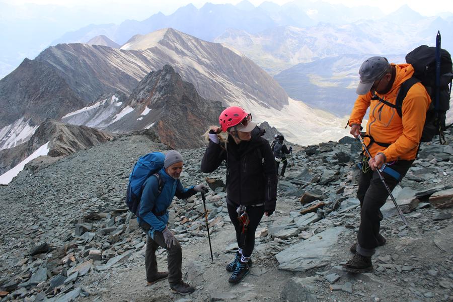 Majestätisch liegt der Formschöne Berg mit seinem langgezogenen wie scharfen Stütl Grat fast schon zum Greifen Nah. Die drei gehen an einer Wegteilung Richtung Stütl Hütte selbst auf ein Pfeifen reagieren Sie nicht, irgendwann eine Reaktion aufzurufen. Sie queren über die Wiese. Auffällig schmal und Tief der Weg, der Körper kommt auf Touren, jetzt in der Gruppe läuft es sich durch die Ablenkung etwas leichter. Eine einzelne Gämse gar nicht weit entfernt, schon eine Rarität auf dieser Berg Woche Das Tal wird schmäler die Sicht wird eingeschränkt. Bodo bestimmt das Tempo. Ein einfaches Gelände das Grün verloren geht. Eine zweite Weggabelung es sind noch 3 ½ Std. Die letzten Pflanzen gedeihen zwischen den Steinen im einstigen Gelände des Gletschers. Trotz fehlender Markierungen ist die Wegfindung gut Wahrnehmbar. Queren etwas Oberhalb des einstigen Gletschers eine doch längere Zeit. Viel Bruch über dem Eis der dadurch Konserviert wird. Nützen das Eis lose Gelände solange wie möglich. Genau nach 2 Std. Aufstieg wird ein günstiger Platz mit Steinblöcken zum Sitzen für das Anlegen der Ausrüstung gewählt. Oberhalb loses Blockwerk Vorsicht ist geboten, zwei Personen sind weiter oben Östlich Sichtbar. Marco stellt die Frage ob es sinnig ist gesichert zu gehen, Gurt und Seil, die Abstimmung fällt gegen das Sichern aus. Eine Weitreichende Entscheidung. Alina hat ein Problem mit dem Riemen des Eisens. Absteigende gehen Teilweise auch ungesichert. Fast 30 Minuten inklusive einer Paus in einer fast Einsamkeit. Kurz nach 11 Uhr, bei nun zunehmender Bewölkung ist erstmal das Ziel die Bergwerkscharte. Wo diese liegt ist noch Unklar. Die Materialseilbahn ist und bleibt nun Östlich. Die Steilheit Moderat, die Gletscherbrille tönt die Natur in ein anderes Licht. Marco öffnet sich zweimal das Steigeisen auf seinen schweren Stiefel, erst ein Nachstellen sorgt für Abhilfe. Von Links der Stüdl Hütte nähern sich Personen. Eines Typischen knarren, wenn die Zacken der Eisen greifen. Absteigende werden nun Sichtbar, die Scharte ist Nord Östlich verdeckt Rechts türmt sich die Wand über 3000 m unter den Blaue Köpfe. Eine Spur wird in der Ferne Sichtbar das sollte unser Ziel sein. Wenige Spalten dennoch wird der ein oder anderen ausgewichen. Relativ geradlinig die Route etwas Schmelzwasser fließt über das leicht verunreinigte Eis des Ködnitzkees. Eine Felsrippe wird oberhalb passiert. 11.50 Uhr, Übergang in den Schnee mit Spaltengefahr Treffen perfekt auf die Route die von der Stüdl Hütte kommt, etliche sind nun im Abstieg treffen auf die Aufsteigenden jetzt beginnt wohl die Rushhour. Das Wetter ist noch immer gut gesind, ein Kessel öffnet sich mit steilen Schneefreien Flanken, in der Mitte steht die Adlersruh die wie ein Horst am Grat thront. Es wird im tiefen Schnee steil, das kostet dementsprechend Kraft, da zeigt sich wer Fit ist. Beim näherkommen sind Absteigende im Mürztalersteig zu sehen, die Wand schaut aus der Perspektive spannend aus. Marco erwischen einen Guten Moment bei der Ankunft es ist 12.03 Uhr, es findet sich eine Gute Stelle für einen Stopp und ablegen der Eisen, das sollte es gewesen sein mit dem Schnee.