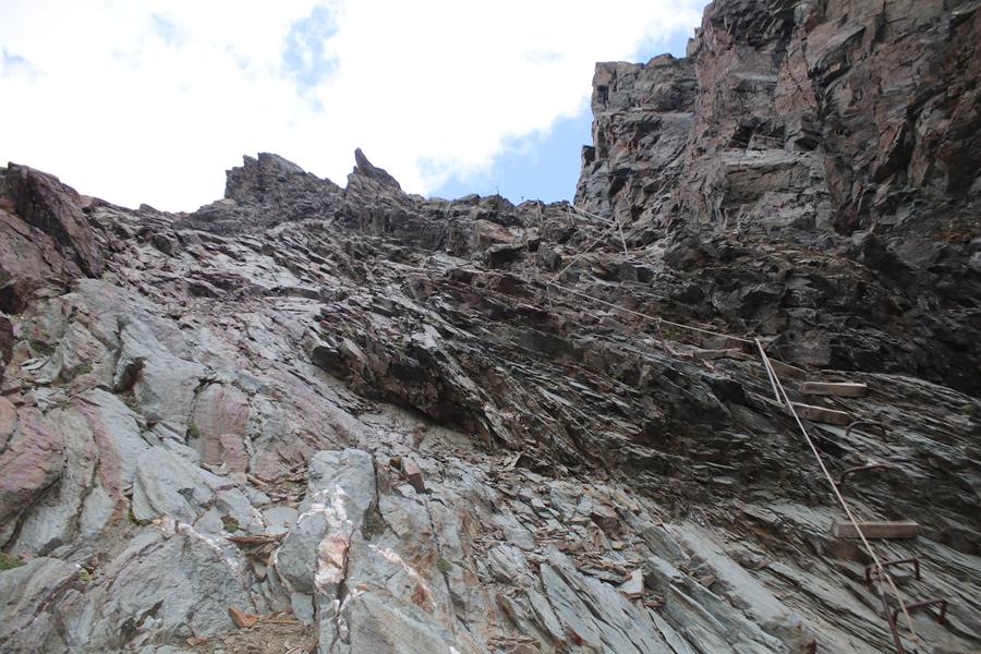 Eine Pause zum inne halten tut gut, Es ist ein Stück arbeitet das lässt sich nicht nur bei den drei erkennen. Etliches Klettern ab, interessanterweise auch mit Eisen und Seilversichert. Stahlseile im Felsen als Sicherung, es quert kurz im Einstieg insgesamt sind es wenige Minuten im Durchstieg. Beobachten genüsslich das Treiben. Der Körper ist Fit nur leicht verschwitzt erholt sich sehr schnell. Ein paar Minuten später 12.15 Uhr, sind wir komplett. Ohne dass es jemand bemerkt steigt Marco ein. Kurze Frage in die Runde ob ihr bereit seid. Alina möchte den Gurt anlegen. Eine Lücke nütze ich zum Einstieg, schon nach wenigen Bewegungen ist klar, kein Problem, das Gelände bietet genügend Griffe und Tritte auch ohne Sicherungen. Teile ihnen mit es ist ein leichter Steig A-B. Es sind im Aufstieg nur ein paar Minuten für die „Schlüsselstelle“ überhole zwei Czechen einer etwas schwerfällig hat so seine liebe Not. Marco verweilt auf einem Stein sitzend die Wasserflasche am Mund. Über den Felsen fließt reichlich Wasser erlabe mich daran, es ist hier eine wenn auch schräge Fläche mit mehrheitlich Schnee, links zieht der Grat im Kampl Hoch. Marco startet nach dem eintreffen der drei, Füllen die Wasserflaschen auf der Hütte sei das Wasser Unbezahlbar. Teile Magnesium Tabletten aus nach einer kurzen Pause gehen wir weiter. Bodo wird das Meistern das schaut bisher ganz gut aus. Auch der Wetterbericht meldet erst später Gewitter. 200 Hm sind es in etwa noch, die Absteigenden wählen die direkte Route durch den Schnee, Bodo startet Humprey wählt einen Rechtsbogen zum Grat. De Schnee ist verfestigt trägt noch gut, kleinere Blöcke und Steine ragen hervor. Am Grat wird der Blick nach Süden Frei, sogar das Lucknerhaus ist sichtbar, die Erstellung der Materialseilbahn ein sicherlich Kostspieliges Unternehmen. Nach wenigen Minuten zweigt ein Abstieg über das Blaue Schartl zu denselben Hütten ab, ebenfalls schwarz markiert. Gutes Gehgelände deutlich die Weg Spur, geprägt von unendlich vielen Menschen. Auch die Salm Hütte/n sind am Ende es langen Leitertal Sichtbar. Interessant wie „einfach“ doch diese Route obwohl Stellen I-II darunter sind, an den wichtigen Stellen auch Stahlseile klar auch die Hände kommen zum Einsatz, nur selten ist es richtig Luftig. Nur wenige Menschen begegnen der erste Schwung ist durch.