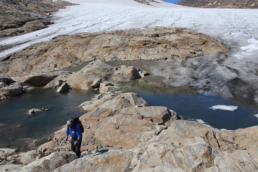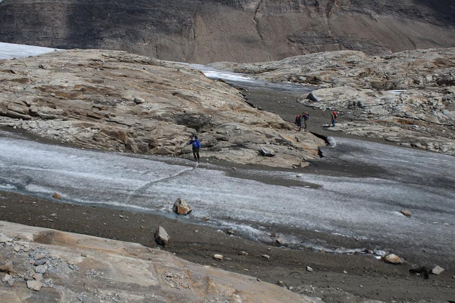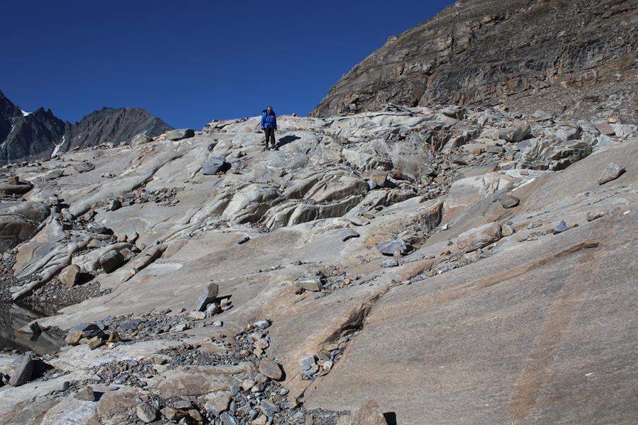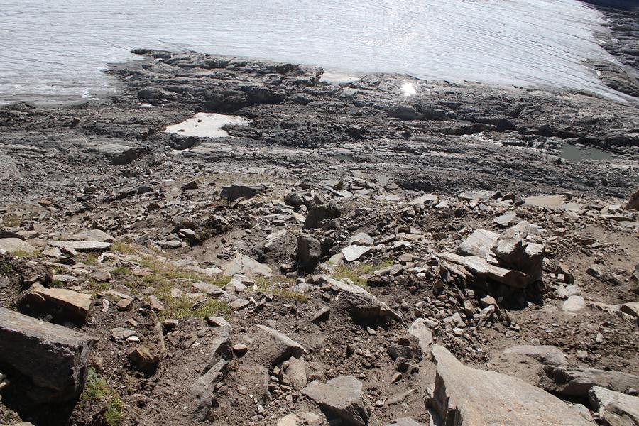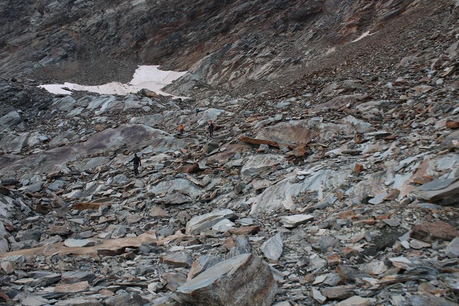 Marco ist einige Meter höher, wir können die Gletscher Ausrüstung ablegen. Etwas Unorthodox das ablegen in dieser Stelle. Bodo müht sich mit der Schlaufe der Eisen. Warte bis er soweit ist bis auch ich ablegen kann. Ein Pickel lehnt an der Wand, sicherlich hat es einen Grund. Humprey steigt zu den anderen auf. Abklopfen der Eisen so gut wie es geht, die Gummi Stöpsel auf die Zacken rein in den Beutel, da Seil ist feucht kommt zum Schluss in den Rucksack. Diese Aktionen kosten Zeit, klar das Wetter wird beobachtet noch hält es. Die Bedienung die aus Holland stammt, ist auf dem Rückweg. Die Route in dieser Schuttflanke ist unerwartet gut, eine große Blaue Metallbox steht am Boden, leichte Kletterei und Gehgelände auch Stangen zum Sichern sind Installiert, kein Wunder auf über 3000 Meter liegt in der Nordseite lange der Schnee. Es sind nur wenige Minuten bis in die Scharte 3183 m, die Wand ist sehr Brüchig daher Steinschlaggefährdet. In einer sehr breiten nicht zu steilen Rinne ist wohl ein Klettersteig Installiert. 13.18 Uhr. Marco ist auf dem Weg nach Unten Alina folgt ihm in dem Sie sich mit dem Gurt sichert. Ein letzter Blick zur Pasterze und der Oberwalder Hütte. Morgen werden wir nach einem langen Tag dort zu Gast sein. Auch Bodo setzt den Gurt ein, ein Fast durchgehendes Tau Holzstufen und Trittklammer die ganze Palette an Hilfsmittel, wie es scheint findet Alina in dieser guten unerwartet sicheren Route gefallen, sieht von der Nutzung des Gurtes ab. Klar Vorsicht wegen der Vorrausgehenden ist Voraussetzung. Die ersten sind unten ausgestiegen es flacht etwas ab. Es quert auf der Linken Seite bis fast an den Felsen. Eine Wand wird über Trittbügel abgestiegen. Eine Schuttpassage ist mit Stufen die an zwei Seile gebunden ist überwunden, Lose die letzten Meter an der Wand entlang, die Anspannung weicht. Warum eine Box vor der Scharte seine Berechtigung besitzt ist nun klar geworden. Während die anderen dem ausgeprägten Weg im Schutt folgen, nütze ich den Weichen Untergrund für einen flotten geradlinigen Abstieg, es quert leicht fallend Östlich, die Rinne wird breiter öffnet sich, hier war einst der Hohenwartkees davon ist nichts mehr übrig, geblieben. Die Orientierung ist ohne Markierungen nicht einfach, mit Weitblick findet sich ein Steinmann. Blöcke Platten Steine teils auf geschliffenen Untergrund, der Ganze Kessel ein Relikt der Erosion diese setzte hier gewaltig zu. Marco legt eine Pause, allzu lange sind wir nicht mehr Unterwegs. Jetzt können wir definitiv die Ausrüstung ablegen. Die Stimmung positiv, liegt das an einem ersten Blaues Loch im Norden. Ein Blick zurück lässt überhaupt nicht erahnen das sich ein so guter Durchstieg findet. Östlich ist nun ein Teil des Gletschers noch erhalten. Große Steinmänner sind Hilfreich, endlich endet dieser Steinbruch. Übergang in erdiges Gelände die ersten Pflanzen finden ihren Lebensraum. Es beginnt zu Tröpfeln der Schirm kommt zum ersten Mal zum Einsatz, das spricht für ein gutes Wetter die letzten Tage, nähern uns dem Schwerteckes die Hütte ist noch immer nicht zu sehen.