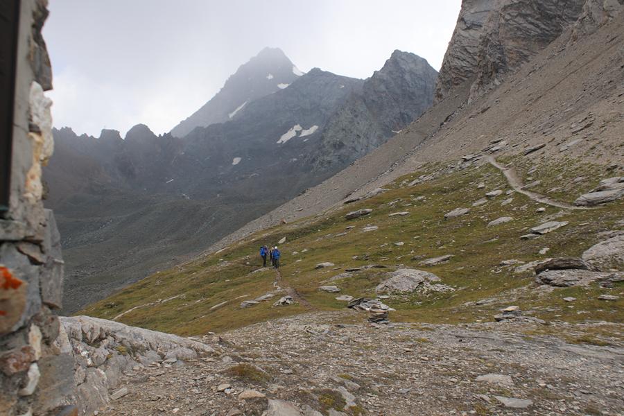 Donnerstag 14.August: Sehr früh ist es etwas unruhig. 5.45 Uhr, das Handy von Humprey gibt das Signal zum Aufstehen. Es dauert ein wenig bis wir uns aufrichten, So leise wie es nur möglich ist, wird alles im Rucksack verstaut, es dämmert schon es geht auch ohne Licht, es scheint so, dass die Luft die durch das Fenster dringt nicht so kühl ist. In der Küche brennt schon Licht schaue kurz in den Raum, Theresia ist schon aktiv. Bereit das Frühstück vor. Wir stellen die Ausrüstung im Vorraum ab. Pickel und die Schuhe holen wir aus dem Schuhraum, es ist kühl waren da die Fenster und Türen offen. Sebastian geistert fast unbemerkt durch das Haus. Frage nach, ob in der Nacht noch jemand die Hütte erreichte? Nein! Ein Kräftiger Schluck Wasser aus dem Hahn. Der Obligatorische Toilettengang. Bedanken uns für die Bewirtung, mit den besten Wünschen sagen wir Good bye. Die Kamera hält mit Bildern von uns, diesen Augenblick vor dem Eingang fest.