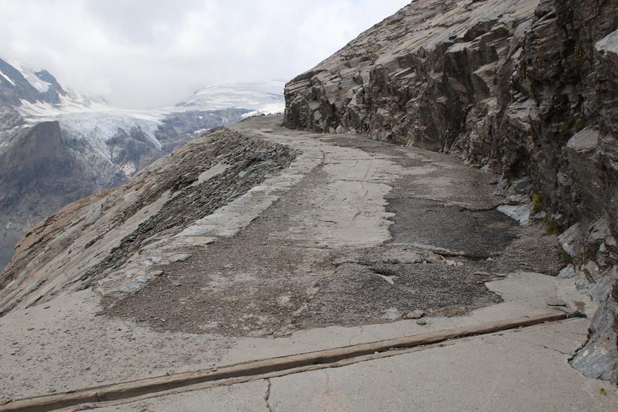 13.35 Uhr, die 2 Etappe steht an. Dunkel der erste Gamstollen der aus dem Felsen gesprengt wurde. Sämtliche Stollen sind mit Längenangabe, Info Tafel teils auch Musik Unterhalten die Besucher, Tropfen fallen von der Decke, warme Luft zwischen den einzelnen Stollen mit Blick nach Süden. Hier wurde einst mit einfachen Mitteln Pionierarbeit geleistet. Es steigt fast unbemerkt an, mehr Menschen als gedacht sind Unterwegs angezogen von einem Art Freilicht Museum. Nach dem 4 Stollen wird auf Steinschlaggefahr hingewiesen eine Kette kann überstiegen werden. Plattig und Steil ein Teilstück hier könnte es Gefährlich sein. An wenigen Stellen liegt Schnee am Weg, der ist sicherlich erst abgerutscht. Ausgebaut wie eine Straße der Weg. Aus Mehreren Eismassen fließt Schmelzwasser, Wolken ziehen über die Berge verhüllen den Glockner immer wieder. Dieser Weg konnte gestern gut eingesehen werden, ja ein Tag später gehen wir einem neuen Ziel entgegen. Immer wieder begegnen Absteigende meist aus dem Ostblock ist da ein zwischen Stopp einer Busreise? Humprey kann mein Tempo nicht gehen, warte ab und an. Heute agiert er nur mit einem Teleskop Stock, der zweite lässt sich nicht mehr fixieren, schaut schon Merkwürdig aus. Prächtig die Kulisse, Rätsle ein wenig über den Zustieg zum Adlerhorst, bekanntlich führt dieser Richtung der Hohenwartscharte, diese ist auch erkennbar. Der Fahrweg endet an einer schönen Anlage mit Bänken und Tischen Toller Blick in die Eismassen der Pasterze.