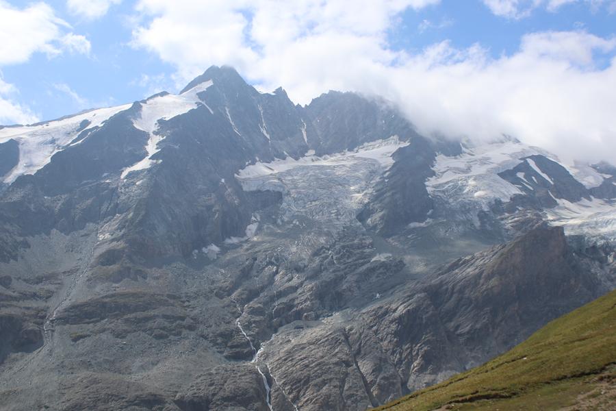 Freitag 15.August: Regen prasselt Donner ist wahrzunehmen, eine Person schließt das Fenster. Hoffentlich hatten die Nachzügler einen Überdachten Schlafplatz gefunden. Kurz später stehen die Zimmer Nachbar mit unglaublicher Rücksicht auf. Es ist selbst im Tief eingeschnitten Tal schon etwas Hell. Es ist wohl 7 Uhr, als das Handy von Humprey das Zeichen zum Aufstehen Akustisch vermittelt. Heute geht’s auf den Gletscher daher langes Textil, das Wetter als solches schaut gut, zumindest im eingeschränkten Bereich des Ködnitztal. Laut Wetterbericht steigt das Gewitterrisiko ab 13 Uhr. Nach dem Toilettengang treffen wir uns um 7.10 Uhr, im Frühstücksraum mit den Panorama Fenster. Stahlblau der Himmel mit etwas Schleierwolke. Reichlich Auswahl am Frühstücks Buffet, weit über dem Niveau einer Berg Hütte. Wurstsalat mit Frischen Wecken O-Saft und Milch. Humprey Butter Marmelade und Wecken. Die kleinen Tische sind alle ausgelastet. Ein kommen und gehen. Eine Bedienung bewerkstelligt den Service. Lade das Handy im Stüberl auch hier sitzt eine Gruppe beim Frühstück. Aktualisieren der Notizen. Studiere die Karte wegen des Aufstiegs von ca. 5 Std. Der Rucksack ist binnen weniger Minuten gepackt. Zähne Putzen die Bürste und Zahnpasta findet sich in der Außen Tasche. Ein kräftiger Schluck Wasser am Morgen ist kein Fehler. Schnappe den Rucksack um ihn auf der Terrasse abzulegen. Es ist 8 Uhr, wer sitzt denn da auf der Feuchten Natur Holzbank, Alina und Bodo. Schwitzend aber Hellwach von einem 50 Min. Aufstieg, übernachtet hatten sie am Lift Gebäude des Materiallift. Bodo fühlt sich gut, ihm kommt die Schlüsselrolle zu. Marco trinkt laut den beiden einen Kaffee. Humprey ist schon Start klar, Schuhe anziehen und den Pickel am Rucksack sichern. Allgemeine Aufbruchstimmung der Hütten Gäste. Die Alpenverein Aktiv App wegen der Aufzeichnung starten. Während ich mit Marco einen Plausch abhalte starten die drei um 8. 20 Uhr, in einen spannenden Tag, das Wetter sollte bis 13 Uhr halten. Setzen die Unterhaltung während des Gehens auf dem Wanderweg 712a in einer schönen Kulisse fort. Über 1200 Hm gilt es zu bewältigen, dass Zeil als solches ist nicht sichtbar. Anfangs Links unter dem Materiallift danach lange Zeit rechts davon.