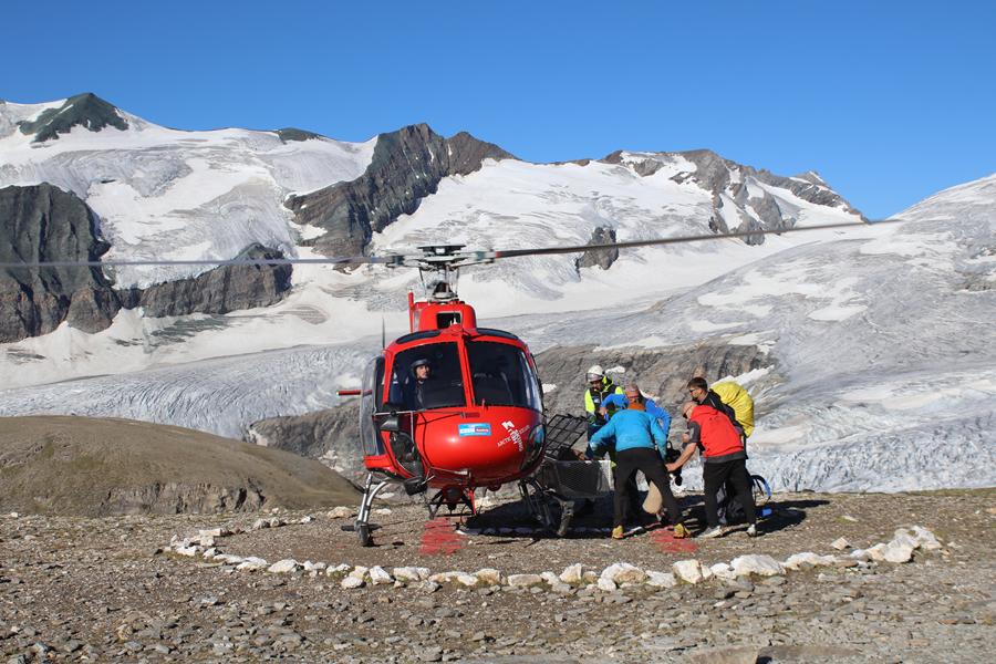 Nur wenige Meter von der Hütte entfernt setzt das Rote Fluggerät auf erzeugt Heftig Wind. 3 Männer und Co Pilot entsteigen mit geducktem Körper. Entladen diverse Gegenstände, schnell wird klar, das sind Monteure für die Photovoltaik Anlage. Jetzt am Morgen wirkt der Glockner wie eine Pyramide wobei aus dieser Perspektive eine ähnliche Festgestalt die Sicht nimmt. Von hier schaut der Aufstieg fast Dramatisch aus. Kurz später landet er ein zweites Mal. wiederum sind es 3 Personen die abgesetzt werden. Als Humprey erscheint starten wir um 8.53 Uhr. Die Sonne steht schon recht hoch, auch der Kalte Wind ist nun abgeschwächt. Zielstrebig entfernen wir uns wohl von dieser Tollen Hütte, diese wird mit der Neuen Fürther Hütte um die Gunst der Besten Hütte dieser Berg Woche buhlen. Nur 2 Minuten sind es bis in den Hütten Klettersteig. Gestern zum Ende der Tour waren die Kräfte etwas geschwunden, heute bei Top Bedingungen ein reines Schaulaufen. Die Handschuhe am noch kalten Stahlseil in doppelter Hinsicht Wertvoll. Der Heli Transportiert einen großen weißen Materialsack, beim nächsten Transport nur wenig später, sind es wohl die Paneele. Sicherlich startet der Transport um die Franz-Josefs-Höhe. Folgen ein Stück des Weges um dann relativ geradlinig über Schotter und Blöcke den Gletscher zu erreichen.