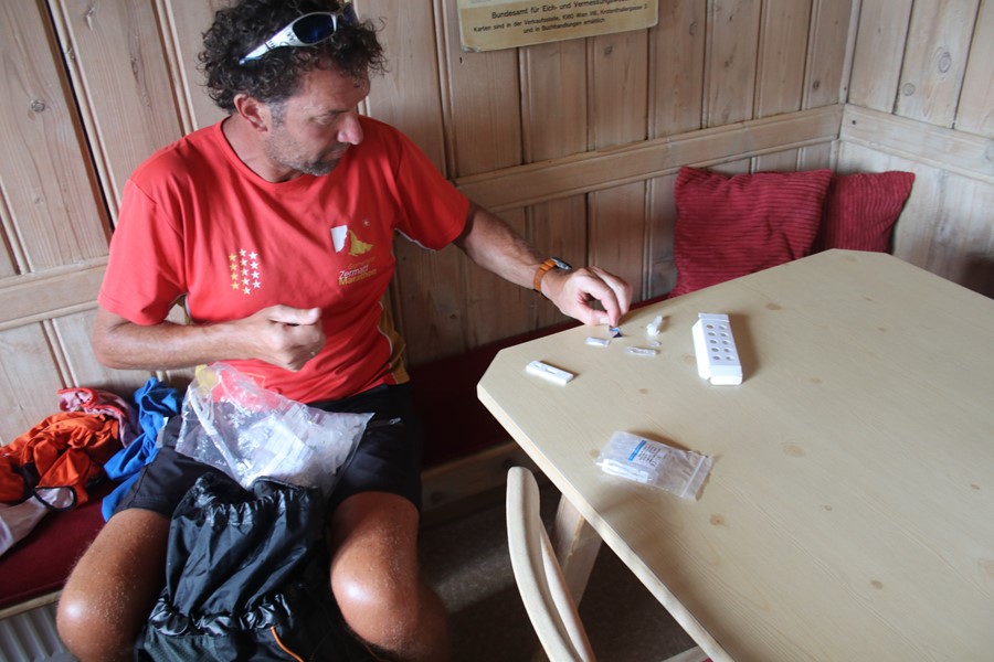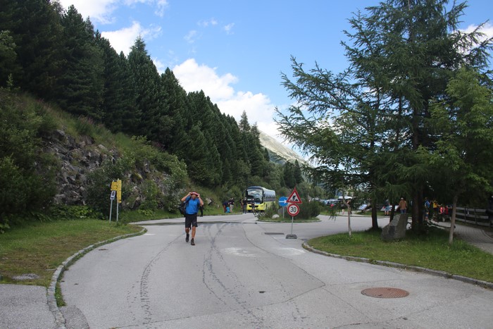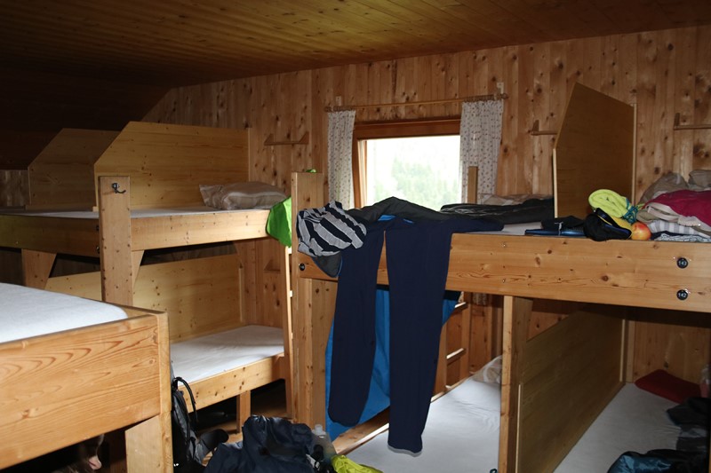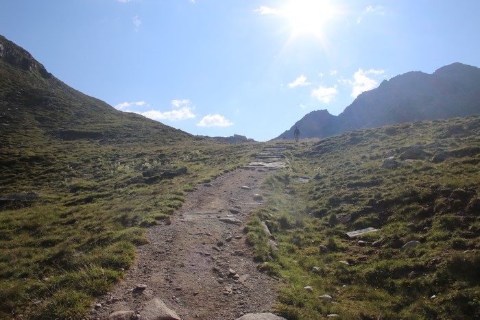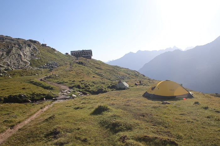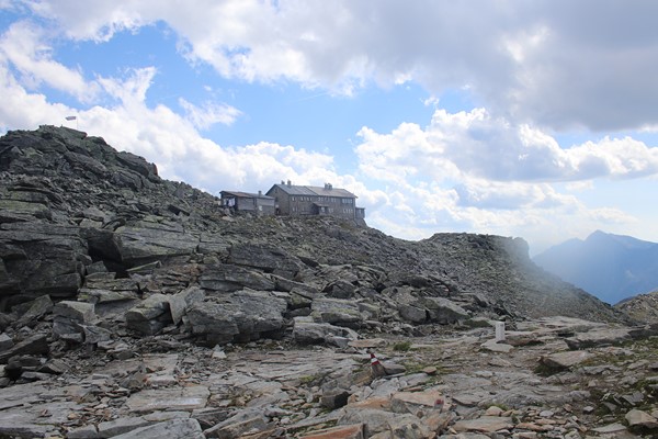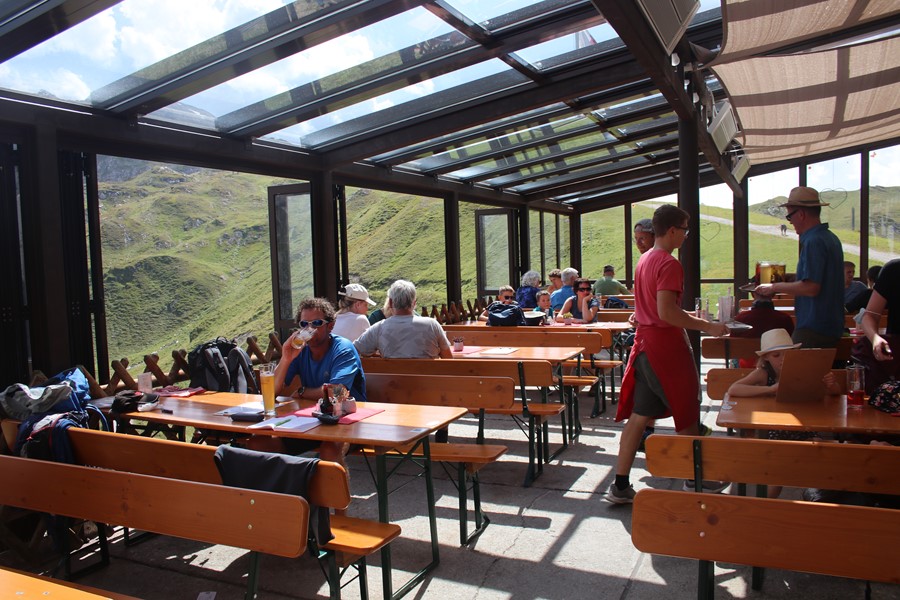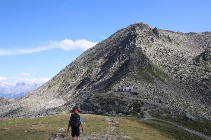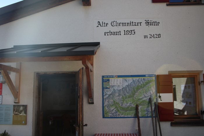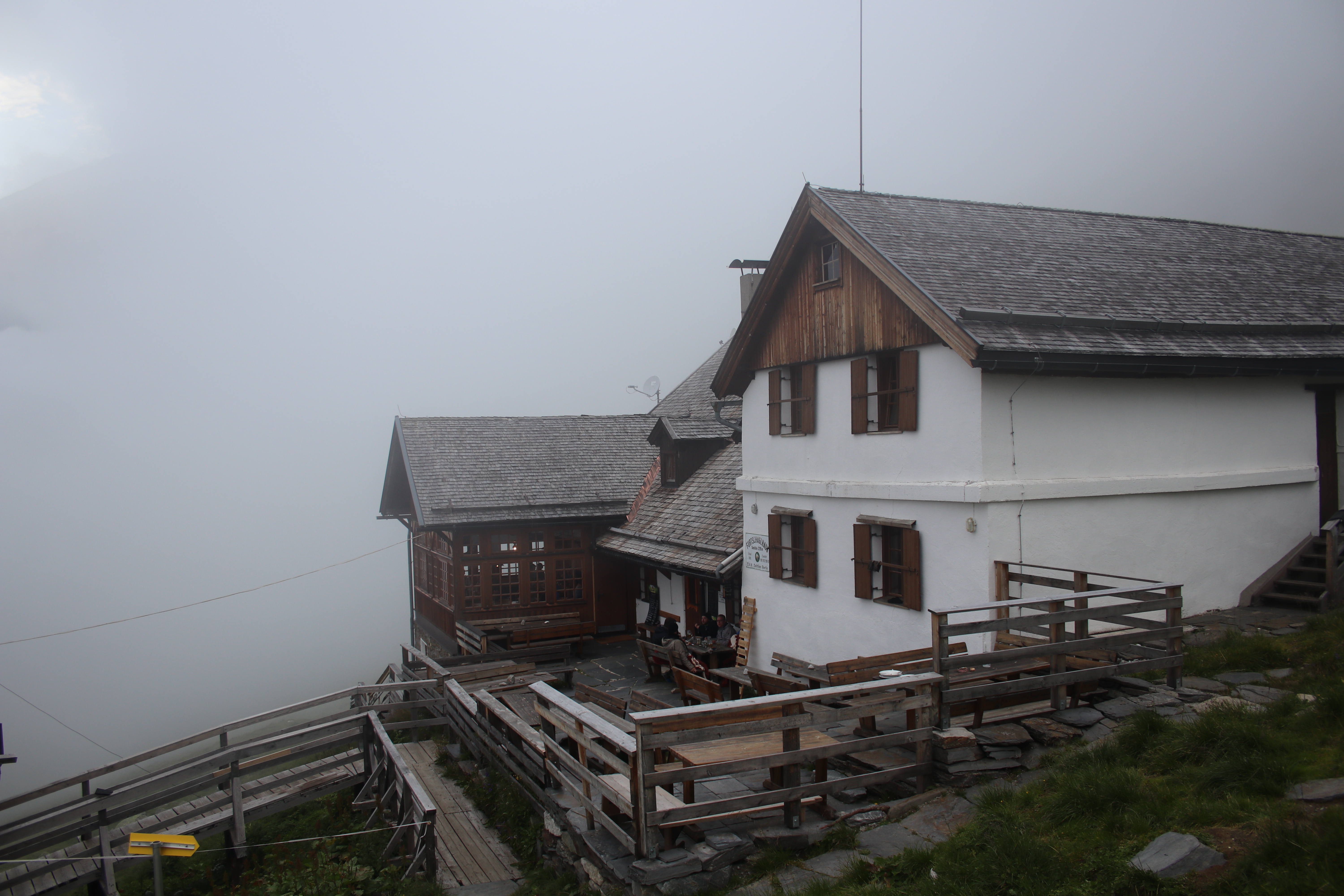 Die Hinweistafel auf die Hütte wohl ein Späßchen. Ein Steinmann vor der Hütte gefällt besonders gut. Wurle flaniert derweilen auf der Sonnenüberflutenden Terrasse. Nett Urig der erste Eindruck, das Schutzhaus scheint mehrmals erweitert worden zu sein, Gäste verteilen sich an den Tischen, es ist 16.51 Uhr, 2 Std. 21 Min. das ist doch in Ordnung, Wurle war noch flotter Unterwegs. Auf 2295 m , steht die Hütte der Sektion Berlin, wohl im Schatten des Prunkbaus, das in 7 Std. erreichbar ist. Rucksack abstellen Schuhe und Socken entledigen. Freundlich das Personal, ein Russ für den Flüssigkeitsaustausch. Erhalte das Getränk und ein Holzklötzchen mit der Nummer 1001, später wird er uns das Lager zeigen, das Getränk weniger Süffig, Als Bodo um 17.15 Uhr, eintrifft steht für ihn und Christian der 10 Minuten danach am Ziel ankommt, auch eine Russ bereit. Ein checken Raum 10 im 1 Stock, Heimeliger Raum ein Doppelstockbett für 2 Schlafplätze pro Ebene daneben ist ein Doppelstockbett in Decken gehüllt wohl wegen Abstandregel. Unter dem Fenster 4 Lager Boden eben. 10 Personen könnten Untergebracht werden. Christian und Bodo schlafen unten. Verschachtelt die Hütte liegt daran das die Hütte seit 1888 mehrmals erweitert wurde, nie richtig Saniert. Statistik zum Aufstieg. Weglänge 6 Km bei 624 Hm. Zeit in Bewegung 2 ¼ Std. Vermehrt ziehen Wolken auf die Temperatur 14°C. Als die Sonne vermehrt verdeckt ist bleibt keine Wahl. Im schmucken Hellen Holzverkleideten Nebenzimmer ist an einem Tisch ausreichend Platz. Christian bestellt einen Johannisbeersaft Schorle. Ein Angstellter stellt die Frage ob wir gleich oder später Essen, es sind zu viele Gäste um sie auf einmal zu bewirten, Klare Ansage wir warten gerne. Bestellen 3x Kässpätle mit Salat, für mich das selbe Gericht als AV Essen ohne Salat. Spagetti wäre die Alternative gewesen, doch die nächsten 3 Nächtigungen sind auf Italienischer Seite. Die Portionen eines Bergsteiger nicht würdig, Gescmacklich gut dazu Knobi und Chili, dazu ist der Salat nicht gewürzt.