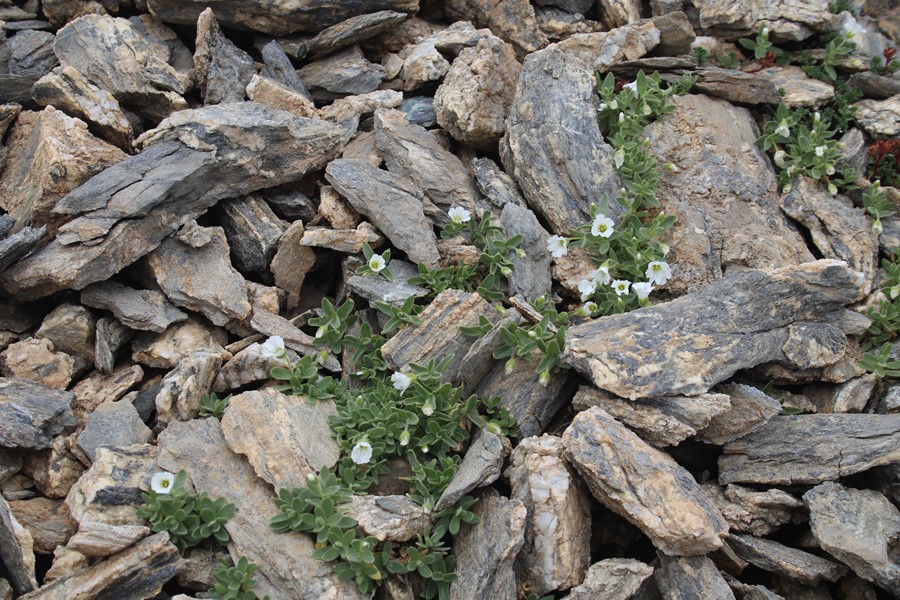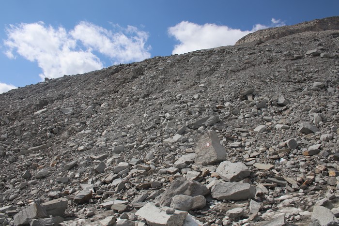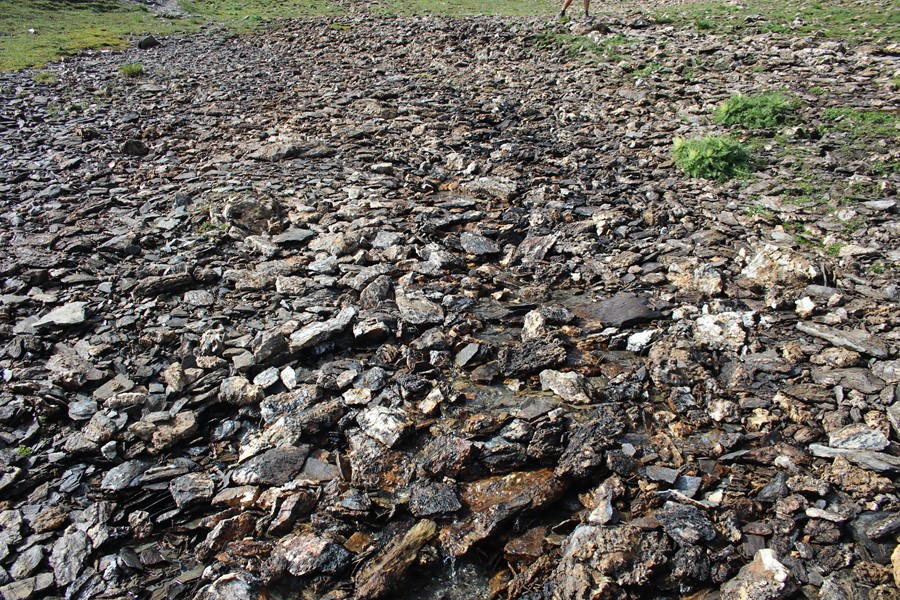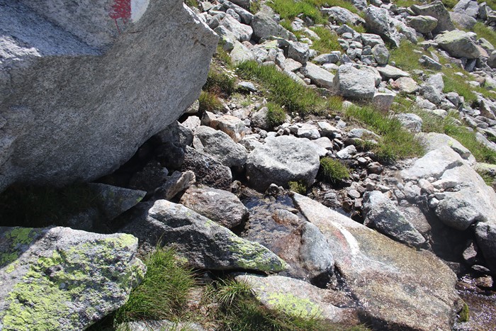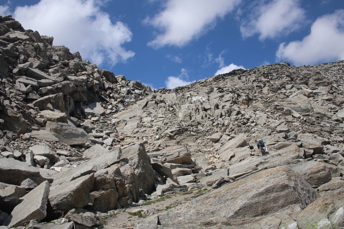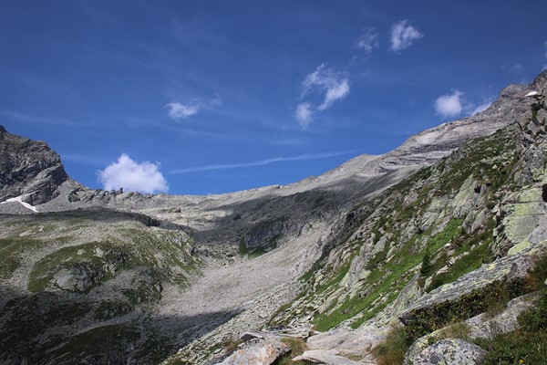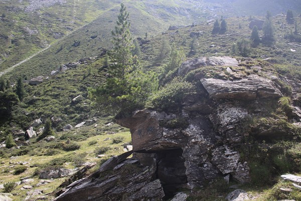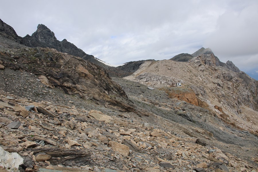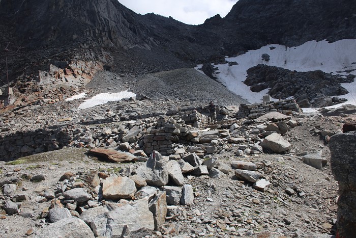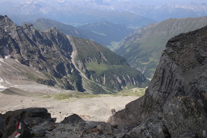 Rot Weise Markierungen ca. 100 Meter vor der Scharte Wegteilung der Alte und Neue Weg. Sehr viel kleines loses Steinwerk auf dem Weg, die Schritte sicher setzen, es geht aus der Rinne an die Rechte Felswand, ganz schön Anstrengend. Wurle überholt die beiden wenig später gelingt es auch mir, kurz nach Wurle ist die Alpeinerscharte um ziemlich genau 12 Uhr, also nach 3 ½ Std. erreicht. Windig und kühl auf 2959 m. Eine Wohltat den Rucksack abzustellen, verschwitzt der Rücken. Der Abstieg auf eine Fläche schaut ja Heiß aus. Tief unten das Langgezogene Valsertal das in St.Jodok am Brenner beginnt. Blick zurück ein kleiner Teil des Stausee ist zusehen, was treibt Christian jetzt gerade? Im Wind ist es unangenehm, suchen Schutz etwas Unterhalb.. Eine Mobile Datenverbindung herzustellen scheitert. Ein Snickers als Belohnung die Wasserflasche wird in einem Zug getrunken. 2 Gemsen lösen weit Oberhalb einen Steinschlag Richtung Abstieg aus, die Steine poltern krachend in die Tiefe, zum Glück steigt gerade niemand auf oder ab. Wurle vespert eine Kochsalami dazu Nüsse. Kurzer Plausch mit Mutter und Sohn, die wenig später starten, in kürze entschwinden sie den Blicken. Bodo ist nicht zusehen ist wohl vom Fels verdeckt. Die Karte lässt nicht genau erahnen wo die Hütte liegt. Eine Metall Konstruktion und verfallene Gebäude was mag da wohl Betrieben worden sein? Als Bodo sich um 12.21 Uhr erholt hat, folgt der Abstieg. Wurle schreitet voran, Bodo folgt, Bröselig der Untergrund. Das Ehepaar ist weiter unten rechts etwas entfernt unter der Felswand. Leicht Rechts durch den Steinbruch bestens Markiert. Die Steine auch Loose, vor der Felswand relativ geradlinig auch mit Seilsicherung. Anfangs Steiler legt es sich zurück. Wie im Aufstieg gibt es 2 Varianten, sicherer im Abstieg führe ich die Jungs durch das Labyrinth, wähle die alten Markierungen entfernt der Steinschlag gefährdeten Alternative, schneller als gedacht endet diese Passage. Ein Vergitterter Stolleneingang Rechts, Links endet auf dieser Höhe die Altschneefelder. 1941 wurde eine Mine mit samt den nötigen Bauwerken für den Molybdän Abbau erstellt. Auf der Höhe der Geraer Hütte standen die Baracken der Zwangsarbeiter, wobei es nie zu einer Inbetriebnahme gekommen ist, nach dem sich die Verhältnisse Normalisierten, wäre der Abbau nicht mehr Rentabel gewesen.