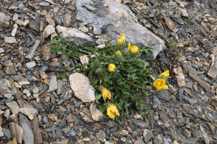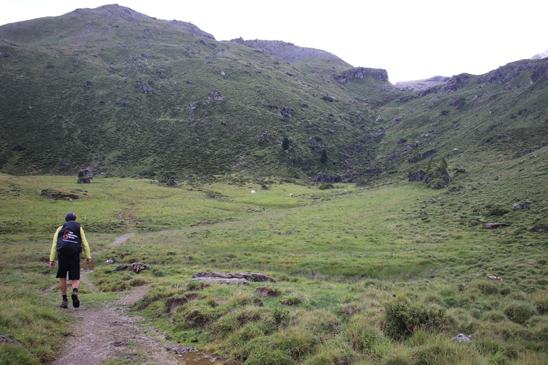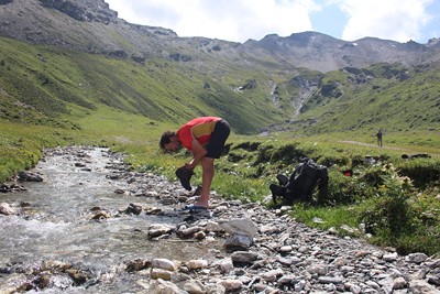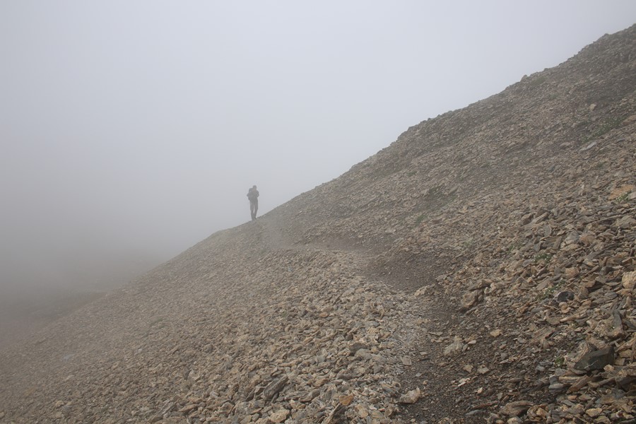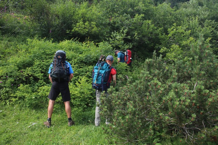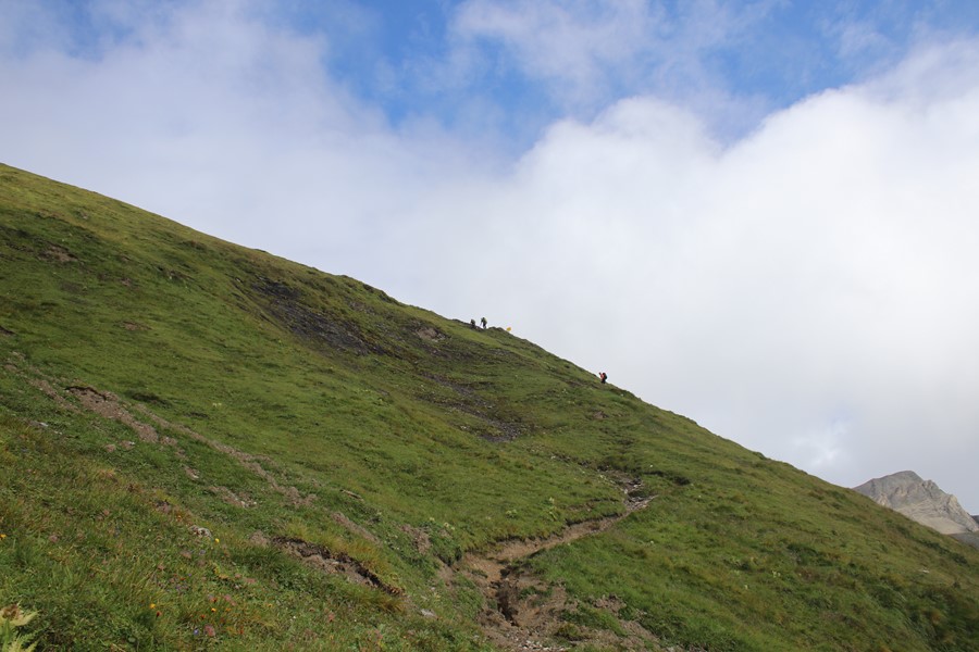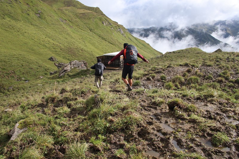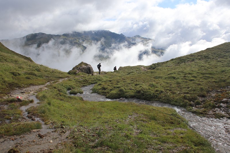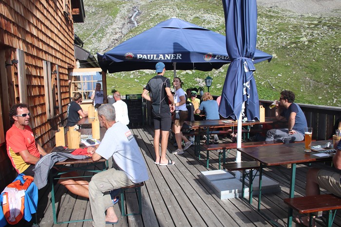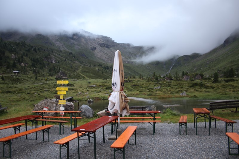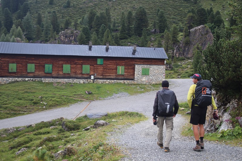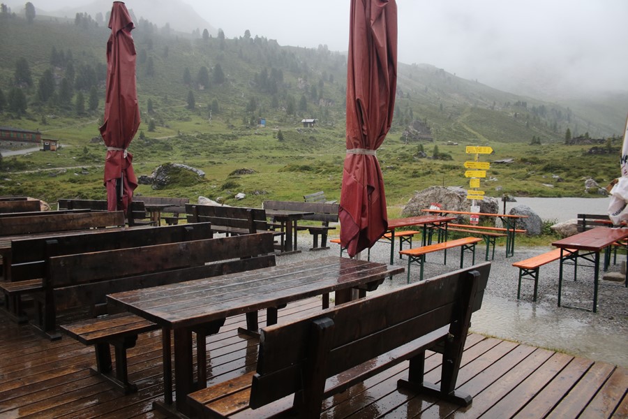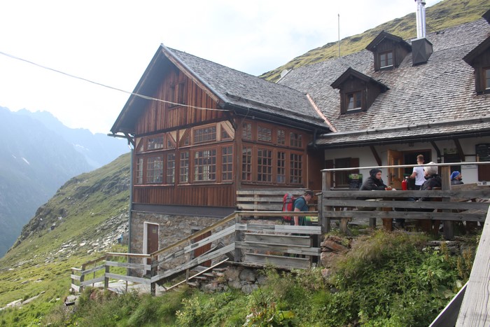 Wie so oft wird die Flüssigkeit die am Abend den Verlust des Tages kompensieren musste, in einem Nächtlich Toilettengang abgegeben. Wie so oft ist es nicht einfach in der Nacht zur Türe zu finden. 6.45 Uhr, das Rauschen des Baches unüberhörbar auch Angenehm, die Temperatur im Raum, trotz des gekippten Fenster gut. Die Nacht unruhig, der Geist will Trotz der schönen Erlebnisse nicht so richtig zur Ruhe finden. Mehrere Handys dienen als Wecker. Als ich mich aus dem Schlafsack erhebe, ist Bodo beim Packen. Wurle ist wie immer einen schritt voraus. Fast zur gleichen Zeit stehen alle auf, exakt 14 Personen in diesem Zimmer, jedes Bettlager war belegt. Die Nase will nicht genesen, Blut und Grüner Schleim, wobei die Stimme schon besser geworden ist. Ein Blick aus der Türe bestätigt den Wetterwechsel, deutlich kühler, die Wolken hängen sehr Tief. Auf Zwei Tische ist das Frühstücksbuffet gerichtet. Wurle verspeist einen Joghurt, zum Abschluss gönnt er sich einen Apfel. Ruhig kein Drängeln, die Gäste verteilen sich in den beiden Räumen, so richtig möchte wohl keiner einen Schritt vor die Türe setzen. Bodo ist eifrig am Handy tätig, mein Gerät hängt noch am Netz. Heute ist klar die Regenkleidung wird gleich angelegt. Sicher ist auch das diese Tour um 3 Tage nach hinten verschoben wurde, war kein Fehler, auch wenn das Wetter gestern umgeschlagen ist. Am geplanten Termin waren die Bedingungen deutlich schlechter. Innerhalb weniger Minuten ist das Gepäck verstaut. Ein Gast Fotografiert uns vor der Eingangstür unter dem Sektionsschild. Es ist 8 Uhr, geworden, bei Schmuddelwetter in den letzten Tag der 8.Bergwoche. Für kurz ist der Geier und andere Hohe Berge zu sehen, ab 2500 m, ist alles leicht gezuckert. Genau Östlich liegt das Torjoch, der Höchste Punkt im Abstieg.