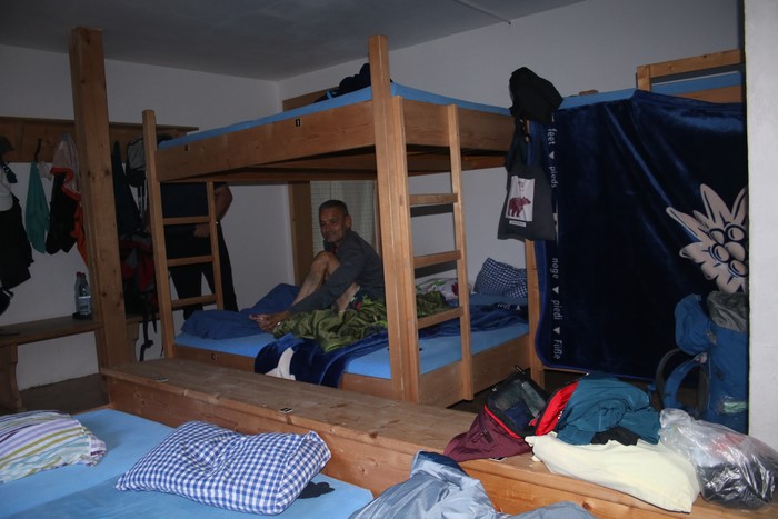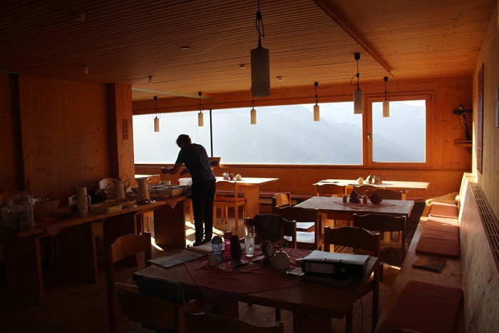 Unterhaltung mit einem Angestellten, Vorgestern gingen ergiebige Regenfälle nieder, die Wassermassen hatten ein Brücke weggespült, der Materiallift kann nicht angefahren werden bzw. der VW Bus bleibt unbewegt.Gut ausgelastet die Gaststätte die Tische gut belegt, von Einschränkungen kann da nicht gesprochen werden, wobei wir überhaupt kein Problem damit haben. Ein Blick aus dem Panorama Zimmer zeigt die Wetterveränderung an. Knipse einige Bilder um die Hütte Wolken ziehen tief durch sorgen für eine Gespenstische Stimmung. Die Jungs stellen auf Bier um, bestellen 3 Hefe, ungewollt erhält Wurle eine Halbe, das Zillertaler Bier weit unter Niveau das wird schon beim ersten Schluck klar. Es ist kurz nach 20 Uhr, die Frauen vom Nebentisch verabschieden sich, sie sind bei uns im Lager untergebracht. Bodo spendiert Nüsse, Christian isst Brot und Schokolade. % Mädels in der Gaststube spielen Karten ihr Gelächter übertönt aber wirklich alles. 21 Uhr, die Reihen lichten sich, Große Ladestation für die Handys, der Strom wird von einer Turbine Oberhalb der Hütte erzeugt. Das 6 Köpfige Personen setzt sich Zeitversetzt zum Essen vor die Hütte, 5 Jüngere Burschen teils in Decken gehüllt harren noch immer im Freien aus. Der Sohn einer Familie die sich im Nebenzimmer Aufgehalten hatten ca. 12 Jahre Alt, kommt noch einmal wegen Laden seines Akku in den Raum, Neugier wie er wohl ist, kommt er mit Bodo wegen seines I Phone in ein Gespräch, er erklärt ihm tiefere Funktionen über das Handy, Es beginnt kurz vor der Nachtruhe zu Niederschlag das sich schon vorher mit Blitz und Donner angedeutet hat. Während es sich beim Bezahlen hinzieht erzählt eine Angestellte das am Samstag eine Schlammlawine das Wasserkraftwerk komplett Lahmgelegt hatte. Mit heftigen Konsequenzen nicht allein wegen der Beleuchtung, Kochen und andere Dinge für die Versorgung stark eingeschränkt. Ärgerlich das anstehen die 5 Mädels benötigen eine Halbe Ewigkeit. Meine Ausgaben 36 €, Wurle 44 €, Bodo 47 €. Um die Schlafenden nicht zu stören, wird das Licht des Treppenhaus zum Schlafen legen genützt. Nach wenigen Minuten ist ein schnarchen wahrzunehmen da ist ja jemand aber richtig Müde. Das plätschern des Baches der nahe der Hütte fließt ist leicht wahrzunehmen.