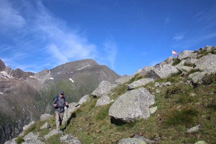 Leider fließt kein Wasser. Sonne Wolken Mix ein Platz zum genießen. Entledigen des Textils bis auf die Unterhose. Wurle Relaxt im Gras. Der See liegt gut und gerne 300 Meter entfernt in einer Senke. Christian wäre am liebsten eingetaucht. Wurst und Brot vom Morgen, dazu ein Müsli Riegel. Das nächste Stück bis zu dieser Verbindung des Höhenweg Hütte zum Joch dürfte um die 200 Hm. Betragen. Anfangs über einen Wiesenhang Nördlich das steilere Stück fordert mittels Kehren wird Höhe gewonnen. Folge Bodo eine gewisse Zeit, er geht langsam aber Konstant. Das Gelände wir zunehmend steiniger, Wurle wartet auf einem Fels liegend. Die Pfitscherjoch Hütte ist einiges Oberhalb der Straße auf einer Anhöhe Sichtbar. Gepflastert der Höhenweg Nr.3 wie einst die Karrenwege. Anfangs fast eben durch die Steinwüste unter dem Verbindungsweg Nusserkopf zum Kraxentrager. sehr aussichtsreiche Blicke auf das Hochfernermassiv und auf die vielen Berggipfel welche das tief unten liegende Pfitschtal umrahmen Die Richtung ändert sich ein längeres Stück Nördlich ohne Höhen Gewinn. Schmaler Weg, sehe die Silhouette einer Hütte weiter Oben, Wurle will das so nicht bestätigen. Überschreiten von kleineren Wasserläufe, ein Willkommene Chance zum Trinken. Die Richtung wechselt nach Westen, in einem Steilen Hang wird erneut Höhe gewonnen, denke da an unsere zwei Kameraden. Längere Querung auf breitem Weg bis an einen Absatz mit Sitzbank. Gute Sicht in das Pfitschtal. Das Wetter ist Stabil. Wir warten ein wenig. Ein Älteres Ehepaar kommt dazu. Wenig später drei Burschen in Turnschuhe mit Reichlich Wasser am „Körper“ Erneut eine breite Wegspur, es zieht sich weiter als vermutet. Wurle „schnappt sich die 3 meine Puste reicht gerade für das Sportliche Ehepaar die ich ich vor dem Serpentinen einhole, Gut Trainiert für ihr Alter Respekt. Sie bleiben mir auf den Fersen, schwer der Atem die Herzfrequenz Rast. Die Hütte ist gefühlt fast Greifbar. 50 Min. steht an einem Stein, oh weh! Eine Fahne am Grat ist Erkennbar von der Hütte keine Spur. Mit einem Schluck ist die Flasche geleert, ha keine Zeit verlieren, diese Führung bringe ich ins Ziel! Das letzte Stück in einem Bogen durch Blockgewirr in einen Sattel. Erleichterung das Ziel die Landshuter Europa Hütte ist Greifbar, ein Natur Steinbauwerk davor eine kleinere Hütte. Das da ein Teil angebaut wurde „sticht“ sofort in das Auge. Gleicher Spiel wie gestern, der Hüttenhund begrüßt die ankommenden Gäste mit Gebell. Unüberhörbar der Generator zur Stromversorgung. Es ist 16.26 Uhr. Knapp 8 Stunden Unterwegs. Die Schutzhütte steht auf einem Breiten Grat auf der Grenze von Österreich und Italien mit Toller Rundumsicht auf 2693 m. Wenig tiefer als die Hochfeiler Hütte. Wurle sitzt schon an einem Abseits gelegen Tisch die Schlappen am Fuß, ja die 12 Jahre Altersunterschied sind nicht zu leugnen. Europaletten als Sitzgelegenheit das Bürgert sich langsam ein, genau diese wie geschaffen. Die Bedienung Serviert 2 Russ trägt eine Schwarze Maske. Wenige Gäste sind noch Anwesend, die Tagesgäste steigen meist von Stein auf, dieser Ort liegt direkt im Pfitschtal und ist von hier aus zusehen. Der Körper kühl in der Passivität langsam aus, ziehen uns daher in die Hütte zurück. Ein Wohlseins Gefühl ist sofort vorhanden, Unterteilt in kleinere Räumlichkeiten verteilt sich der Gäste Bereich, 3 Tisch wähle eien am Fenster, gut geeignet zum Schreiben, wie es scheint ist er Heizkörper unter der Bank eingeschalten. Wurle meldet uns an, mit dem Datum das passt wieder. Ein Lager im 2. OG Rechts unter der Dachschräge, das wir gleich beziehen. Eine weitere Person hat sein Lager auch schon bezogen. Füße Waschen in einer Edelstahl Rinne im Waschraum. Umziehen der Schnupfen tritt so richtig in der Ruhephase auf. Wie selbstverständlich nimmt die Bedienung das Akku Ladegerät mit in die Küche. Bei den Notizen lässt die Konzentration zu wünschen übrig. Jetzt fällt mir auf das ich die gewaschenen Socken zum Trocknen aufhängen sollte, doch ich kann sie nicht mehr finden, derweil ist Bodo und Christian im Schuhraum, kurze Info wegen Schlafplatz und mehr. Wohl der Senior Chef der sich auf seine Humorig Kauzige Art um die Gäste in der Hütte kümmert. Plausch mit der Senior Chefin am Hinteren Ausgang, hier hat der Hund sein Körbchen. Ein Gast steigt auf, Frage nach dem Ausgangspunkt für diesen Zustieg, Vom Brennersee Gehzeit 3 ½ Std. Sie lässt Wissen, gleichmäßig dieser Aufstieg deutlich weniger Schnee im Winter und Frühjahr. Heute wurde in der Nähe ein Verletzter mit dem Heli ausgeflogen. Der Durst Groß etliche Russ rinnen durch die Kehlen. Daten zum Tag: 19,28 Km Wegstrecke, 1156 Hm Aufstieg, 1020 Hm Abstieg, Zeit in Bewegung 5.15 Std. Zeit im Stand 2.19 Std. Als Bodo die Zutaten für das Essen schneidet, übergibt der Chef ihm ein Vesperbrett. Der Salat wohl ungewürzt es gibt Essig und Öl dazu, Die Portion Spagetti Reichlich und gut. Nett und Gesprächig das Ehepaar aus Wattens, leben die selbe Philosophie, möglichst keine Tour wiederholen immer auf der Suche nach einem neuem Abenteuer. Unterhaltung über die Politischen Maßnahmen mit all ihren Veränderungen. Christian wird Emotional fühlt sich im Gespräch ausgeschlossen ihm fehlt die Zeit um sich Informationen einzuholen, und genau da liegt das Problem die Menschen bemerken nicht, wie sich die Medien Landschaft unter dem Merkel Regime Verändert hat, die Veränderung kommt langsam aber stetig, der Freie Journalismus ist Tabu, nur noch wenige Private trotzen, sie haben reichlich zulauf, siehe Reitschuster, Langemann und andere. Hochinteressant ihre Gesprächspartner, Professoren, Politiker, Wissenschaftler und Gelehrte. Der Wirt ist im 50 Jahr, feiert heuer sein 74 Lebensjahr. Der Sohn und seine Frau, die ich als Bedienung vermutete, sind nun Pächter, wenn die Nord und Südtiroler sich einigen könnten, steht einem Neubau nichts mehr im Weg. Hüttenruhe im Gewöhnlichen
