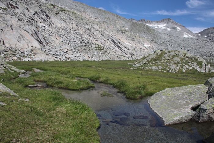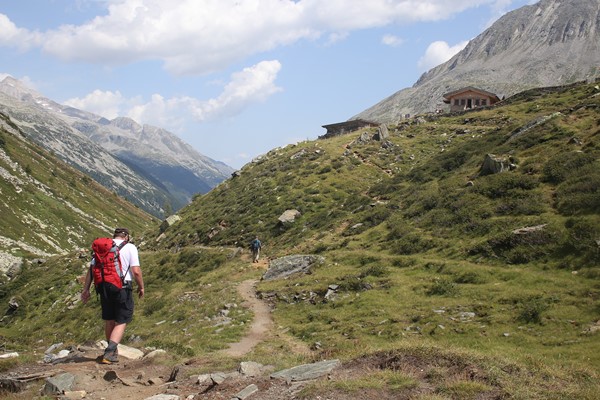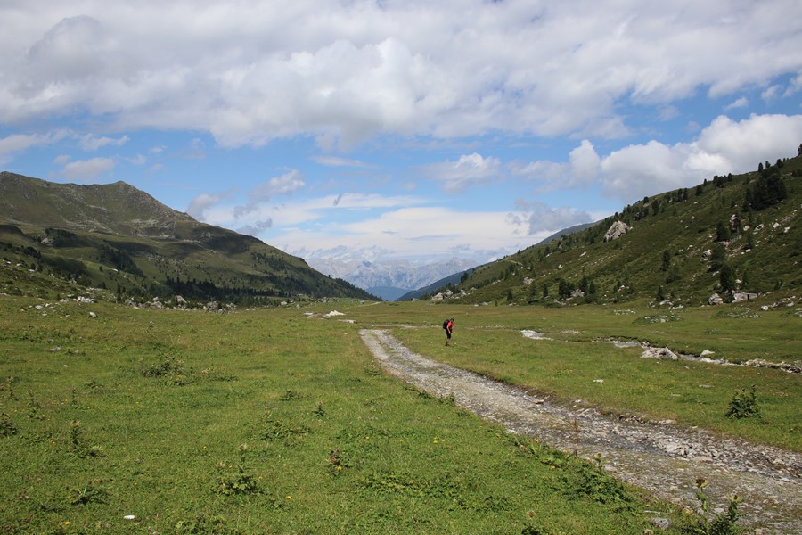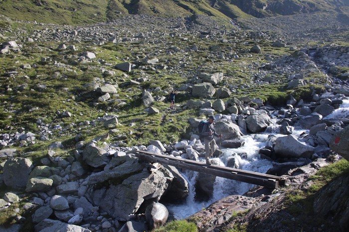 Mittwoch 11.August:. Eine Unruhige Nacht gehr zu Ende, allein 3 mal war Bodo auf der Toilette. Trotz der Schweißausbrüche ist die Nase am Morgen zu. Das Gefühl vom Vortag täuschte also nicht. Auch Christian klagt über wenig Schlaf, liegt wohl nicht allein an einem Sonnenbrand an Händen und Füßen, Cremt sich sofort beim Aufstehen ein. Es ist 7.15 Uhr, es ist sehr Eng wenn 4 Personen gleichzeitig Handtieren. Die Toilette ist leider besetzt. Wir werden uns zum Frühstück auf der Terrasse treffen. Leichter Wind Temperatur 12° C. Allgemeine Aufbruchstimmung unter den Gästen. Fast Wolkenlos nur wenige Wolken teils auch Rest Wolken die nach Oben abziehen. Bestellen Teewasser Christian Kaffee, er erhält ein Kanne Kaffee dazu ein Kännchen Milch. Das mit dem Teewasser dauert, er hatte alles schon abgeräumt. 2 x 1 Liter Warmes Wasser und 4 Tassen, er stört sich nicht an der Selbstversorgung. Präzise erklärt er Gästen den Weg über den Gr.Möseler, ja Roland ist Ortskundig, das sollte eigentlich Voraussetzung sein für den Betrieb einer Schutzhütte. Erneut staune ich was da an Essen mitgenommen wurde. Die Edelrauthütte ist jetzt in der Sonne gut zu erkennen, Gemütlich geht es in den Tag die Wetterprognose verspricht Gutes. Die Abrechnung erfolgt Gemeinsam, Christina bezahlt davon seine Unkosten von 72,50 € den Restlichen Betrag teilen wir durch 3, ergibt 72.50 € pro Person. Zum Abschied gibt es am Frühen Morgen einen Grappa, Wohl bekomms! 8.45 Uhr,Abstieg über den Wanderweg 24. Ziel ist die Hochfeiler Hütte, Vorgegebene Zeit in der Literatur 7 Std. Was wie eine Straße bis zu einer Kuppe ausschaut ist ein der Weg aus Steinplatten. Es scheint geradlinig auf die Edelraut Hütte zu zugehen. Ärgerlich für die Biker die Quer Rinnen für das Ablaufen des Regenwasser. Der Schnupfen Bremst richtig Druck auf dem Kopf. Ziemlich Geradlinig verläuft der Abstieg zwar gilt die Konzentration auf den Weg doch die Äußerlichen Gegebenheiten werden wahrgenommen. Insbesondere diese Schönheit der Zillertaler Ahrntaler Alpen. Biker Begegnen teils das Rad schiebend. Sehr viel Grün insbesondere die Fläche vor dem Ende dieser Ebene, ein Bach teilt diese. Wolken werfen Schatten an die Berghänge. Zur Rechten ist ein wenig Östlich des Gr.Möseler bis der Bergkette vor dem Hochfeiler im Westen im Blickfeld, der Abstieg vom Sattel ebenso gut Sichtbar.