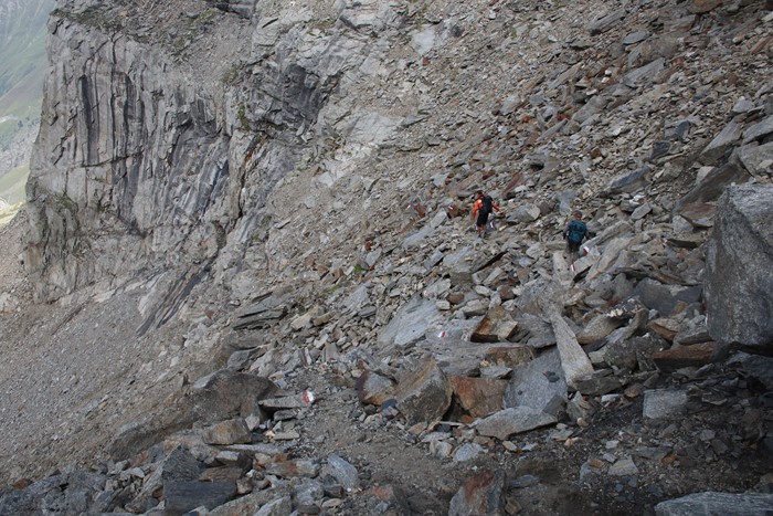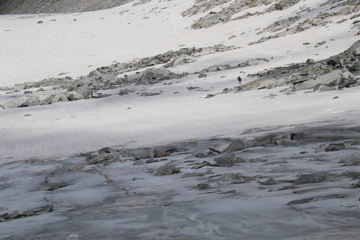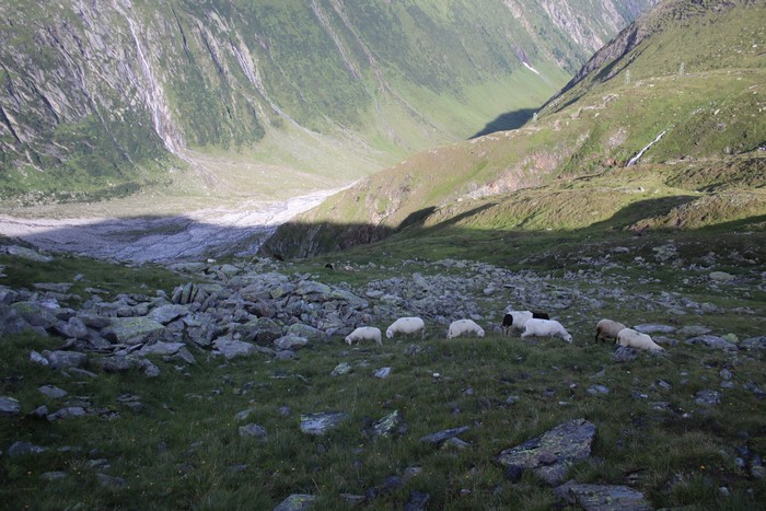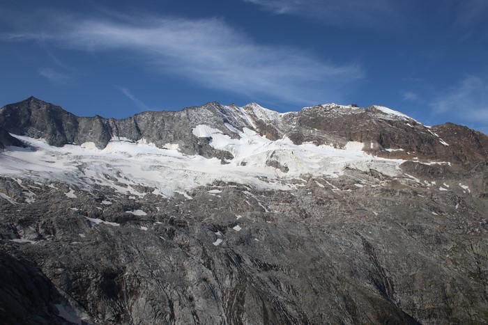 Dienstag 10.August:.Stimmen vor der Hütte, wohl das Signal zum Aufstehen. Wurle ist als erster auf den Beinen, er teilt die Uhrzeit mit es ist kurz vor 7 Uhr. Ein Blick aus dem Fenster lässt Bergsteiger Herzen höher schlagen, abgesehen von ein wenig Wolkenschleier besticht ein Blau vom Feinsten. Vesper mit nach unten nehmen, der selbe Tisch wie am Vorabend, es ist relativ ruhig etliche werden schon auf ihrer Etappe sein. Wurle holt sich ein Kaffee am Buffet, gönne mir ein Früchte Tee. Eine größere Gruppe ist kurz vor dem Abmarsch die meisten visierren die Berliner Hütte an. Versorgen uns selbst das stört hier keinen fast Unverschämt das wir uns an den Getränken bedienen. Die Temperatur liegt bei 9°C. Die Berliner Flagge weht im leichten West Wind. Zähneputzen, das Gepäck wird so verstaut das die Gletscher Ausrüstung oben auf liegt. Während Bodo und Wurle im Vorraum die Schuhe anziehen, ziehe ich ein Platz im Windschatten auf der Terrasse vor. Die Info über den Zustieg zum Nevesattel hörte sich nicht überzeugend an. Wurle läuft voran, es ist 8.25 Uhr, Bei nun 11 °C, gleich ein Hinweisschild Gr.Möseler und Neveser Sattel, gut Markiert wie lange noch? Querung am Hang in Südlicher Richtung den Gletscher oder zumindest den Mehrheitlichen Teil immer im Blick. Wurle steigt an einer Wegtafel Links auf, folgt einer Moräne, das kann wohl nicht sein, spätestens als ich die Wegteilung erreiche ist klar es quert weiter, das ist der Anstieg zum Gr. Möseler. Als er anhält und zurückschaut, reagiert er auf ein Handzeichen. Die Markierungen weniger aber ein Weg ist vorhanden. Um 9 Uhr, steigt es in Felsblöcken an, eine Seil gesicherte Passage in kleinem Bogen die nun Tieferliegende Hütte nicht mehr Sichtbar, dafür ist der Blick auf den kompletten Speichersee möglich. Langsam vergeht der Schatten der Berge die den See noch etwas Östlich verdecken. Schafe Grasen am Weg, einfacher als vermutet verläuft der Weg durch den Hang der aus der Ferne sehr steil wirkte. Unüberhörbar als der Heli die Hütte mit Lebensmittel versorgt, insgesamt waren es drei Flüge.