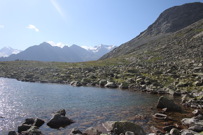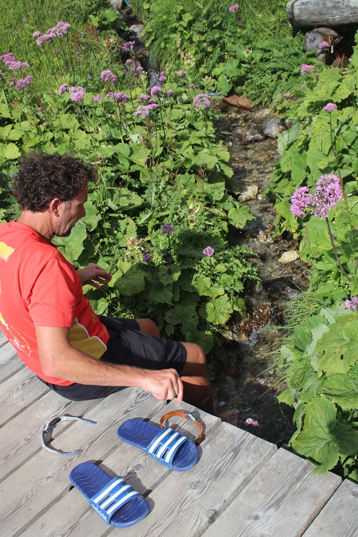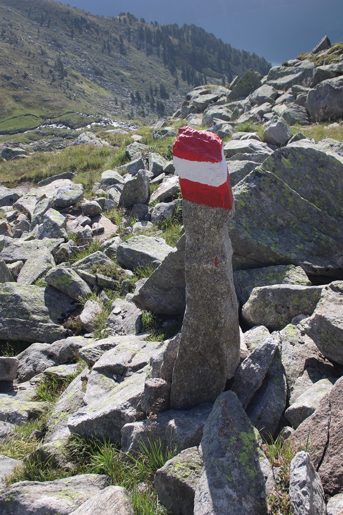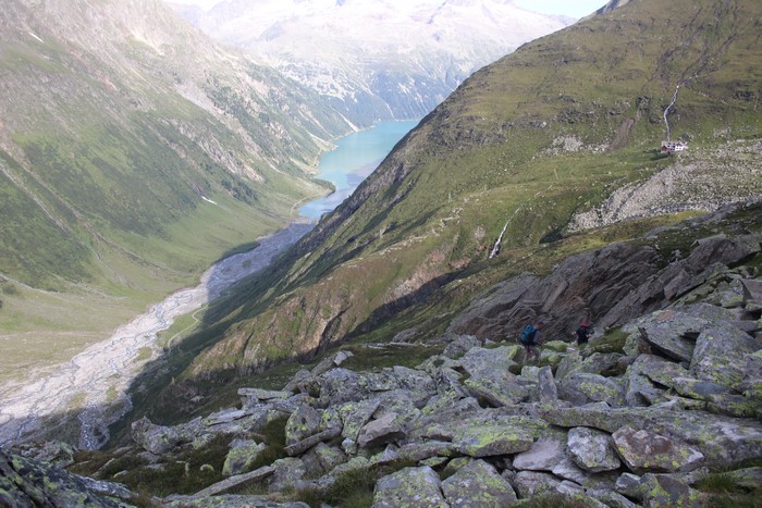 Wurle wer auch sonst, bringt Leben in den Raum. Durch das kleine Dachfenster dringt enorm viel Licht. Mit geübten Griffen ist das Handy eingeschalten, der Wetterbericht interessiert. Aktuell 10°C bei Schleierwolken, die Temperaturen bleiben Hoch, die Gewitterneigung nimmt leicht zu. Dieser Schnupfen Scheußlich. Der Atemweg durch die Nase schier unmöglich. Morgen Toilette. Bestellen 2 Liter Teewasser, der Chef ist mit der Selbstversorgung nicht Einverstanden es sei keine AV Hütte, sondern des CAI, Club Alpinistico Italiano, damit kann er mich nicht einlullen. Wurle hat von seinem Frühstück ein wenig Butter für uns, Landjäger und Brot. Auf Anfrage bringt die Schwiegertochter das Ladegerät, Christian bezahlt ein Euro für das Laden in einer Speziellen Lade Box. 210 € werden durch 3 geteilt. Zusammen mit Christian waren es 25 Getränke. Die Katze streckt sich nach dem Landjäger der auf dem Tisch liegt. Gestärkt für das kommende, heute wird es ein eher etwas lockerer Tag im Vergleich zu den zwei Tagen zuvor. Ein letztes Mal die 2 Stockwerke nach oben gehen, mit wenigen Handgriffen ist das Hab und Gut verstaut. Bodo und Christian Surfen im Internet. Trotz Uneingeschränkter Sicht reißt die Verbindung ab. Der 5 Tag, Ziel ist die Olperer Hütte, es geht zurück in die Zillertaler Alpen Gehzeit 5 ½ Std.. Die Bedienung empfiehlt den Höhenweg. Mal Am Pfitscherjoch abwägen. Der Chef erweist sich als Spendabel stellt 4 Klare auf den Tisch. Kurz vor 9 Uhr, die Tour wiederholt sich bis zur Weggabelung wo der 4a in den 3er Mündet. Als wir an die Stelle gelangen, wo diese 20 Minuten am Fels stehen, stellt Bodo Fest das wir diese Zeit gerade im Abstieg benötigten, diese Zeitangabe bemängelt er deutlichst. Äußerst gute Bedingungen, Bodo bremst uns ein, wir sind zu Flott. Die Nase mit ihren Begleiterscheinungen kostet Substanz. Gegenüber im Hochfernermassiv mit den Seitentäler fällt auf das weder eine Alm oder Hütte steht. Wäre da nicht die Straße zum Joch wohl Alpines Niemandsland. Wanderer Begegnen die ersten Tagesgäste der Hütte. Christian unterhält sich mit den Entgegenkommenden. Kurze Steigungen, beim Blick zurück ist nun klar wo die Europa Hütte steht. Abstieg am Hang vor der langen Kurve. Wasserläufe vom Schnee der den einstiegen Gletscher bedeckt. Trinkpause auf ca. 2300 m. Folgt der Wegverlauf einer Ideal Linie? Nach dem Sattel ist die Pfitscherjoch Hütte erstmals zu sehen. Weit unten noch vor dem Abzweig Weg 4a, Grasen Schafe auf einem Plateau oder Lichtung. Drumherum Reichlich Baumbewuchs. Der Abstieg dazu noch die Körperliche Frische verläuft locker wenn auch die Sonne und die Ansteigende Temperatur nicht auf einen Spaziergang schließen lässt. Einige steigen von der Kehre 4 kommend auf. Ab diesem Bereich verläuft der Höhenweg sehr nah am Hang er ist nicht nur gepflasterte Weg sondern auch mit einer Stützmauer versehen, was da an Platten im Hang liegt kann Bedrohlich sein. Kleiner Richtungswechsel zum Pass. Die Hütte kommt in das Blickfeld, Wanderer sind zu sehen. Der Begriff Joch ist wohl Relativ, ein doch eher breiter Übergang. Wie geschaffen, ein See am Wegesrand, dieser lädt förmlich auf eine Pause ein, sind wir nun doch fast 3 Std. on Tour. Wurle wählt am Ufer den Platz. Die Recherche ergibt den Namen „Langesee“ Nur wenig Entfernt relaxt eine Familie an diesem Idyll. Herrlich die Füße abzukühlen kleine Fische nähern sich fühlen sich im ca. 10°C warmen Wasser genauso wohl, ein Bad in der Sonne Traumhaft. Was da fehlt wäre ein Weißbier, stattdessen Wasser, Brot, Wurst und oder Schokolade. Das Wetter ist uns absolut holt, heute ist der letzte Tag für Christian an dieser Bergwoche, vermutlich auch seine letzte Bergwoche. Die Entscheidung ob Höhenweg fällt zu Gunsten des Abstiegs zum Schlegeisspeicher. Die Logik hat Entschieden, dazu kann ich mich vom Seil verabschieden. Morgen erfolgt ein Teilstück des Höhenweg auf der Etappe zur Geraer Hütte. Wie doch die Minuten verrinnen, es ist an der Zeit. Kurzer Aufstieg in das Joch, Kühe weiden um ein Gebäude das sich nicht zuordnen lässt. Laut Wegtafel 2 Std. für den Abstieg durch das Anfangs Breite Tal in denn der Zamser Grund. Links Oben der Schrammacher mit dem Überbleibsel des Stampflkees, Moränen wie vom Lineal gezogen, einst wohl ein Großer Gletscher, etliche Wasserläufe entspringen diesem. Bilden den Zamserbach. Eine Schotterstraße kann über einen Wanderweg abgekürzt werden, etliche Tages Ausflügler sind im Aufstieg. Wohl auch ein Biker Eldorado. Rein zufällig kommt der Sonnenschutz in den Sinn. Arme und Beine sind meist die Leidtragenden.