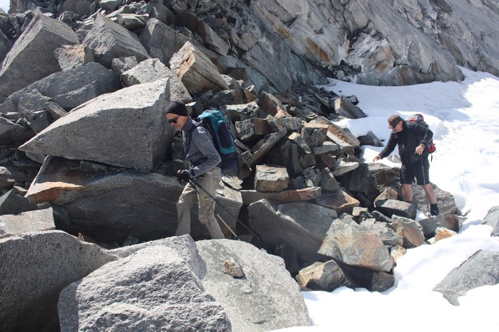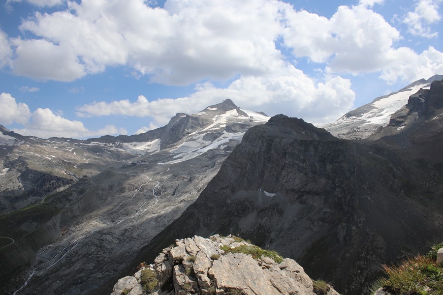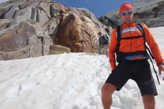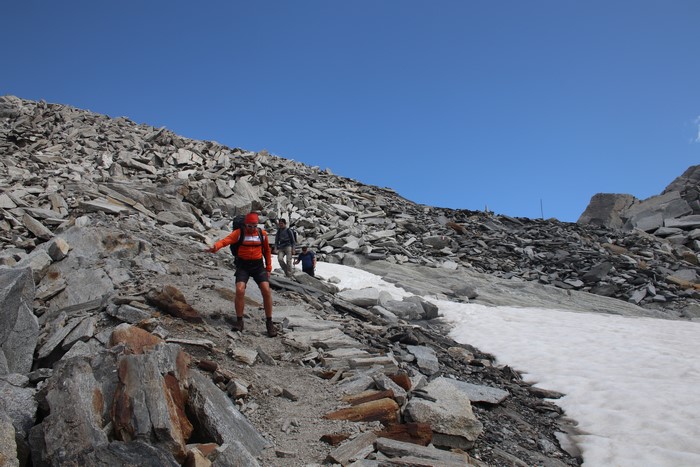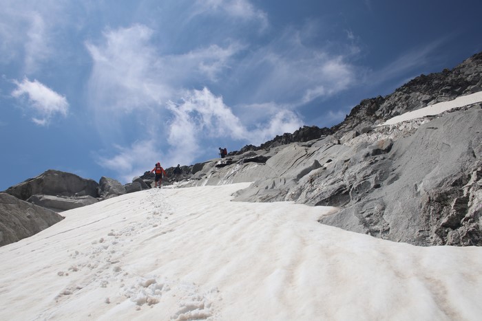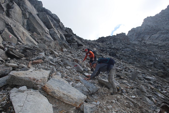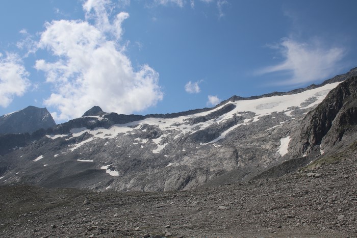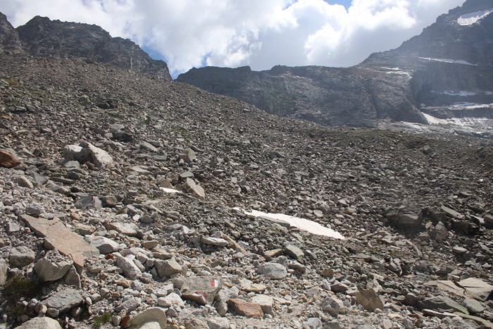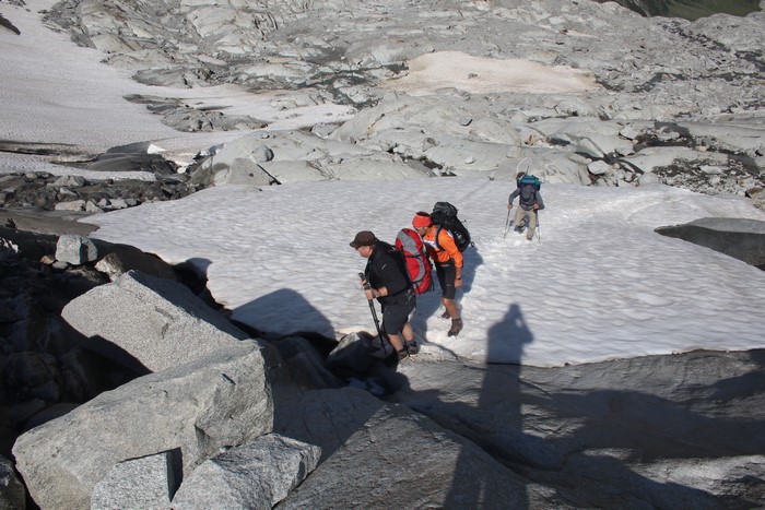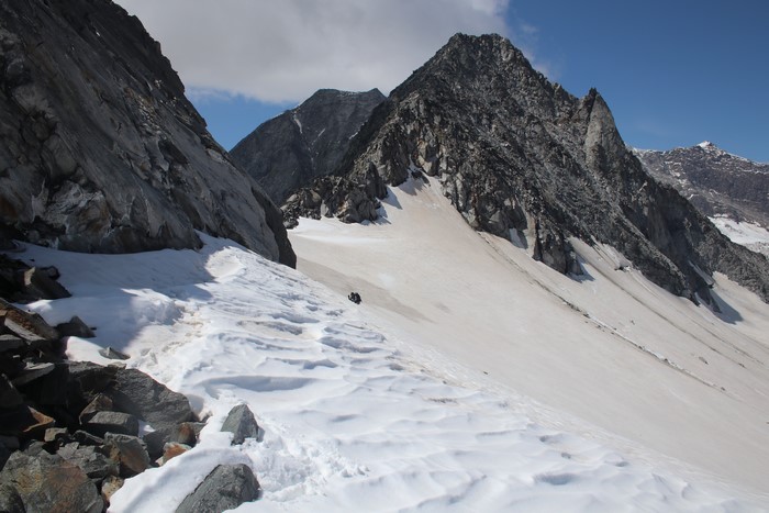 Interessant der Zustieg zum Abbruch des einstigen Gletscher, die Markierungen und Steinmänner verlaufen sich. Verlockend der Aufstieg über den steilen Teil des Gletscher der ausläuft, doch die Spalten wohl unberechenbar. Halten uns Links mühen uns im Aufstieg Vorwärts. Eine Herausforderung über die Teils steilen Platten schwierig doch Erfahrung hilft. Ab und zu findet sich ein Roter Punkt. Wie weit geht es im Gletscherschliff nach oben um auf das Eis zu kommen. Teils nach Links um dann weiter oben wieder rechts. Verhauer in den Schotter Blöcken doch in Summe passt das ganz gut, Bodo und Christian haben es etwas leichter können sich an uns Orientieren. Ein Roter Strich auf einem Stein zeigt die Richtung an, danach auch Markierungen wir sind auf Kurs, einzelne Schneefelder Umgehen sind jetzt 50 Meter höher als der Gletscher jetzt noch ein Steinmann oder Markierung, Bodo und Christian sind etwas tiefer steigen geradlinig auch über Schnee auf, Prima! Ja ein Großer Steinmann findet sich, über eine Art Rampe erfolgt der Zustieg, kurze Querung im Schnee der Untergrund ist gut, ein Steinblock auf dem Eis ideal für das Anlegen der Ausrüstung. Noch Etwas Entfernt der Sattel, doch welche Einschneidung von den beiden ist nun dieser Neves Sattel? Es ist 11.30 Uhr geworden, länger als Vermutet.Wolken sind aufgezogen bei immer noch guten Bedingungen. Angenehm Warm der Fels, Steigeisen bzw. ich habe Grödel dabei.Wie es denn Anschein hat können wir auf das Seil verzichten. Etwas Links zum Hang hin sollte der Aufstieg ungefährlich sein. Schnell sind die Eisen am Fuß, Wohlschmeckend das Wasser, wie bescheiden eine Magnesium oder Multivitamin Tablette. Wurle startet etwas Flott. Es ist gut zugehen der Schnee nicht Tief.