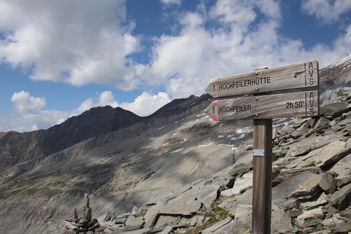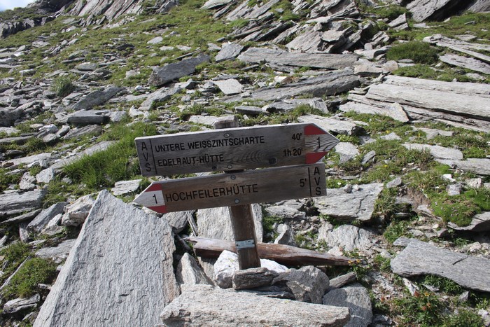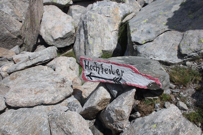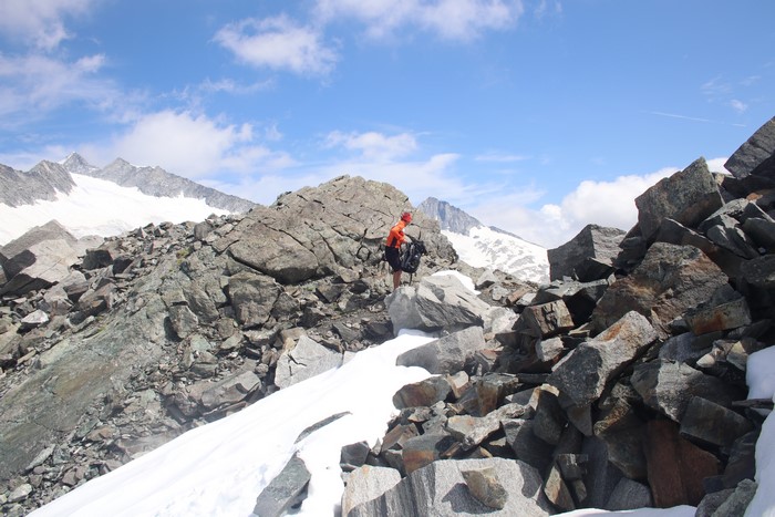 Es ist eine Rast nötig, es ist etwas zu kühl dazu viele Wolken wir müssen warten, eine wenn auch Dünne Fleece Jacke schützt ein wenig. 1 Snickers und etwas Wasser. Bodo rastet nur kurz, er läuft Konstant sein Tempo. Am rechten Fuß über dem Knöchel ist eine Reizung, was zum Teufel ist geschehen. Der Weg durch die Wüste aus Steinen hebt sich bestens ab, wenn auch ab und zu ein langer Schritt nötig ist. Wurle erreicht als erstes die Weiszintscharte, freudig und Unüberhörbar lässt er Wissen, die Hütte ist Sichtbar! Eine Stange Markiert diesen Übergang. Hinweistafel auf den Hochfeiler und die gleichnamige Hütte, eine breitere Fläche. Tiefer unten der Gletscher der später gequert wird. Schneefelder im Abstieg. Kurzer Chat mit „Thailand“ Morgen sei Baubeginn. Der Gipfel des Hochfeiler am Ende eines sehr langen Grat unverkennbar. Die Hütte liegt deutlich versetzt der Moräne des Gliederferner der am Hochfeiler seinen Anfang nimmt. Luftlinie geschätzte 2 Km, das dürfte sich hinziehen. Erhalte den Vortritt, Anfangs leicht abwärts dann leicht rechts parallel zum Grat der zum Weisszint führt, Ausreichend mit Steinmänner und Roten Punkten Markiert. Schneefelder wechseln sich mit dem Weg der zwischen den Steine führt ab. Eine Spur auch im Schnee findet sich, die Tour ähnelt dem Abstieg von der Schwarzenstein zur Greizer Hütte (Bergwoche 2019) Über einen Langezogene Schneefreie Fläche ist eine Geniale Route für den Gletscher Zustieg gefunden. Ein gesicherter Passage bis zu einem Abruch der mit Trittbügel Steil in den Schnee Führt mehrer Bügel sind noch im Schnee vergraben. Leichter Abstieg im Weichen Schnee bis auf den Gletscher wo sich die Spuren verlieren, es wäre Hilfreich wenn auf beiden Seiten ein Großer Punkt an einen Fels gemalt wäre.