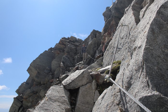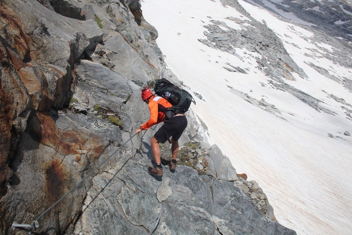 Die Stange mit Wegtafel steht direkt im Sattel. Teste das Mobile Netz, Perfekt Daten sind verfügbar, 15 Minuten für den Grat. Die Frage die sich uns stellt, ist der Schnee Tief, um diese doch steile Steile Flanke etliche Hundert Höhenmeter ohne Steigeisen abzusteigen? Warte bis Christian ankommt Wurle steigt an einem relativ Neu Versicherten Klettersteig schon mal ab, die Seile „glänzen“ noch in der Sonne. Ein Stück Westlich um dann leicht Östlich bis an den Schnee abzusteigen, mögen es 30 m Höhe gewesen sein. Das ist die geringste Höhendifferenz an diesem Grat zum Schnee. Wohl den Schmugglern damals schon aufgefallen. Es weht ein etwas unangenehmer Wind. Ein relativer guter Standplatz kleiner Schrund zwischen Fels und Schnee, Wage einige Meter, Vorsorglich rate ich zu den Steigeisen, Sicherheit geht vor, zwar keine Schwindelerregende Tiefe doch es quert wie es scheint über einen Abbruch. Die Flanke ist Steil Wurle geht voran, eine Spur für die Nachfolgenden zu treten fehlt gänzlich, da liegt noch Aufklärung, die Passage danach übernehme ich der Instinkt oder Erfahrung unersetzlich, Bodo folgt etwas dahinter Christian der wohl leichtes Spiel haben sollte, ärgert sich über das aufstollen des Schnee unter den Eisen, die Grödel erfüllen den Zweck da kann nichts hängen bleiben.