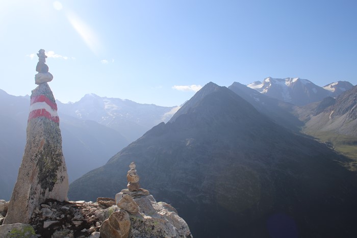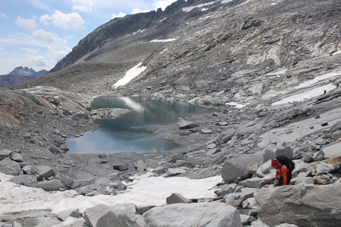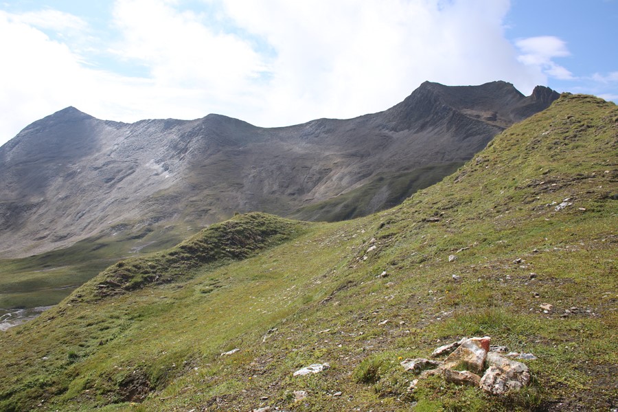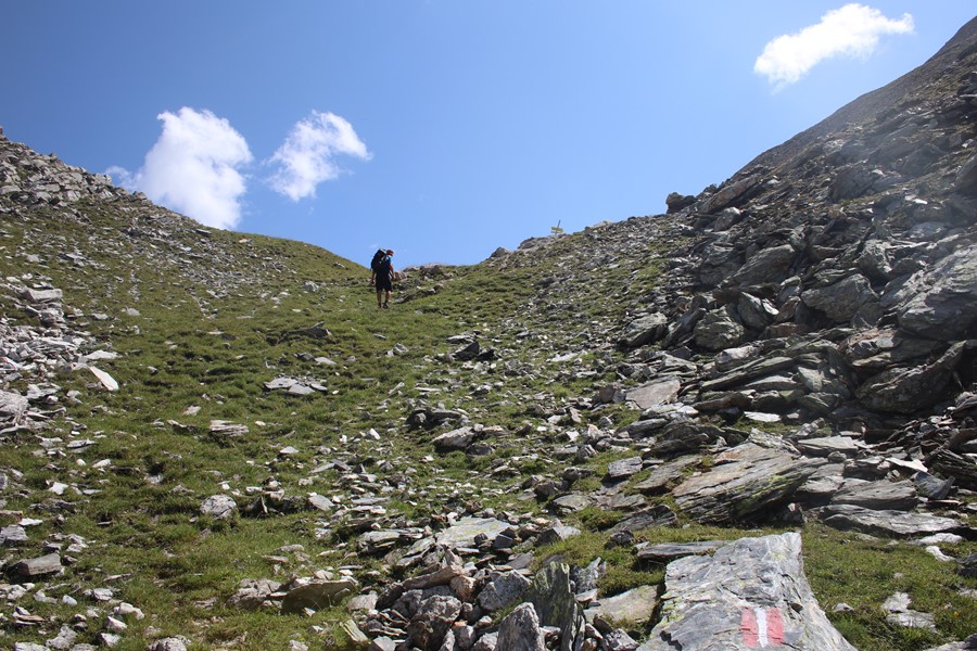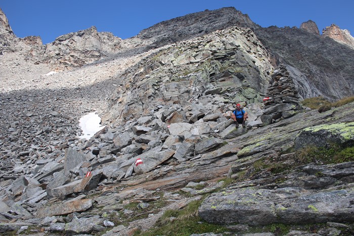 Die Luft wird Dünner. Eine Spur am letzten Stück vor dem Sattel deutet Links den Übergang an. Wurle folgt einer Spur die sich leicht im Schnee abhebt. Zwar leichter Wind und kühler kurze Hose kein Nachteil das Fleece schützt ein wenig. Die Helden fallen zurück, ja es strengt an der Körper ist gefordert, zum Ende hin wird es steiler, Die Stange die den Übergang kennzeichnet ist zu sehen, doch eine Spur ist deutlich Westlicher, Wurle ist 50 m voraus, als er den steilen Hang angeht wird schnell klar da kommt eine Knifflige Aufgabe auf uns zu Die Oberfläche spiegelt schaut aus als wäre eine Eisschicht darüber. Wurle setzt sogar die Hände ein, als er fast oben teste ich diese Anspruchsvolle Passage, mit jedem Meter wird der Untergrund fester 2/3 brauchbare Tritte danach hatten wohl die Vorausgehende auch ihre Sorgen. Ein Pickel täte gut, die Finger finden wenig Griff, die Grödel eben keine Steigeisen. Unter dem Fels quert es im Schnee Östlich bis an den Felsigen Grad, Wurle sitzt in der Sonne fast Windstill auf über 3000 m. Idealer Platz für eine Pause. Wurle gibt ein Mars aus. Der Blick nach Süden Eröffnet eine neue Perspektive auch dort noch viele Hohe Berge. Unten als Blickfang der Blau Never Stausee deutlich kleiner als der Schlegeis Stausee der auch noch Sichtbar ist. Ein Blick in die Tiefe mit Arg sausen, ein leichter Abstieg ist angekündigt, gut noch sind wir nicht am Sattel 25,Minuten später sind die beiden da, Christian erzählt das Bodo mit dem schlagen von Tritten gute Arbeit geleistet hat, klar war dementsprechend Zeitintensiv. Auch sie bekommen eine Wohlverdiente Pause. Kurz nach 13 Uhr, ich soll vor steigen, leichte Kletterei über Steine und Blöcke,Versuche einen Block Nördlich zu umgehen doch nach kurzem Abstieg erweist sich der Untergrund als Lose dazu versperrt eine Platte kehrt, die Kletterei leicht „Giftig“ Ein Mega Steinmann kurz vor dem Sattel Markiert diesen wenig begangene Sattel, einem Einstiegen Schmuggler Steig.
