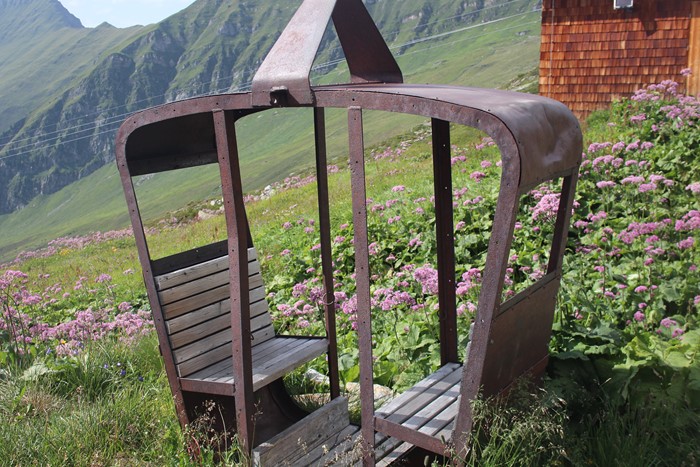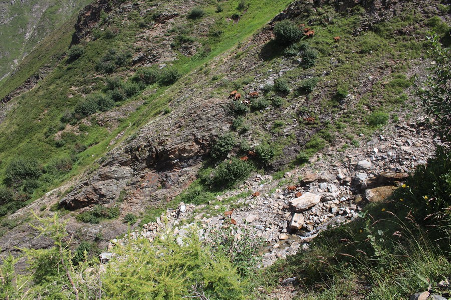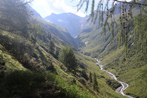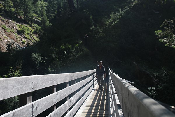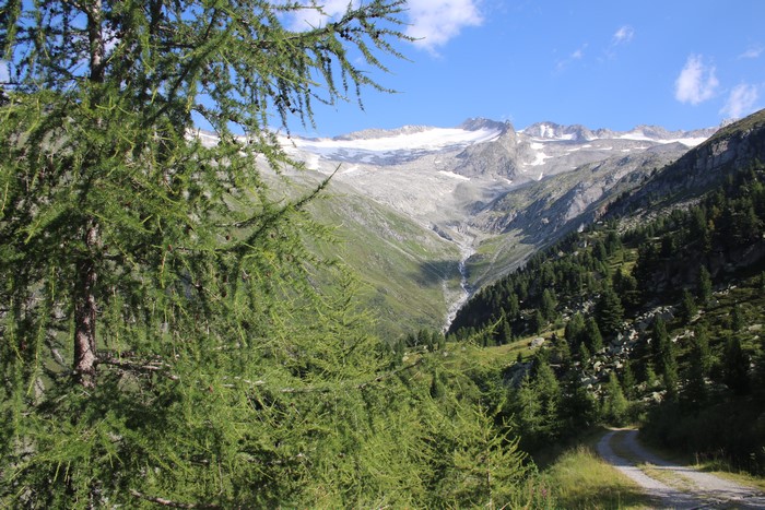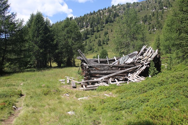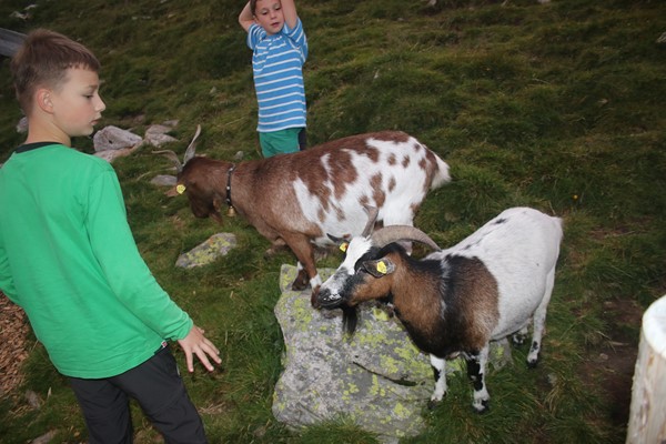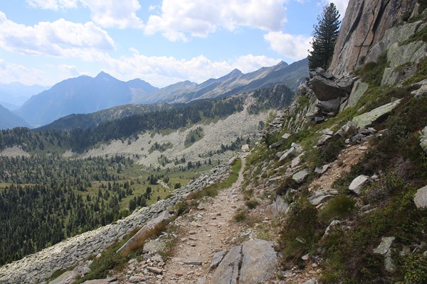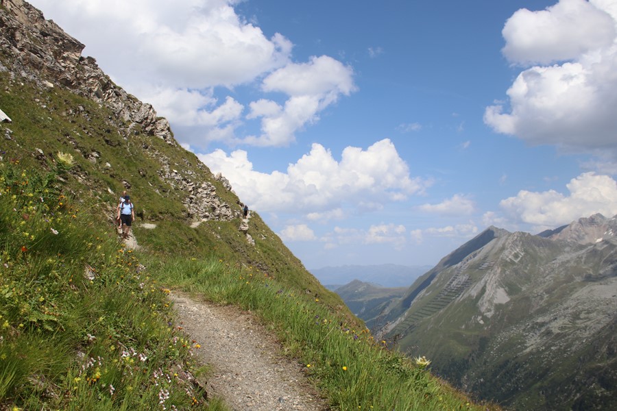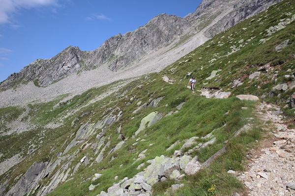 Ein neues Blickfeld öffnet sich am steiler werdenden Abstieg. Mehrere Gebäude wohl der Almwirtschaft gehörend, auch Bewaldet insbesondere Gegenüber am Hang Richtung Edelraut Hütte. Etliche Kehren teils mit Abscheider bis auf die Bewirtschaftete Fläche. Aus dem Weg wird eine Straße relativ gleichmäßig fast eben. Die Baumgrenze liegt Nahe von 2100 m. Verfallene Hütten neben Modernen Nutz Gebäude. Ungewohnt im Wald zu gehen. Wanderer sind im Aufstieg. Schlottrig der Untergrund die Beine gut Erholt, Teile des Stausee insbesondere der spätere Aufstieg sind nun Sichtbar. Gut Beschildert die Wege. Ein Wegabscheider endet im Kessel etwas oberhalb auf der Nordseite des Never Stausee. 2 ½ Std. Edelraut, 1.45 Std. Chemnitzer Hütte. Kurzes Geh-Stück bis zu einer Bank mit Seeblick. Deutlich Wärmer ist es hier auf 1859 m. Der Abstieg endet nach genau 1 Std. Die Mobile Daten Verbindung ist Gut, der Wetterbericht meldet Sonne satt. Vorbei an einem Neuen Gebäude mit Gastronomie auch Käse wird Angeboten, schön gelegen Absolut einladend, keine Reaktion zur Einkehr. Umleitung wegen Arbeiten an eine Wasserfassung. Angler werfen ihre Ruten aus. Ständig fahren auf der Gegenüberliegenden Seite Fahrzeuge auf. Sehr viele Parkplätze stehen ihnen zur Verfügung. Aufstieg Weg 26 im Lärchenwald, Ziegen Blockieren den Weg fühlen sich gar nicht gestört. Die Temperatur Zunahme dazu ein steiler Anstieg der Körper wird gefordert, das gilt besonders für Bodo und Christian. Der Baumwuchs endet, langer Taleinschnitt des Pfeifholdertal der in „weiter Ferne“ endet. Rechts ist Schweres Gerät wie Bagger in Arbeit. Jung und Alt sind im Aufstieg zur Hütte. Die Flanken insbesondere zur rechten überraschen. Wurle wartet auf einem Stein sitzend, kurzer Plausch, ein Mix aus Sonne und Wolken.