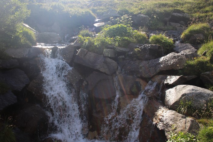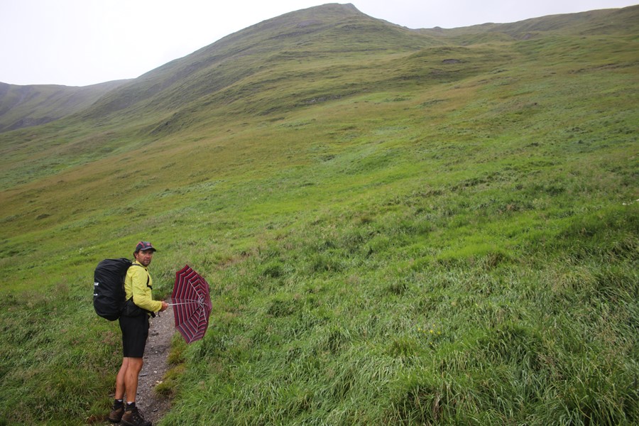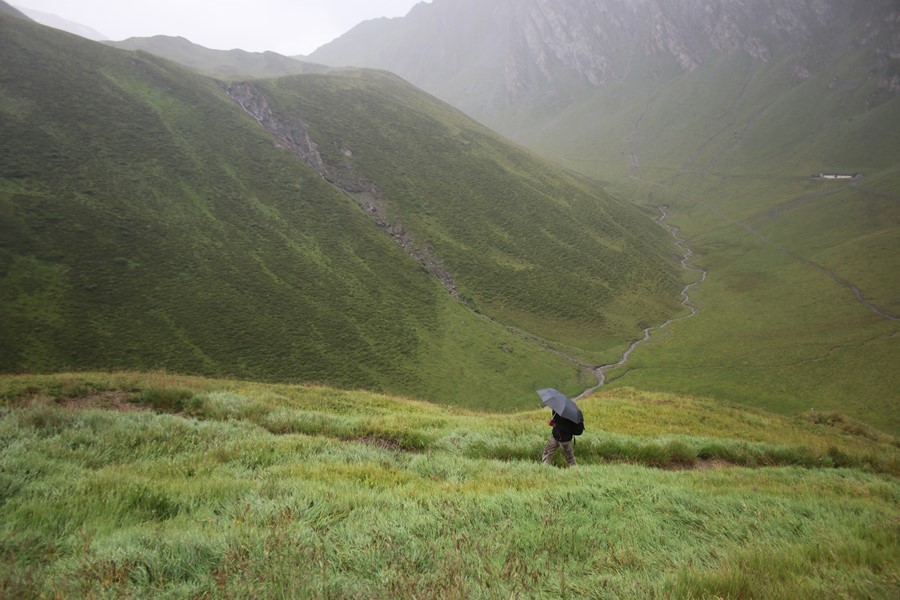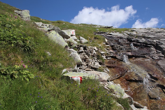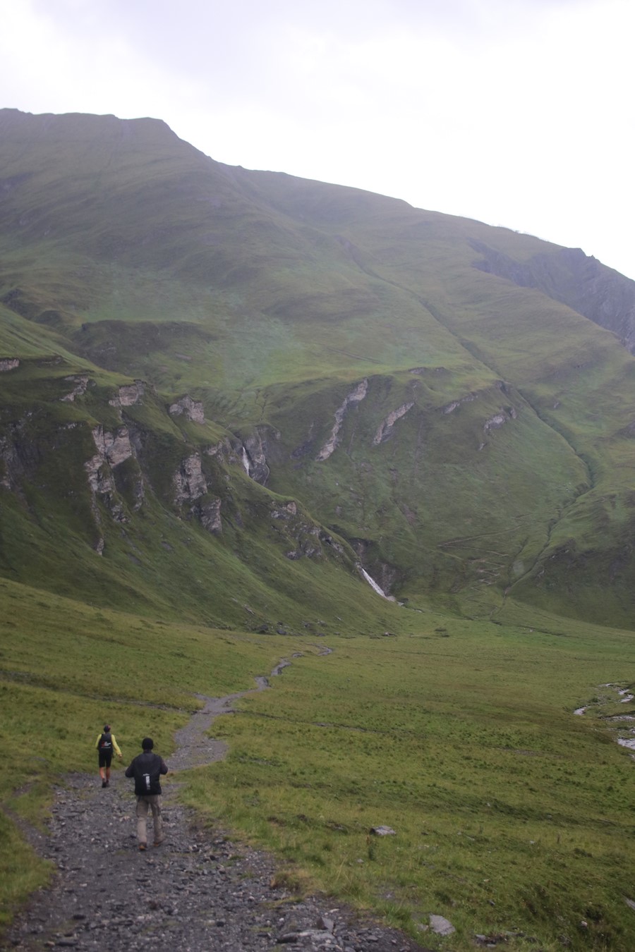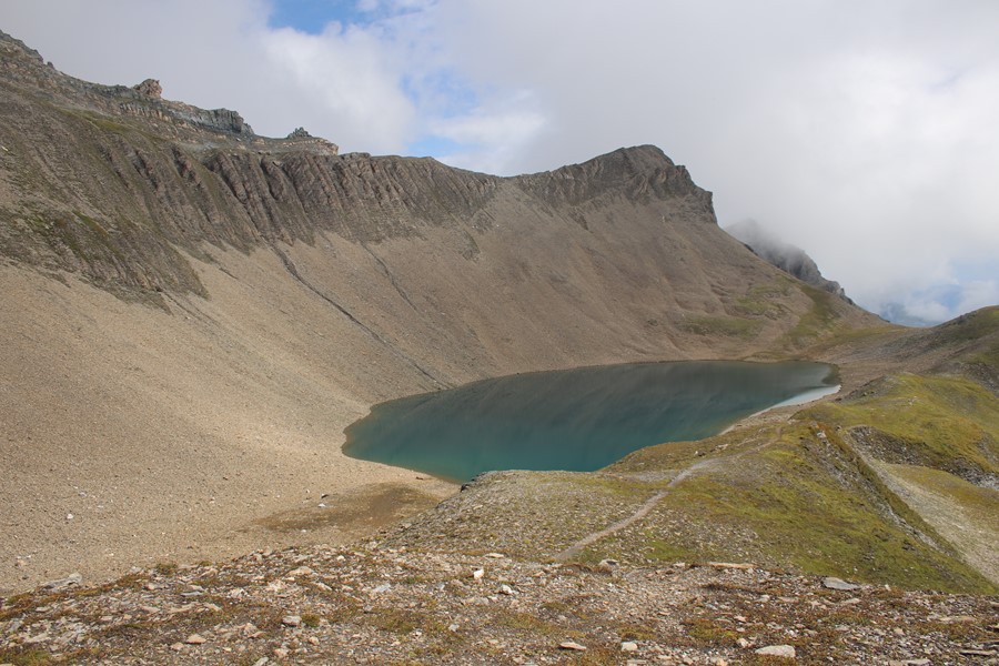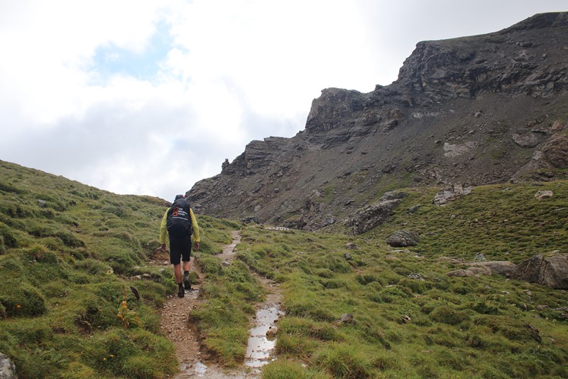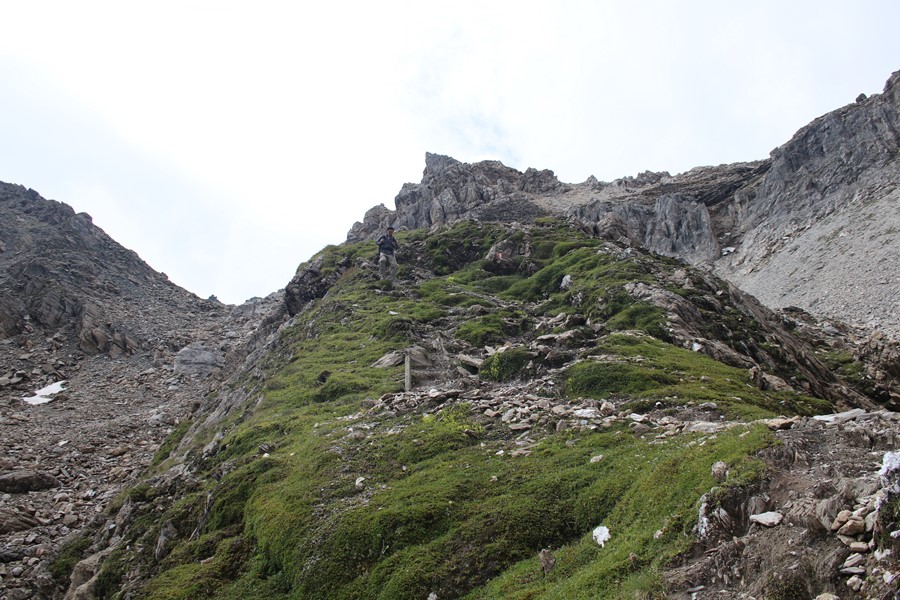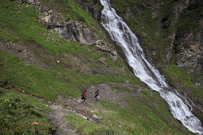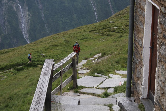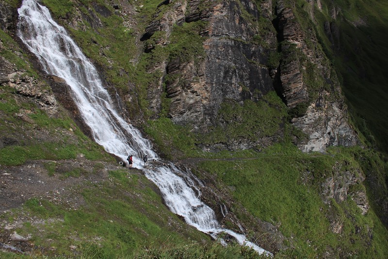 Der Wanderweg schlängelt sich nun Abwärts. Der Wind nimmt zu, hohe Luftfeuchtigkeit das andere Übel. Plötzlich setzt Graupel ein. Ein Stein zum ablegen des Rucksacks. Mütze und Handschuhe kommen zum Einsatz. Ein nächster See ein Gefühl in Skandinavien zu sein. Bodo Verfroren wie er ist, war schon beim Start auf Winter eingestellt. Eine Absoluter hin Gucker diese Hochfläche, ja wir sind nun in den Zillertaler Alpen. Satt Grün, ein Bach teilt diese schöne Natur in zwei Hälften, fließt von Nord nach Süd, um denn in einem See zu Münden, dieser liegt in einer Mulde, dessen Abfluss nach Norden in einer Senke liegt. Wenn nur die Sinne Wärme und Wohlbehagen abgeben könnten. Dahinter ein Tal Graue Wolken steigen auf ein Gespenstisches Bild, sollte es Aufhellen? Ist das der letzte Schauer da gerade vom Himmel fällt? Der Untergrund ist beim Abstieg mit Vorsicht zu genießen, glitschig schmierig das Schuhwerk, das die Feuchtigkeit nicht mehr Abweisen kann. Gebäude die wohl der Almwirtschaft angedacht sind stehen auf einer Anhöhe, die Landschaft gleicht einem Biotop. Der Boden ist noch tiefer bewusst gilt es auf die Erhebungen wie Grasbüschel zu treten. Wohl ein Gebäude dient als Unterkunft ,das zweite wohl als Stallung. Jetzt an den in die Jahre gekommen Gebäude, ist die Spur gut zu erkennen. Neugierig betreten wir die Hütte. Siehe da ein Mann kocht gerade Wasser auf einem Gaskocher, er erzählt in gutem Deutsch er sei auf dem Weg zum Olperer das ist sehr schwer er legt eine Rast ein, bietet uns Tee an, lehnen dankend ab, er ist England. Bodo kommt dazu legen einen kurzen Stopp ein, alles ist schlicht hier die Hütte wird wohl nicht mehr genützt. Es ist nun 9.30 Uhr. Der Weg folgt dem Bachlauf, doch bis dorthin wird’s eine Schlammschlacht wohl von den Kühen umgepflügt, der Untergrund ist dermaßen Tief, das kann nicht gut gehen. Genau ein Fehltritt der Schuh versinkt fast komplett im Morast, das Gewicht dadurch doppelt so schwer, ganz zu schweigen vom Aussehen. Es gelingt einiger Massen an den Grasbüschel den Schlick abzustreifen. Super! Der Wasserverlauf des Bach fließt über eine Ausgewaschene Wand mehr als 100 m rauschend in die Tiefe. Auf halber Höhe ein kleiner Absatz, hier kreuzt der Weg. Kurzer Stopp für ein Foto bis die zwei diese Stelle passieren. Auf selber Höhe nur ein Stück weiter folgt ein Fotogenes Fels Band, wohl die Schlüsselstelle dieser letzten Tagesetappe. Was von der Ferne Heikel ausgehen sehen hat, entpuppt sich als Optische Täuschung, deutlich breiter der Weg als Vermutet.