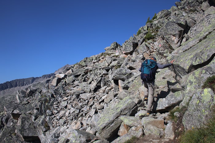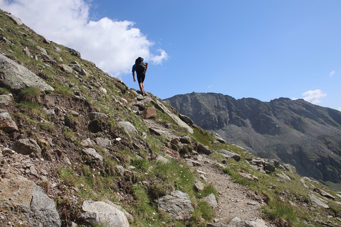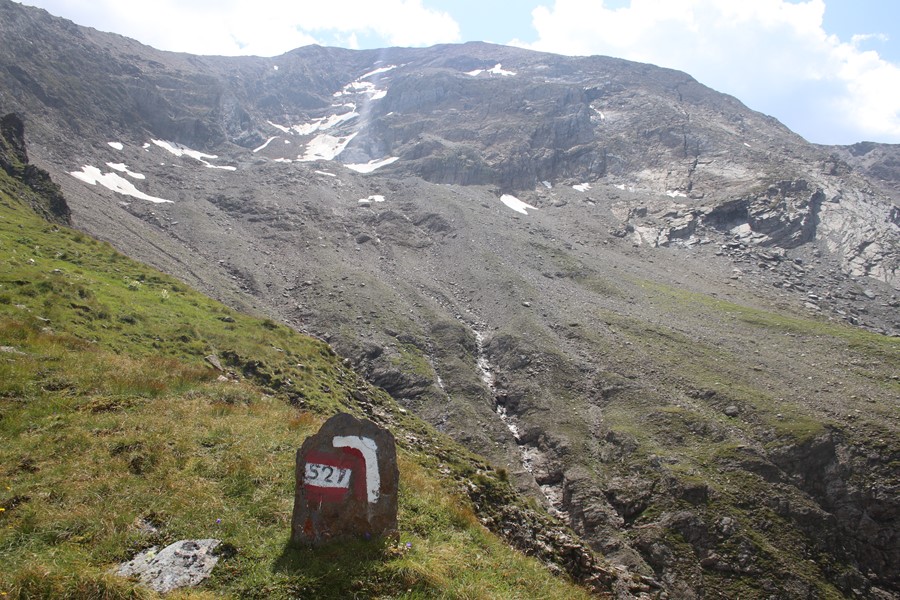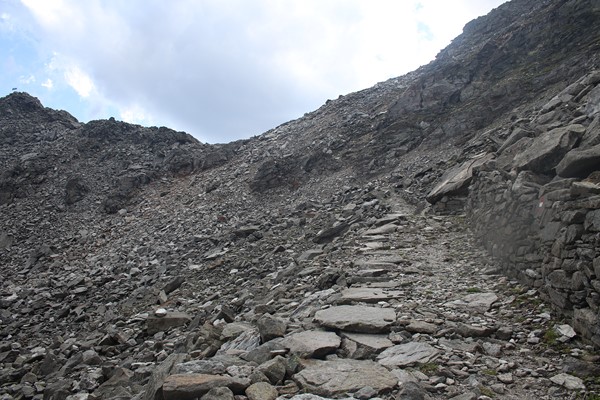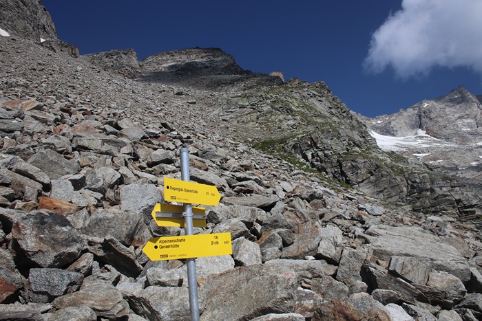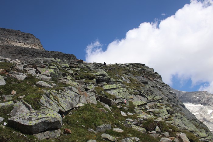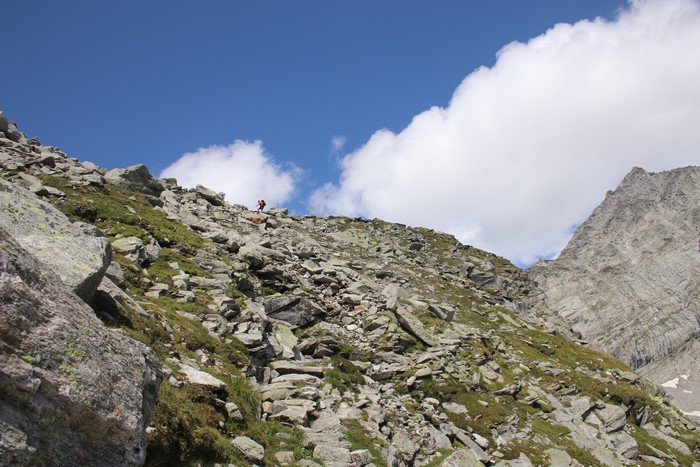 Bodo startet wie üblich im langen Textil. Start über den Wanderweg 502 in Richtung des Pfitscherjoch das Südlich liegt Gehzeit 4 ½ Std. Vorbei an Gackerten Hühner leicht Bergab. Der Riepenbach wird über Steine überschritten. Ein Gelb braunes Expeditionszelt steht an einem perfekten Platz, links am Wegesrand. Ein Blick zu zurück zu dieser mehr als gut besuchten Hütte der Sektion Oberpfalz des DAV. Längere Querung am Hang, eine Mischung aus dem Grau des Fels und Stein im Kontrast zum Satt Grün des Grases, tief unten liegt ruhig der Blaue Speichersee. Leichte Luftbewegung, Wurle geht auf einer guten Wegspur des Neumarkter Höhenwegs voran. Nach 15 Min. steigt es auf gut präpariertem und Markiertem Weg zwischen Steine und Blöcke an. Die Farbe am Stein ist noch Frisch der Lack ist auch für die Verschnupfte Nase wahrnehmbar. Noch ist die Tour vom Dienstag im Blickfeld. Wir achten sehr darauf das Bodo in der Nähe bleibt. Halt an einer Madonnen Madonnen Statue, die den Verunglückten Bergführer gewidmet ist. Eine Mutter die mit ihrem Sohn eine Runde über den Neumarkter Höhenweg begeht, legt eine Pause ein. Groß Möseler Hochfeiler und weitere 2000 und 3000er Bilden die Kulisse das Pfitscherjoch und Hütte verschwinden in Kürze hinter dem Ameiskopf. Der Weg ist aufwendig gepflastert welch Aufwand auch hier bewerkstelligt wurde. Eine Wasserstelle mit frischem kalten Bergwasser am Wegesrand. Ein Gedenkstein für die Verunglückten Bergsteiger und den Wegbauer. Grübeln über den weiteren Wegverlauf, wobei das aktuell unbedeutend ist. Rechts der Olperer 3470 m und Fußstein 3380 m, Links der Schrammacher 3410 m Eine Auffällig Hochfläche das Unterschrammachkar, Abstieg auch mit Seilversicherungen. Nach genau 1 Std. lädt eine Bank zum Rasten ein, kein Thema, nur wenig entfernt wird ein Bach über einen Steg überquert, kurzer Anstieg auf das Unterschrammachkar, Wegteilung von links der Aufstieg vom Speichersee der am Wasserfall vorbei hier kreuzt, diesen gilt es zur Alpeinerscharte zu folgen, damit ist etwas Klarheit geschaffen. Wurle erkennt Westlich Personen, links neben einer Rinne auf Höhe eines Schneefelds. Wie es scheint quert es im Schnee Nördlich. Das Tempo ist Moderat, halt an einem Wasserlauf für eine Trinkpause, meist Trinke ich aus der erwärmten Wasserflasche die mit Multivitamin oder Magnesium bestückt wurde einen kräftigen Schluck, um diese danach neu zu befüllen. In der Mitte der Fläche erneut Wegteilung rechts zur Alpeinerscharte, Geradeaus führt der Höhenweg zum Pfitscherjoch, es sind noch ca.300 m bis zum Berg. Wie aus dem nichts liegen zwei Bergsee am Links der größere mit ca. 50x30m. Das wäre der Ideale Rastplatz im Abstieg. Kurzer Foto Stopp auf 2300 Meter. Noch 650 Hm. trennen bis in die Alpeinerscharte. Gut Markiert der 502. Steil Links der Rinne Aufwärts, ein kühler Wind trotz der Sonne ist es nötig ein Fleece anzulegen, wenn schon der Rucksack vom Rücken ist es ratsam die Sonnenbrille aufzusetzen. Zwei Personen steigen nun Sichtbar auf, Richtig Anstrengend der Puls steigt, Rechts fließt Schmelzwasser, beruhigend das Plätschern. Wurle steigt ein wenig ab, hier im Schnee ist die Querung! Just jetzt steigen 3 Sportliche Männer ab, Wurle tauscht sich mit wenigen Worten aus, sie queren kurz vor unsere Ankunft den Schnee. Tief Ausgespült die Rinne lose die beiden Flanken, der Altschnee ca. ca. 15 Meter, gut zu gehen wohl vorsichtig ein Fehler nicht Empfehlenswert. Nördliche Querung neben einem Rinnsal leicht ausgesetzt auf eine Rampe. Ein letztes Mal sehen wir drei flotten Jungs. Die Scharte selber nicht sichtbar, der Zustieg Steil wohl im Schotter. Halt an einem Natürlichen Unterstand, es scheint von Menschenhand wurde der Fels ausgehöhlt. Eine Stange mit Weg Tafel liegt hier. Ein Interessanter Fels Circus deutlich über den Erwartungen für diesen Tag. Ein noch kleiner Gletscher unter dem Olperer, die Moräne lässt die einstige Größe erahnen. Anstieg zu einer Felswand schaut Spannend aus unterhalb zu passieren. Der Tiefenblick nimmt zu, ein schmaler Weg verläuft an der fast Senkrechten Wand, zum Ende der 100 m Querung mit Seilversicherung. Danach steigt es gepflastert im Blockwerk an. Wolken mehren sich. Wegteilung Links Geraer 2 ½ Std. Scharte 1 Std. der Abstieg ist nun um eine halbe Std. angestiegen, gerade aus (W) über den Riepengrat zur Olperer Hütte 2 Std. 2 Personen sind zwischen Blöcke im Aufstieg auf einen auffälligen Felskopf mit deutlich erkennbaren Steinmann zu sehen, dürften ca. 15 Min voraus sein, rechts davon stürzt das Gelände jäh ab. Zeitlich sind wir in der Vorgabe. Wie es scheint reine Geherei. 12 Minuten später eine Gelbe Hinweistafel die Zeit verkürzt sich gleich um 30 Minuten. Kleine Pause auf diesem „ Felskopf“ Bodo ist etwas zurück gefallen. Der Wegverlauf vom Unterschrammachkar ist weitgehendst Sichtbar. Der komplette Anstieg in diesem Trichter zur Scharte führt durch Blöcke, dadurch ist der Weg nicht sichtbar. Gut Markiert und Begehbar nähern uns einem Paar stetig, innerlich ist das Ziel klar, noch vor den beiden in die Scharte.