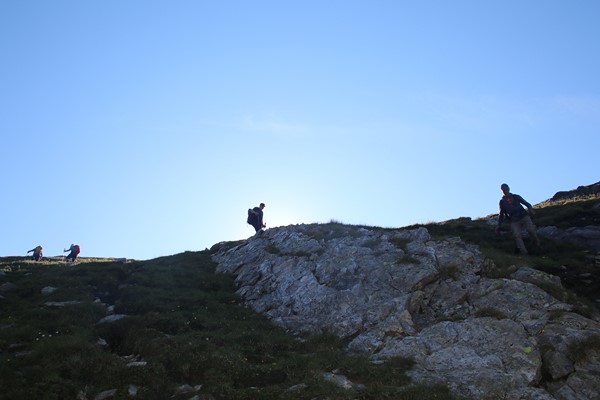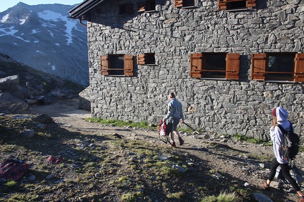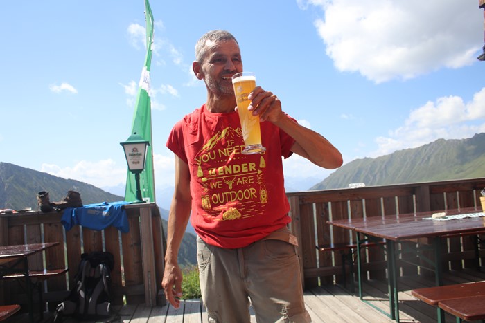 Sonntag 15.August:. Der Toilettengang in der Nacht bleibt in Erinnerung, ohne Taschenlampe über die Außen Treppe ein Etage tiefer zwar Aufwendig doch easy. Wetterleuchten eines Abziehenden Wärme Gewitters erhellten die Nacht. Sehr früh starteten die ersten ,wollten wohl das Frühstück um 6.30 Uhr, einnehmen. 7.30 Uhr, Bodo flickt in Schneiders Manier seine Hinterteil der in die Jahre gekommenen Touren Hose mit Nadel und Zwirn. Die Nase ist wie Täglich verstopft, Grüner Schleim, zum Verzweifeln. Gutes Internet, ein Blick aus dem Fenster bestätigt die Annahme, Stahl Blauer Himmel wobei die Hütte noch im Schatten liegt. Ein Stock tiefer werden die Zähne geputzt. Die Außentemperatur bestens keine Sonderliche Abkühlung. Das Gepäck wird gleich aufgenommen. Das Gepäck wird im Schuhraum Deponiert. Ruhig ist es geworden, in der Netten Gemütlichen Hütte. Wurle sitzt mit dem Sympathischen Ehepaar am gleichen Tisch wie am Abend. Das Teewasser steht schon am Tisch. Kein Zucker steht bereit. Frage in der Küche nach, der Chef fühlt sich sofort angesprochen, Laut und Tief, Nein es gibt keinen Zucker zum Teewasser! Ebenso Unfreundlich ein Spontanes, Danke für diesen Abschluss des Aufenthalts! Das Ehepaar bedankt sich für all die Informationen auch im Zusammenhang mit Corona. Etwas Brot und Wurst klein aber Fein das Vesper. Nützen die Zeit für Persönliches, Bodo Arbeitet am Handy, Notiere in kurzen Sätzen das Geschehen. Etwas Enttäuschung ist unverkennbar, scheitert es an etwas Zucker. Viele Interessante Nachrichten über Telegram trudeln ein. Letzter Austausch vor der Hütte mit den Dresdnern.
